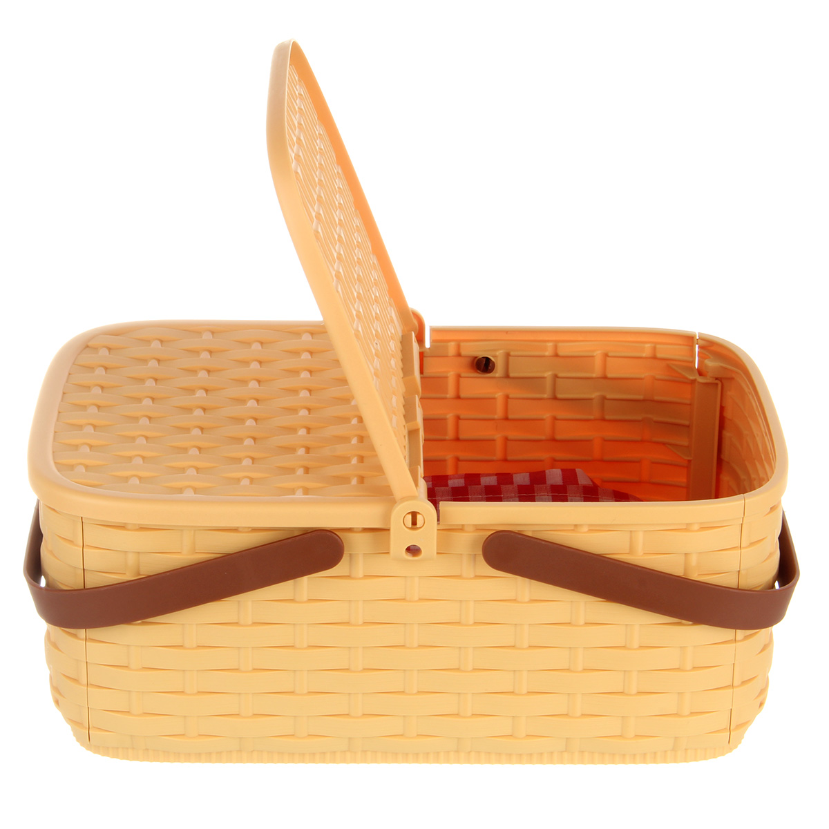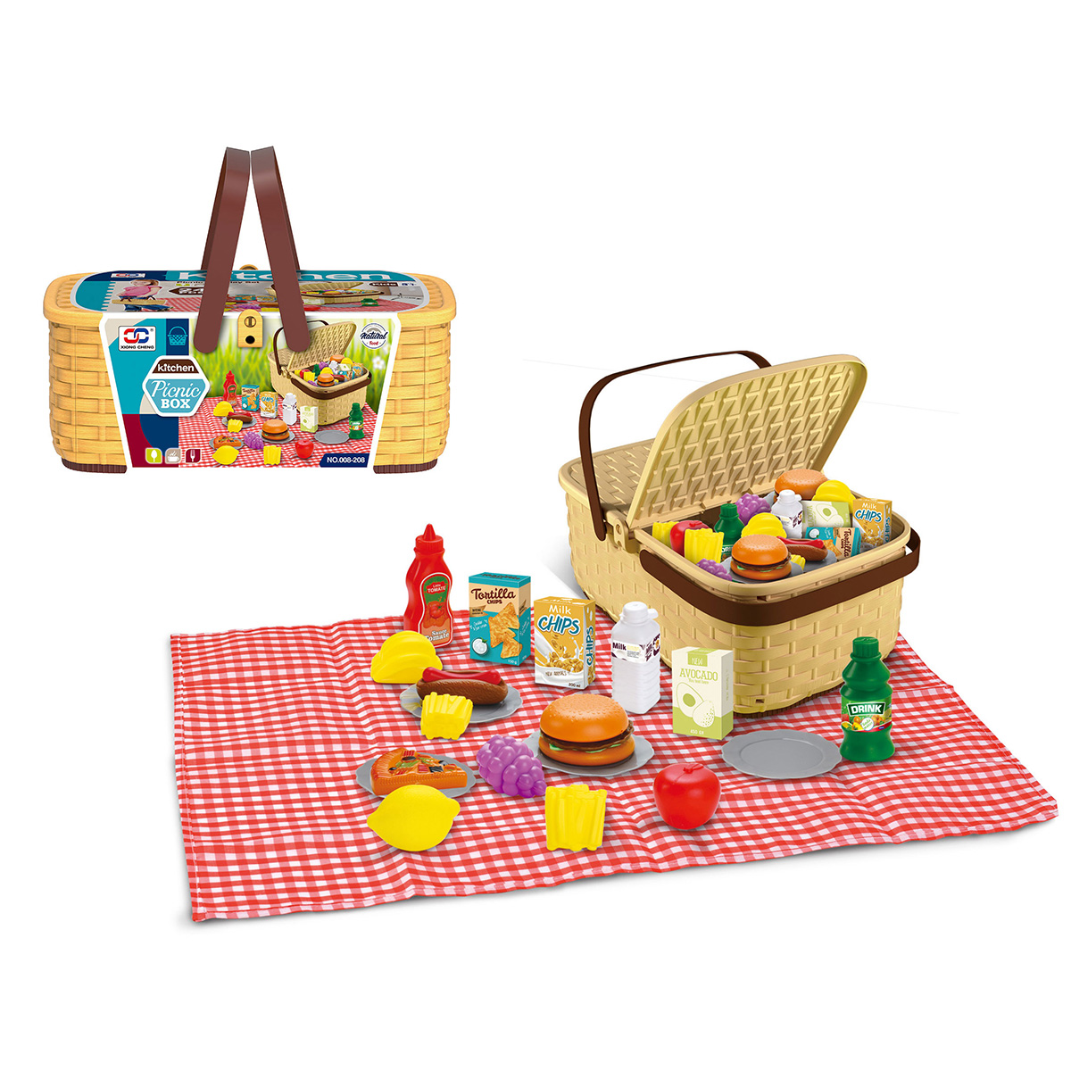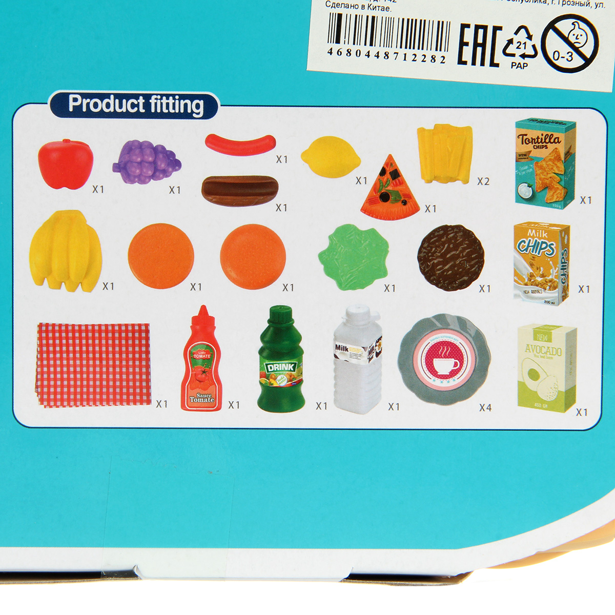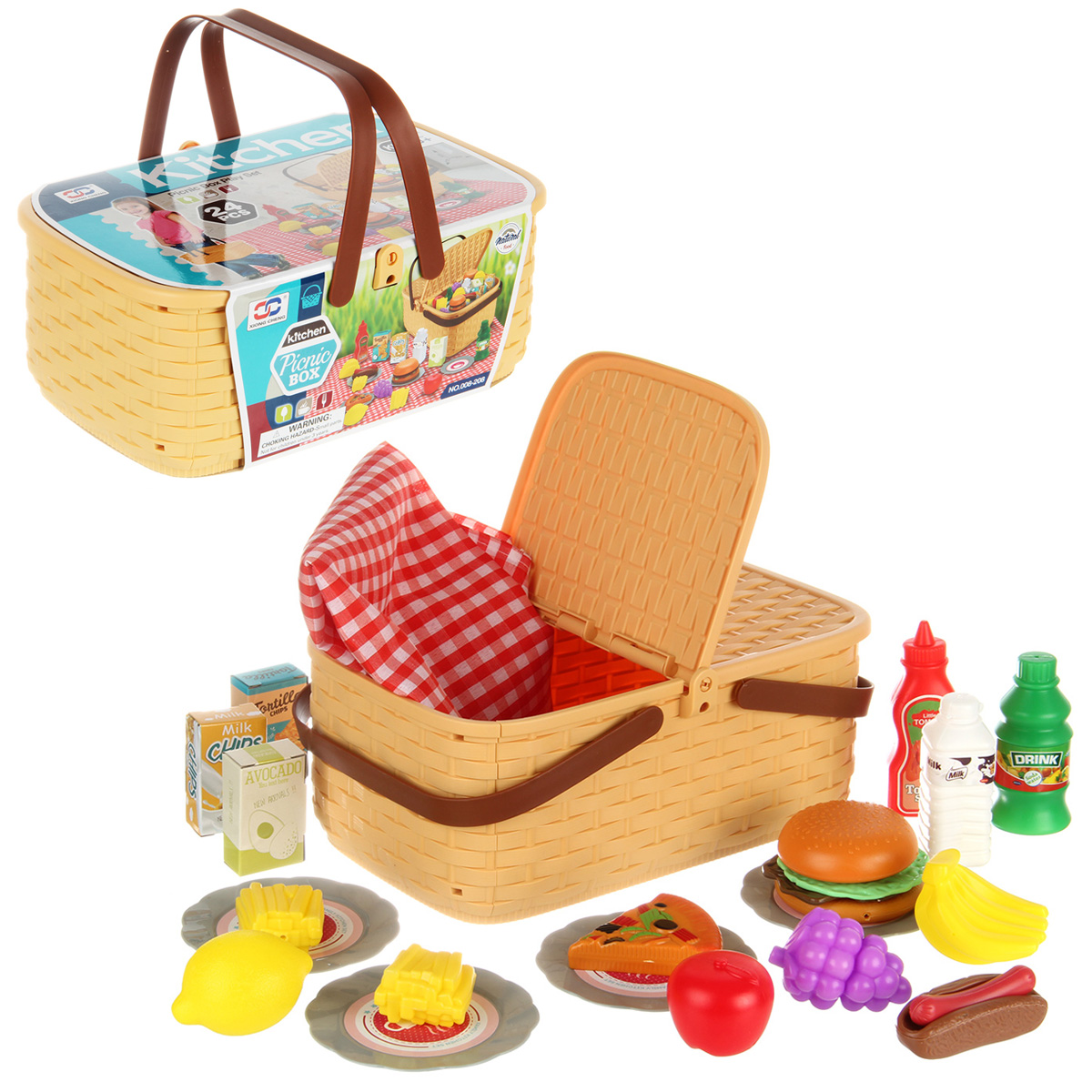 Упаковка корзинка, скатерть, 4 тарелки, 2 бутылки имитации напитков, 1 бутылка имитации кетчупа, 3 коробки имитации сыпучих продуктов, 12 продуктов.