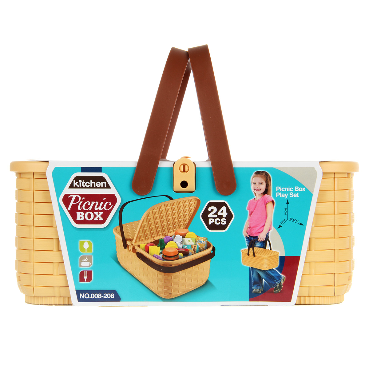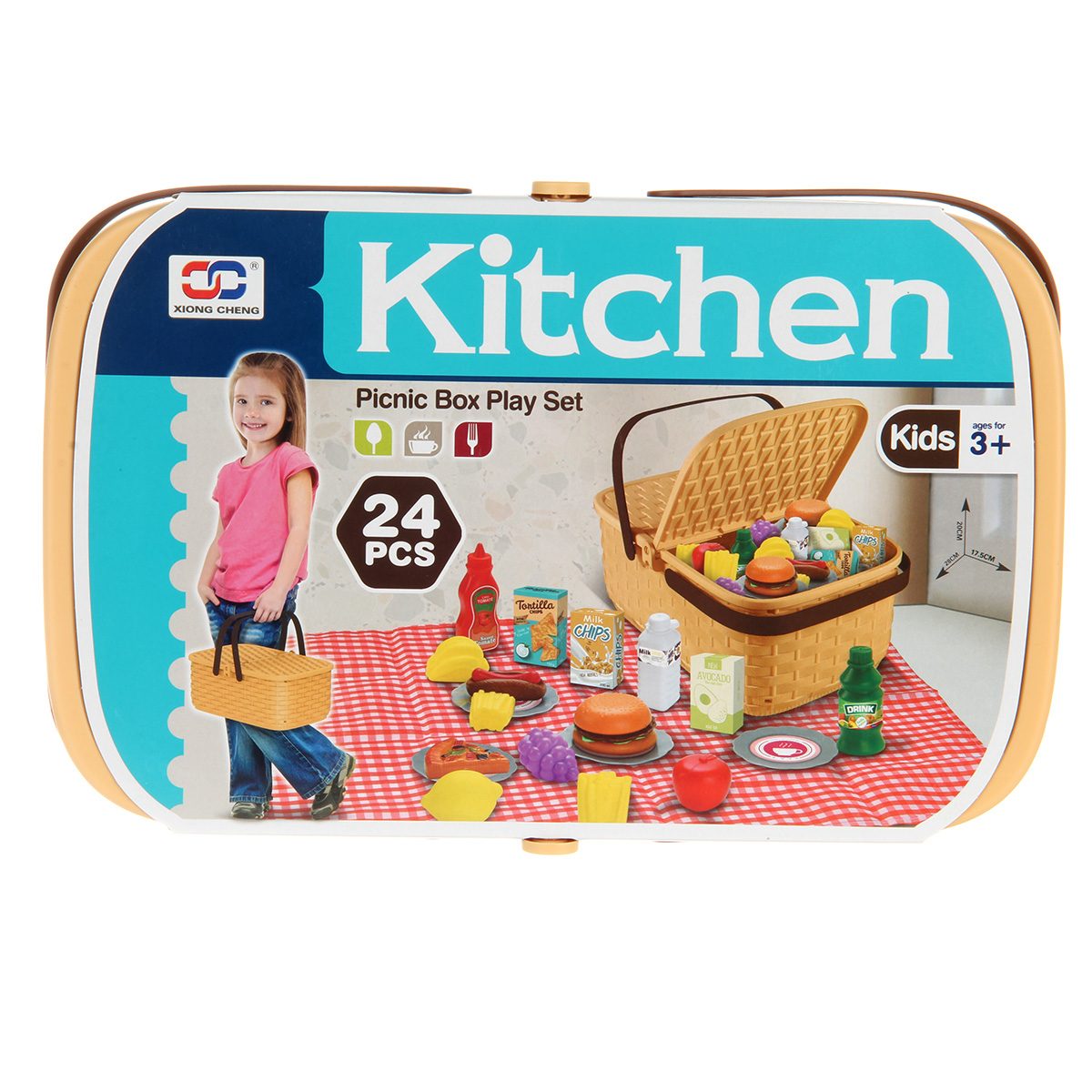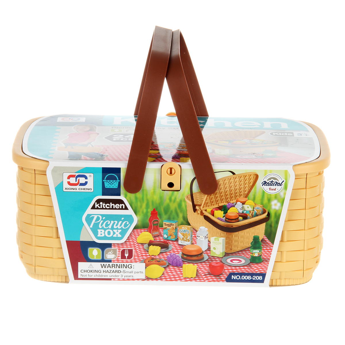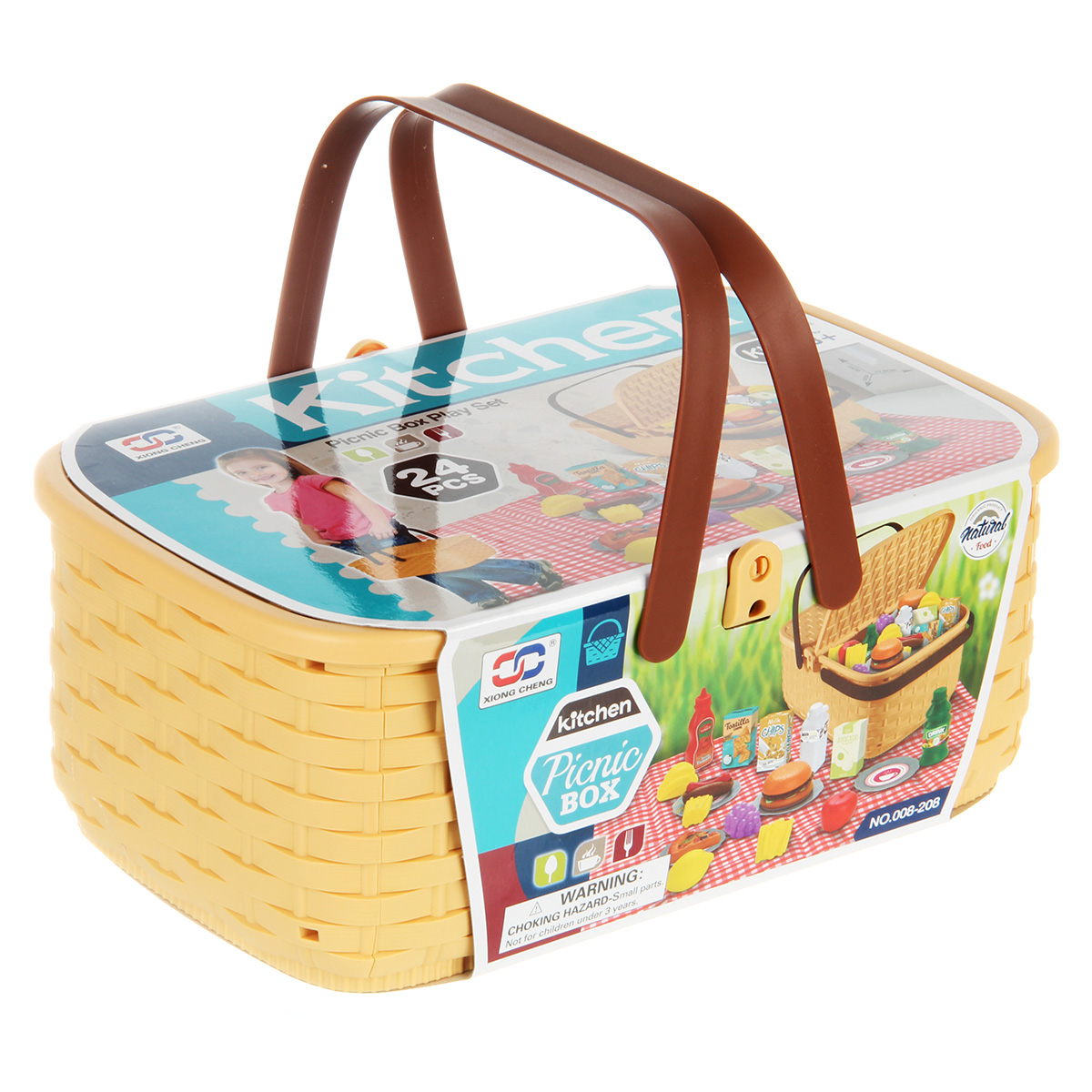 Упаковка корзинка, скатерть, 4 тарелки, 2 бутылки имитации напитков, 1 бутылка имитации кетчупа, 3 коробки имитации сыпучих продуктов, 12 продуктов.
