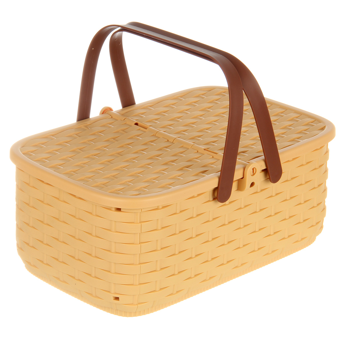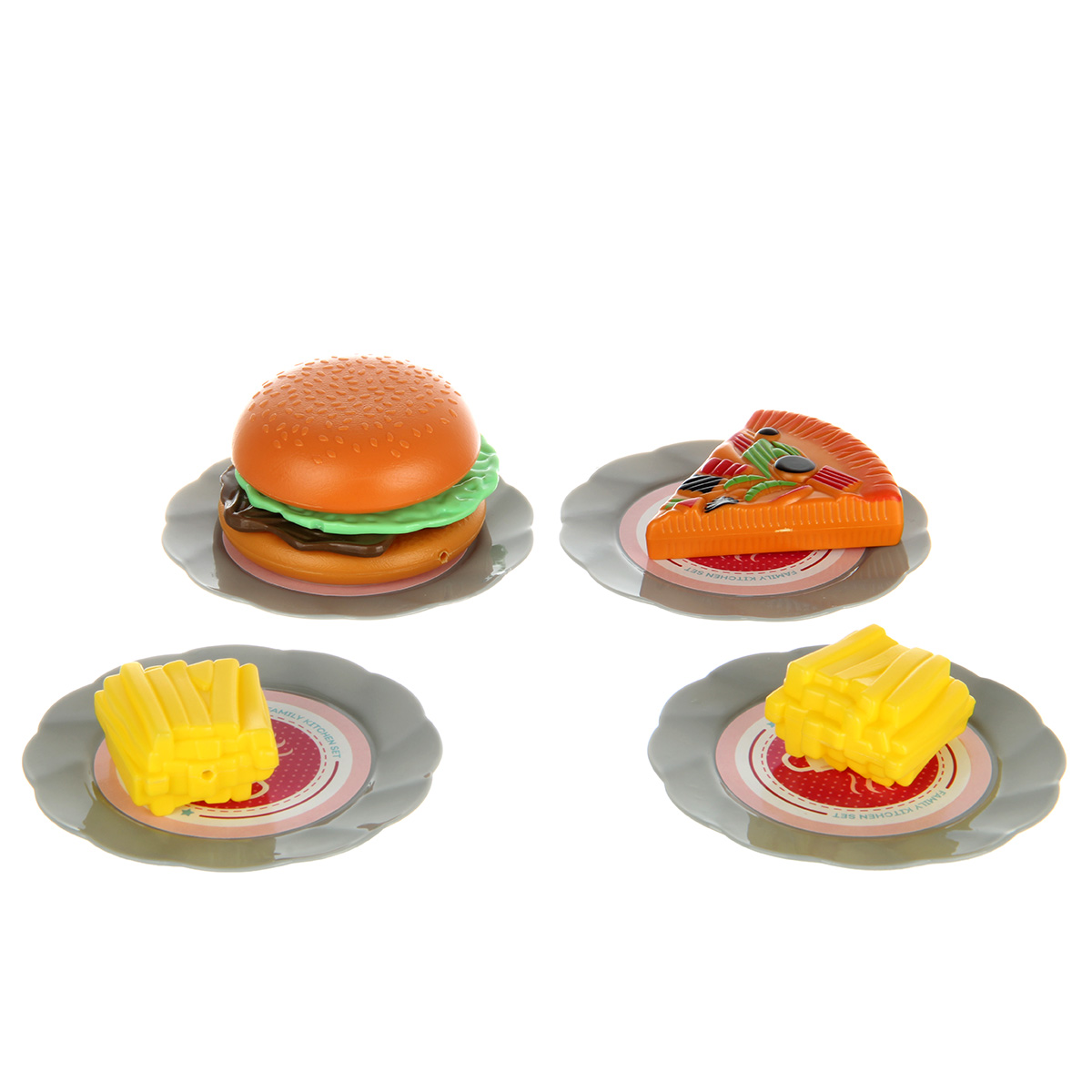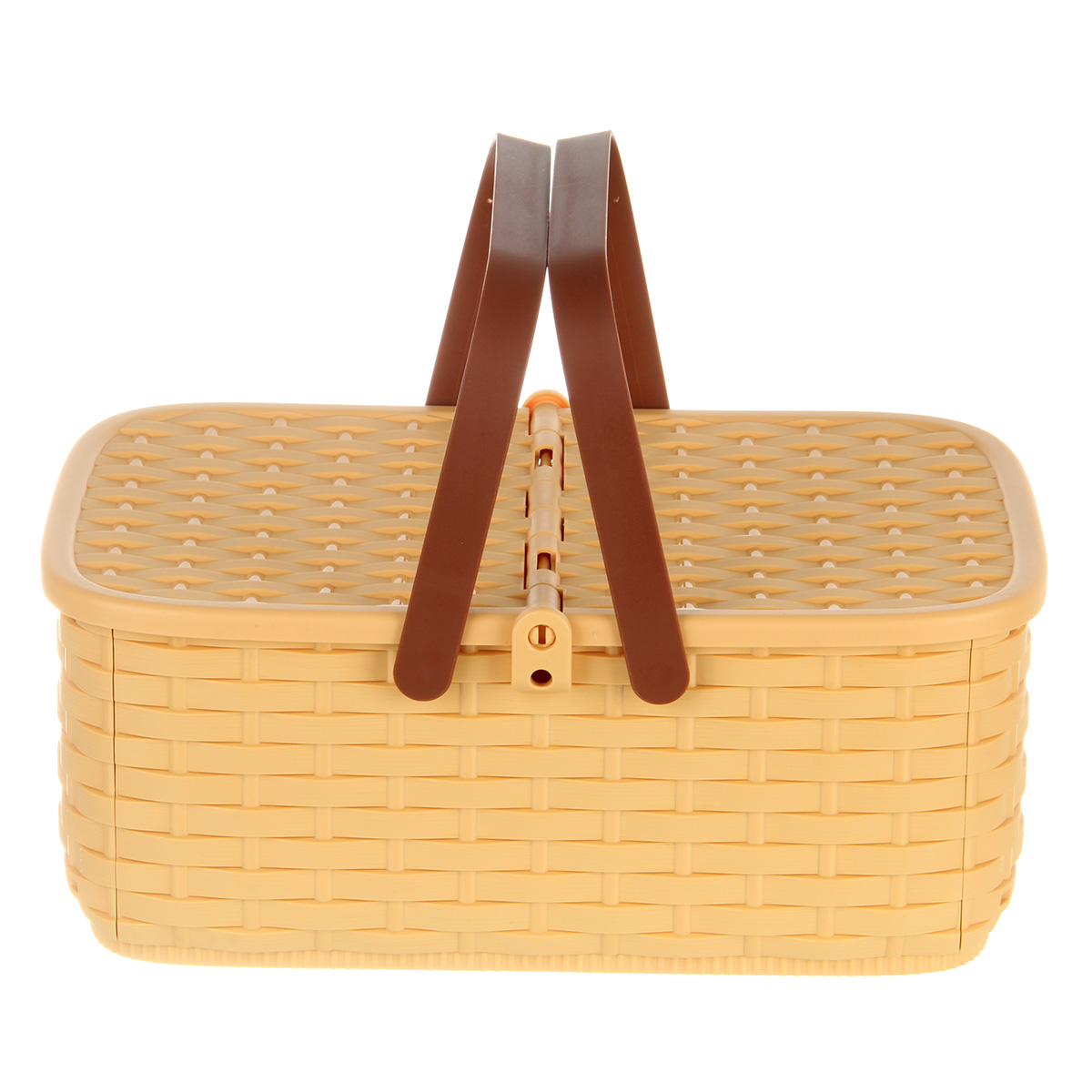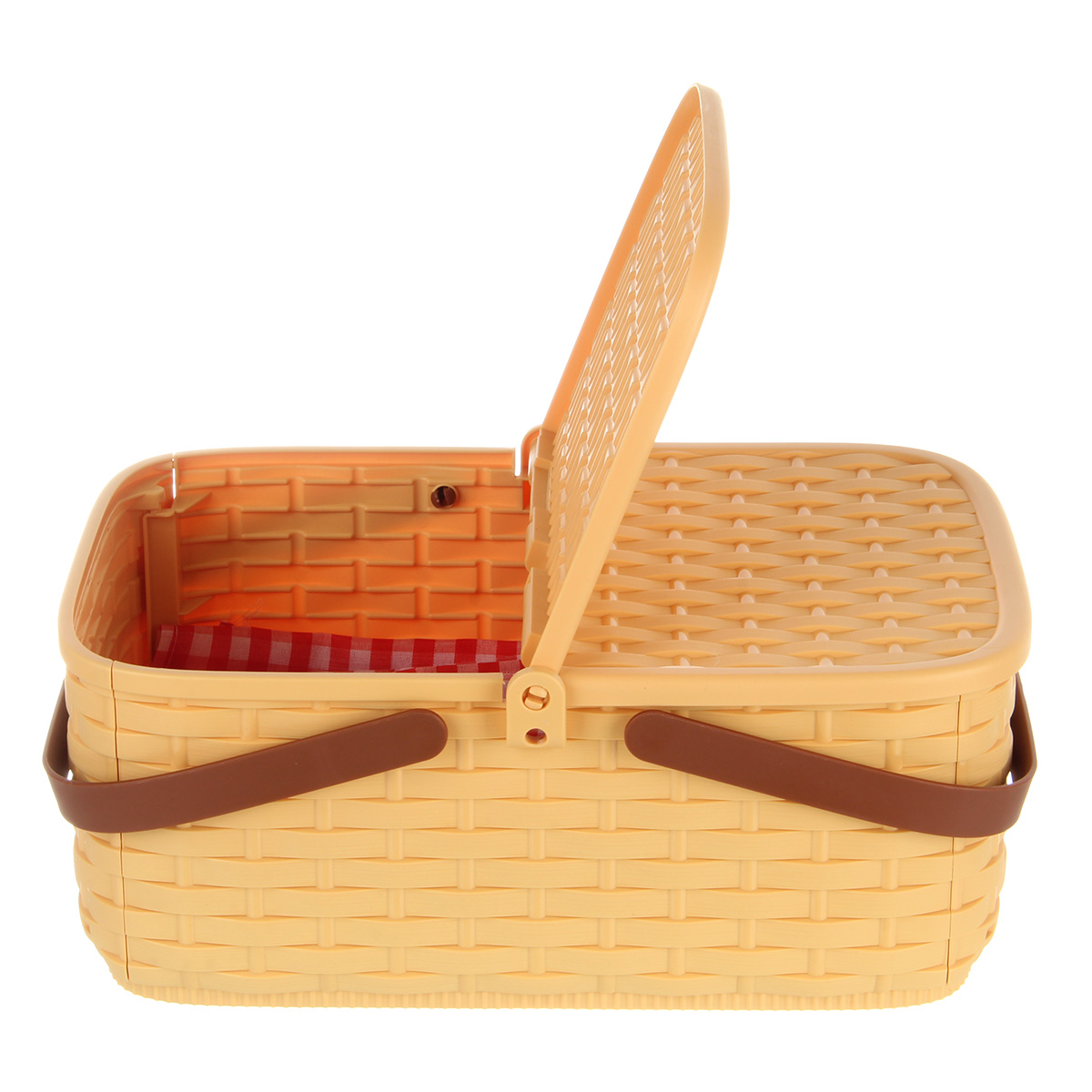 Упаковка корзинка, скатерть, 4 тарелки, 2 бутылки имитации напитков, 1 бутылка имитации кетчупа, 3 коробки имитации сыпучих продуктов, 12 продуктов.