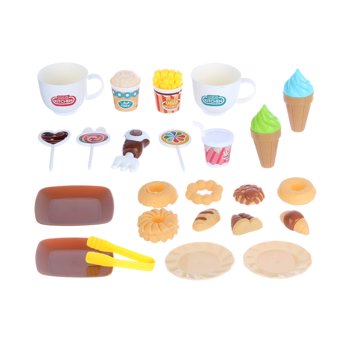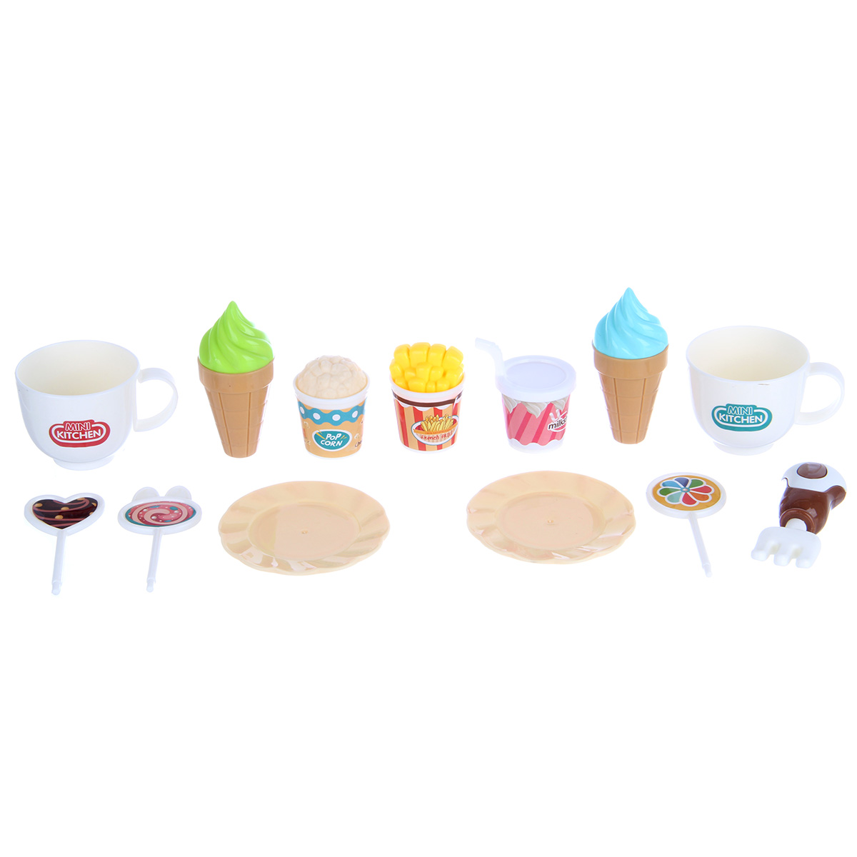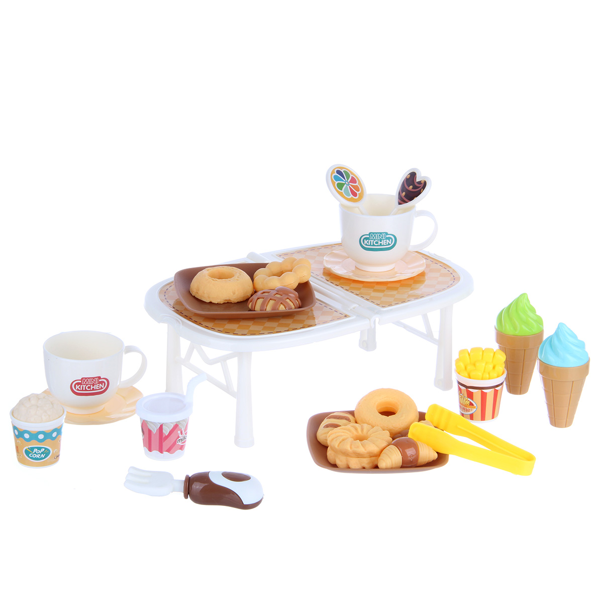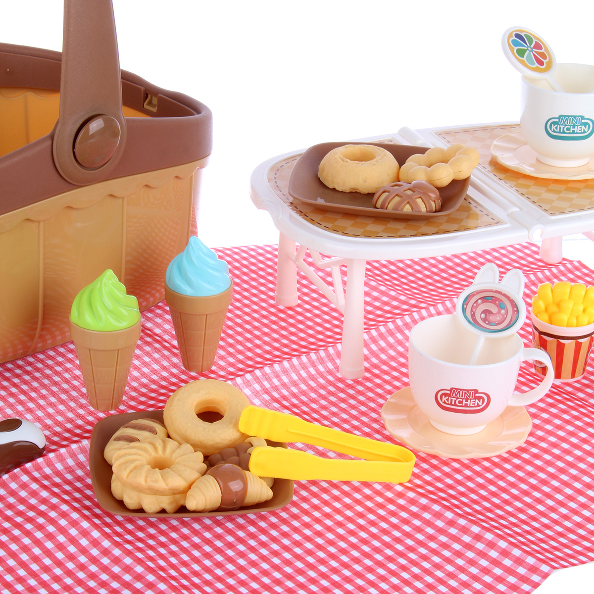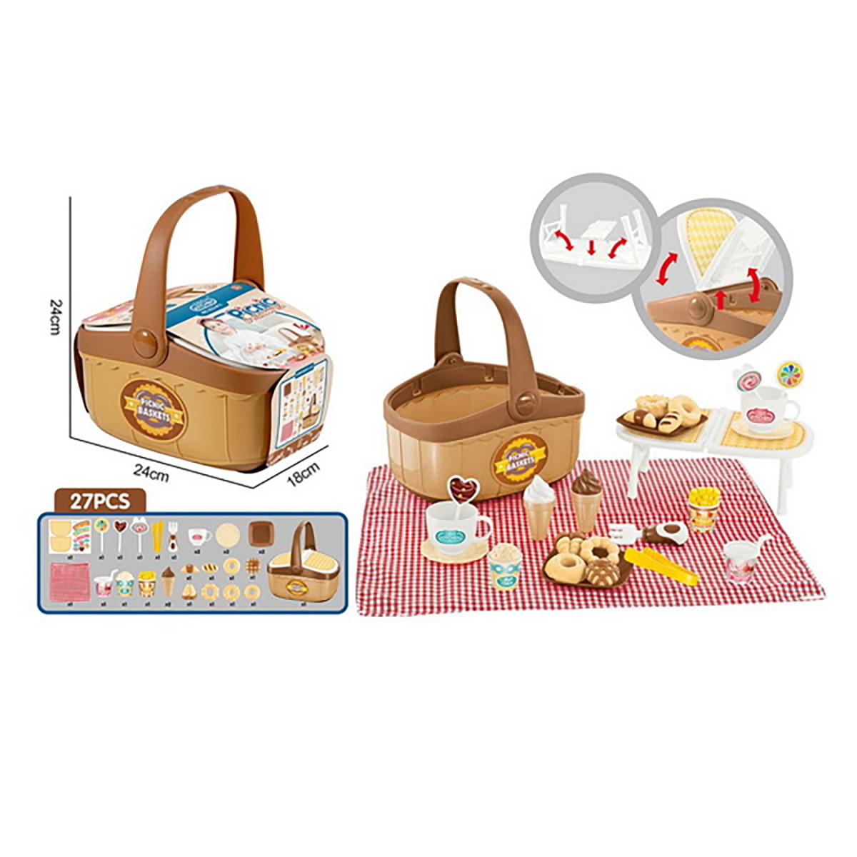 Упаковка корзина, скатерть, 2 чашки, 2 тарелки, 2 подноса, вилка, 3 детали для сборки маленького столика, стакан с попкорном, стакан с картофелем фри, 2 мороженых в стаканчике, 3 леденца на палочках, кухонные щипцы, 8 фигурок выпечки, стакан милкшейка, набор наклеек.
