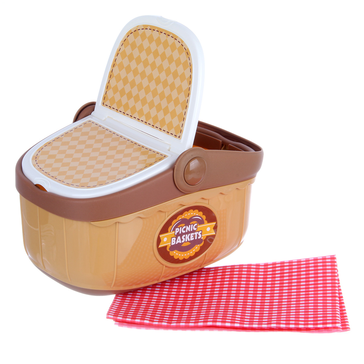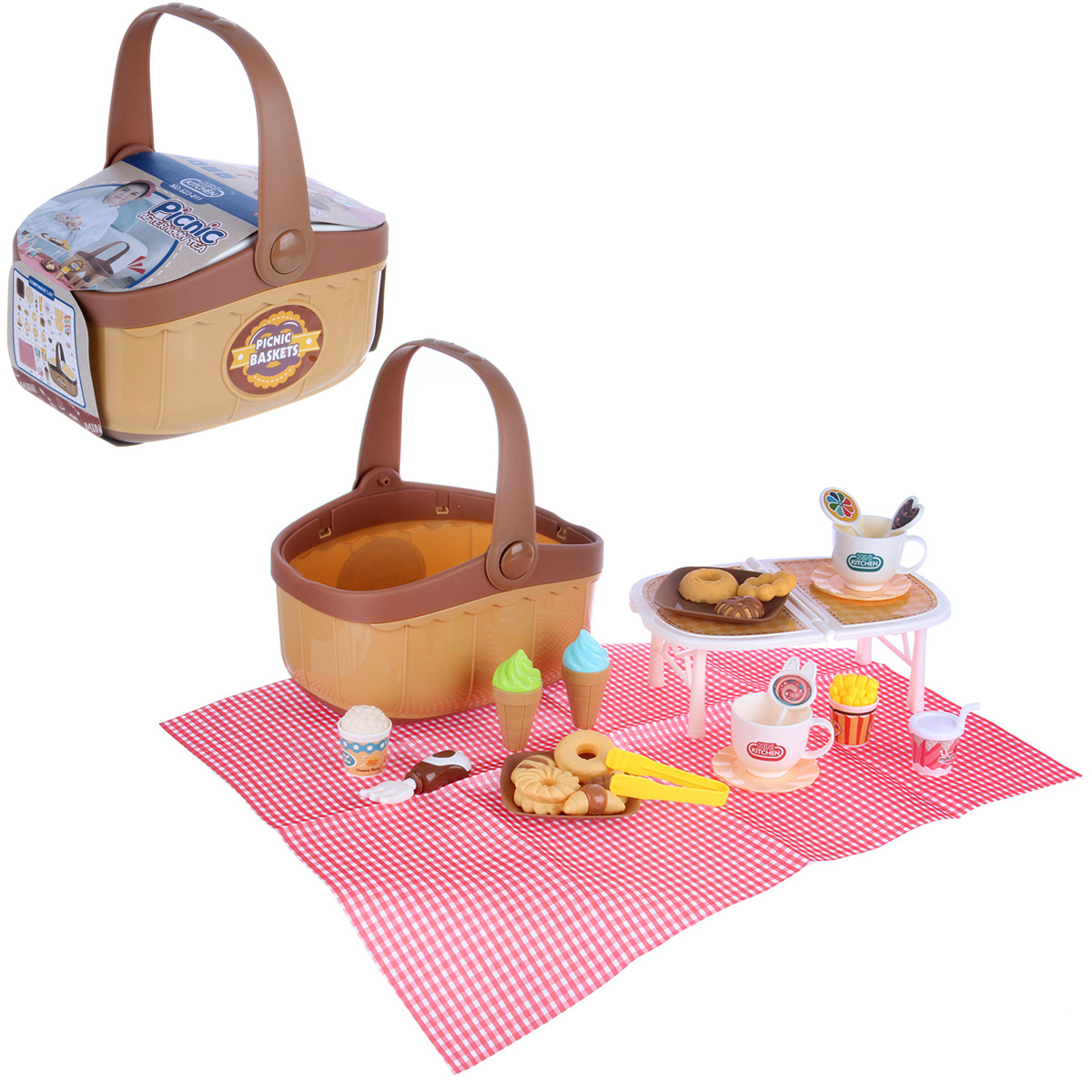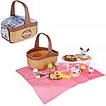 Игрушечный набор для пикника с большим количеством аксессуаров в компактной корзине. Картофель фри, поп корн и мороженое вынимаются из стаканчиков, съемная крышка у стакана милкшейка, выпечку можно разделить на 2 части, у щипцов сходятся ручки, удобно захватывать фигурки десерта с помощью щипцов и перемещать их, текстильная скатерть в комплекте. Крышка корзины раскладывается в компактный столик. В корзину можно сложить все аксессуары, удобно держать за ручку, можно брать с собой на прогулку, в гости. Игровой набор изготовлен из прочных и долговечных материалов в качественном исполнении.