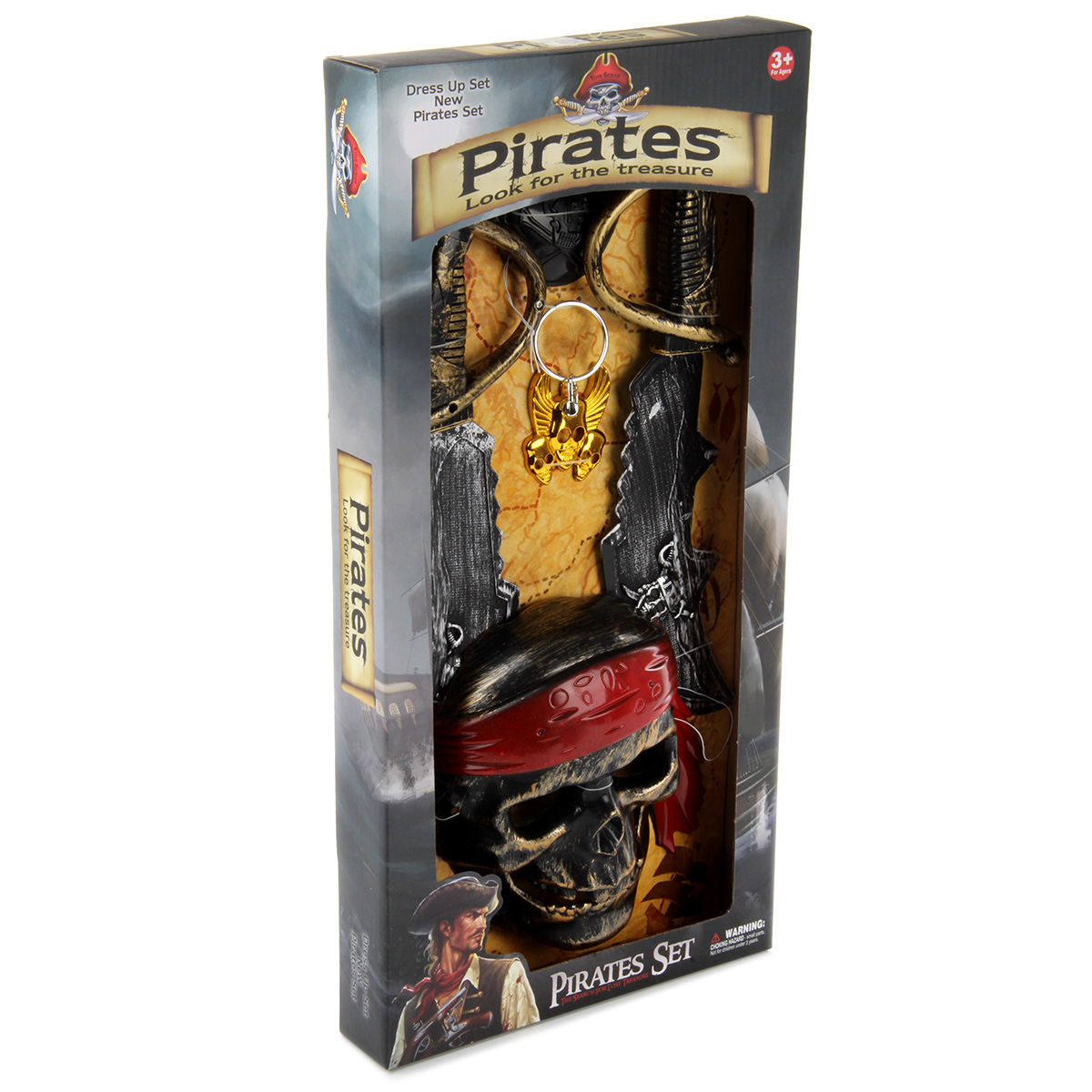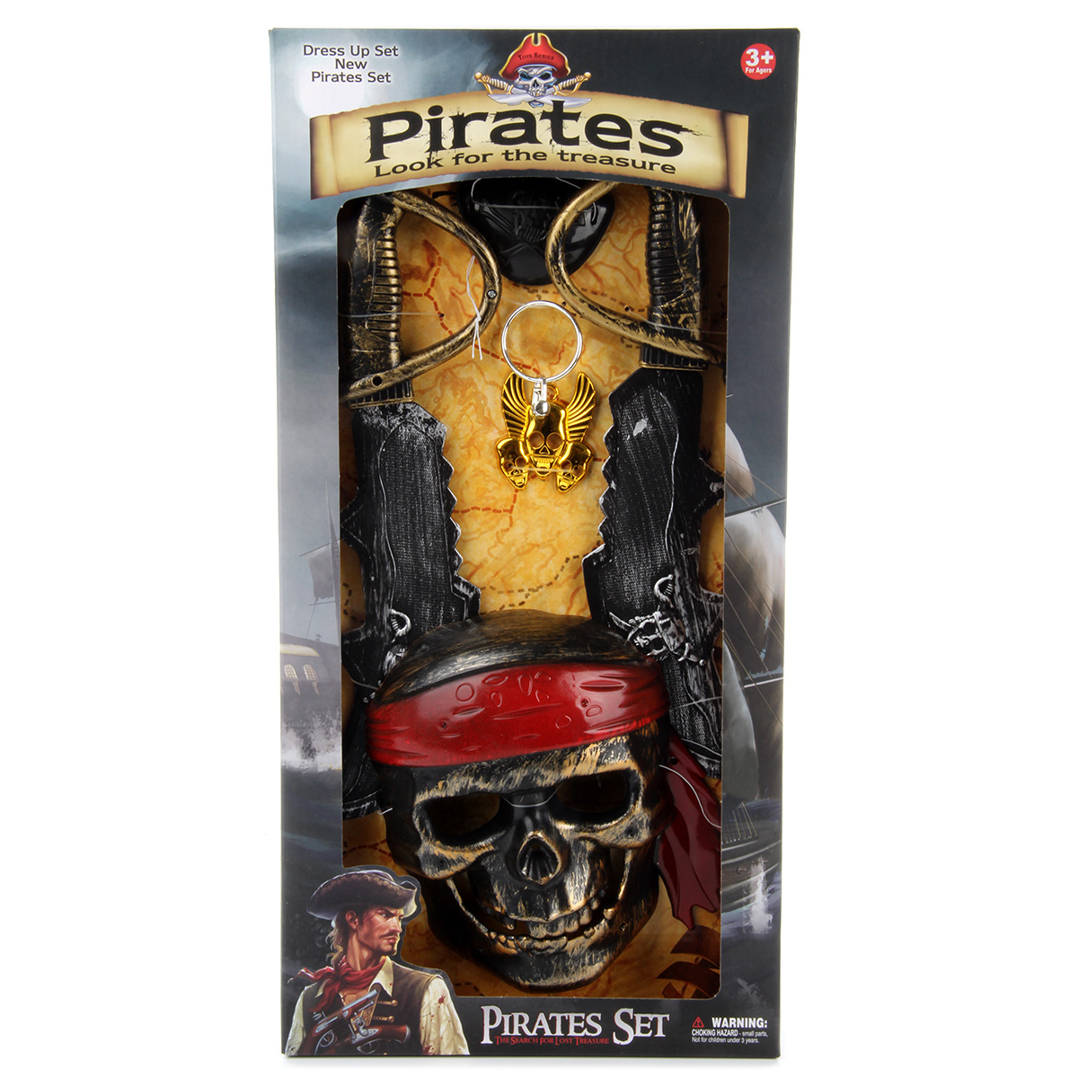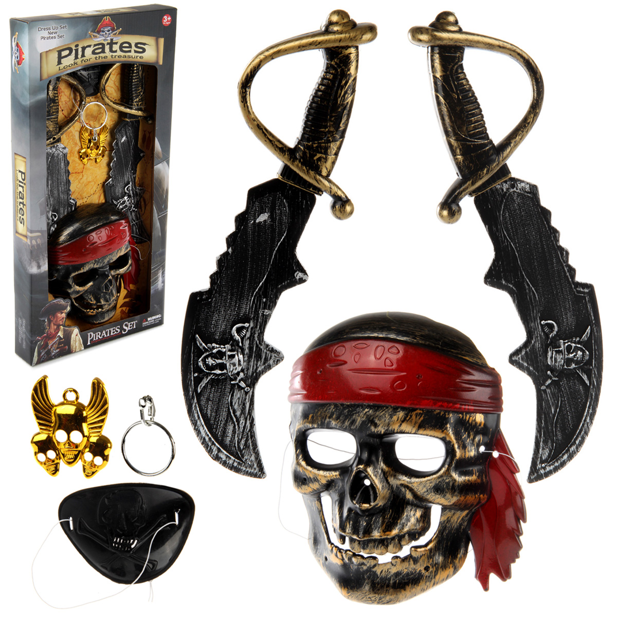 Пиратский набор для тематических игр. В комплект входит маска, 2 сабли, повязка, кулон, серьга. Функционал игрушки: -маска фиксируется на лице; -повязка фиксируется на глазу; -серьга фиксируется на ухе. Размеры упаковки: 51*25*5 см. Размеры сабли: 34*11*4 см. Размеры маски: 19*13*5 см. Размеры серьги: 6*4*1 см. Размеры кулона: 6*5 см. Изготовлено из пластика.