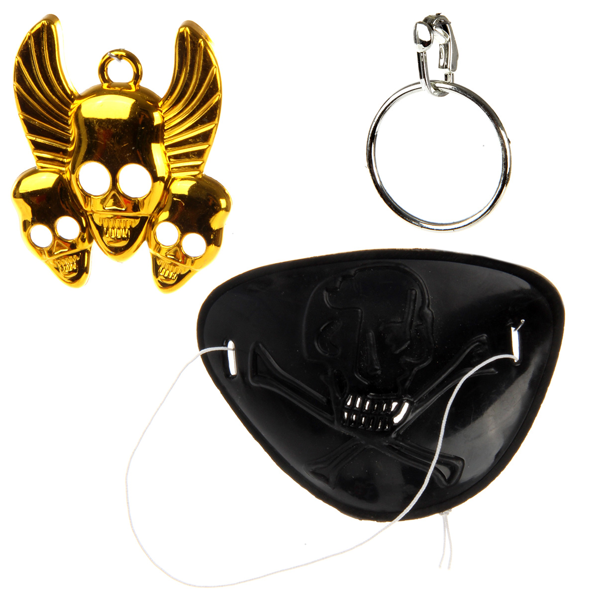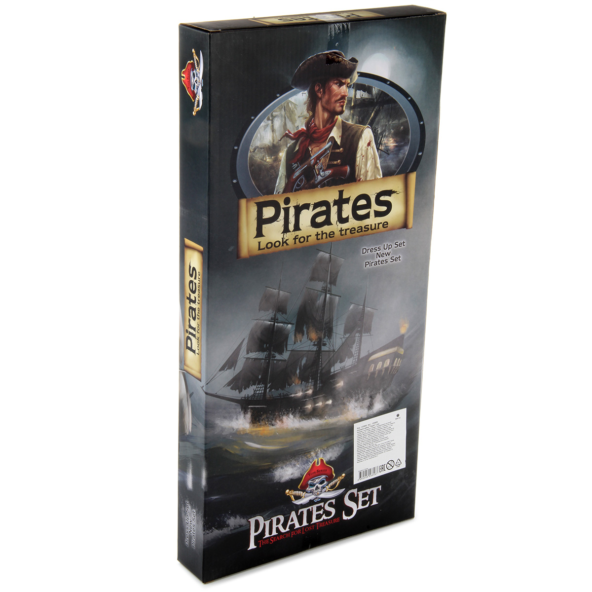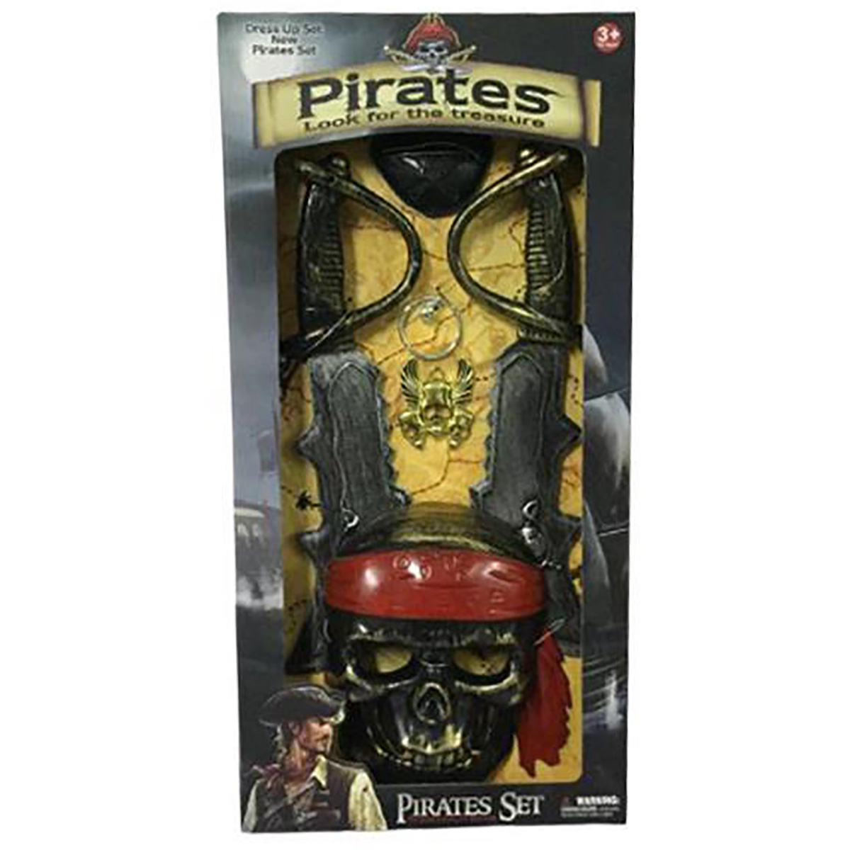 Пиратский набор для тематических игр. В комплект входит маска, 2 сабли, повязка, кулон, серьга. Функционал игрушки: -маска фиксируется на лице; -повязка фиксируется на глазу; -серьга фиксируется на ухе. Размеры упаковки: 51*25*5 см. Размеры сабли: 34*11*4 см. Размеры маски: 19*13*5 см. Размеры серьги: 6*4*1 см. Размеры кулона: 6*5 см. Изготовлено из пластика.