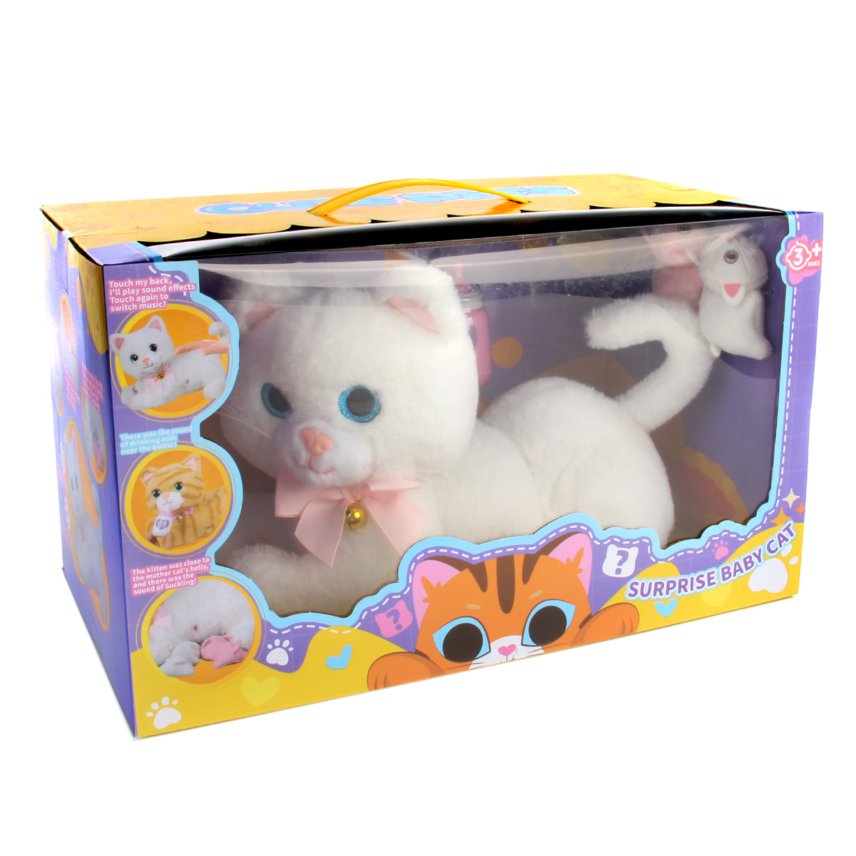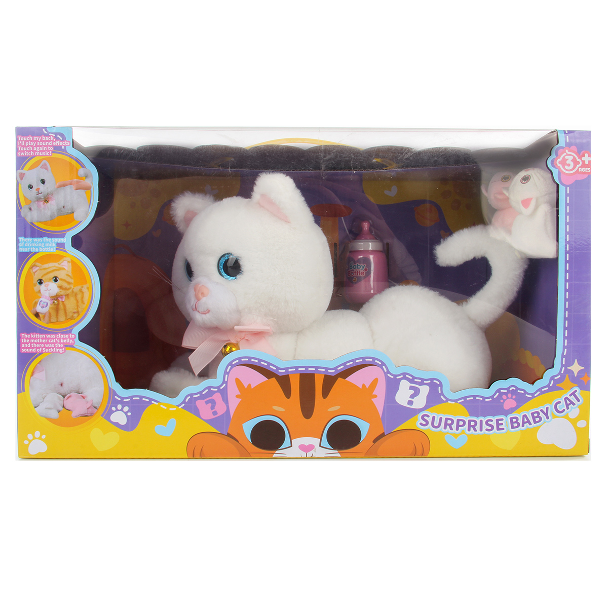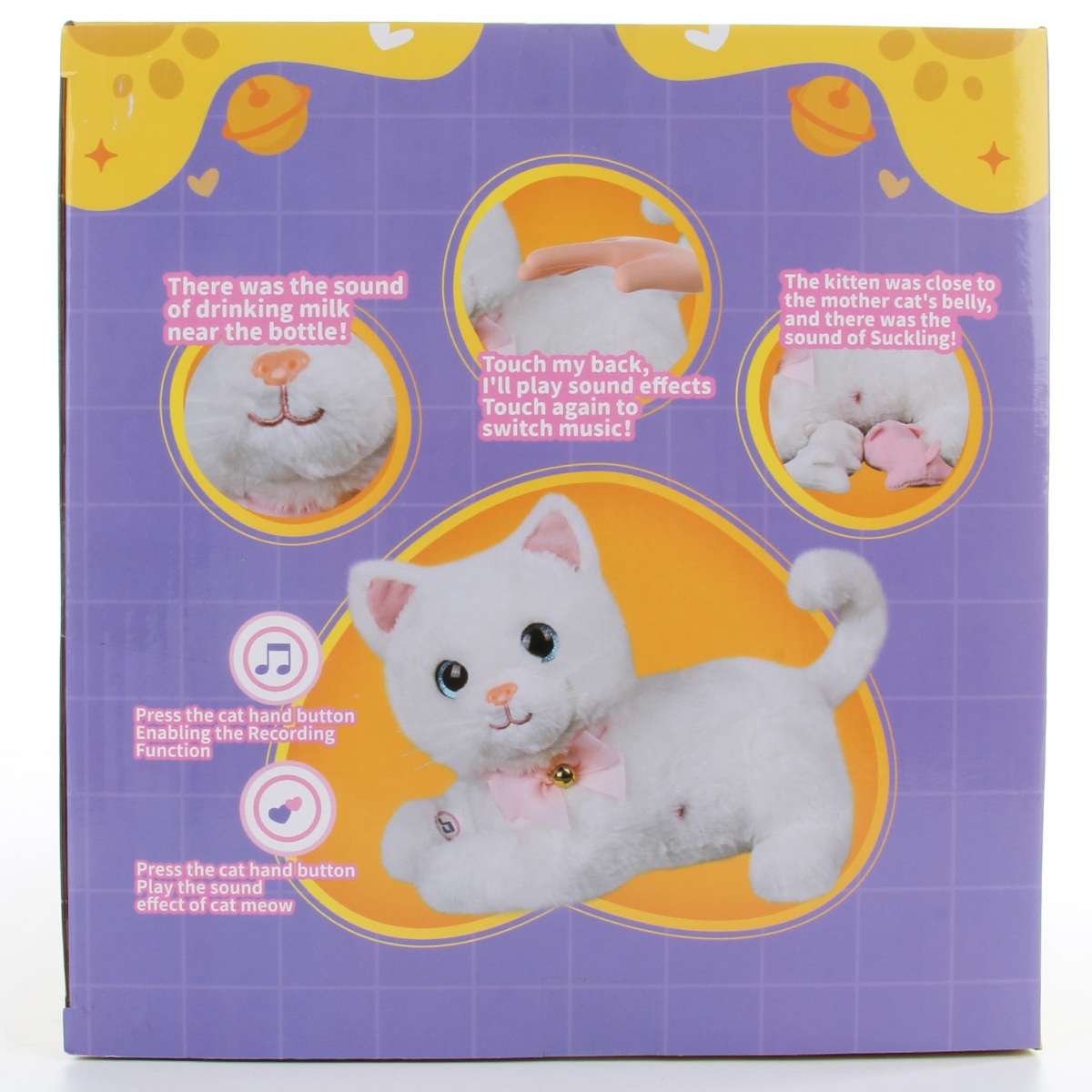 1. При поглаживании спинки издает мяуканье, мурчание, при повторном поглаживании проигрывает 2 песни, С днем рождения и др, проигрывает колыбельную. Переключение песни и звукового эффекта, повторное поглаживание спинки.
