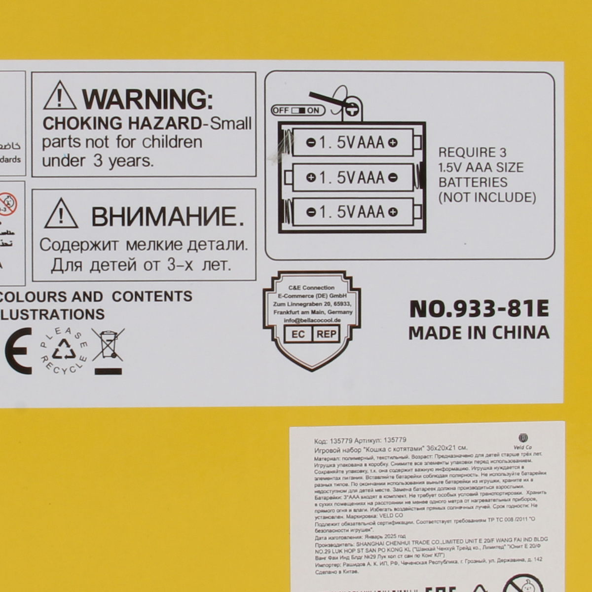Кошка работает от 3 батареек ААА, не входят в комплект. Батарейки вставляются в отсек в области животика.