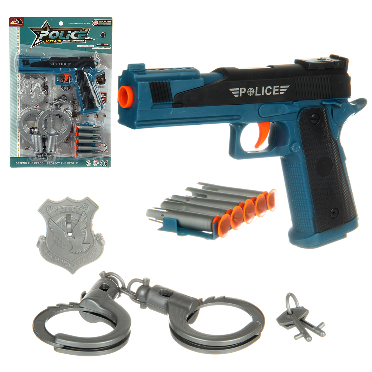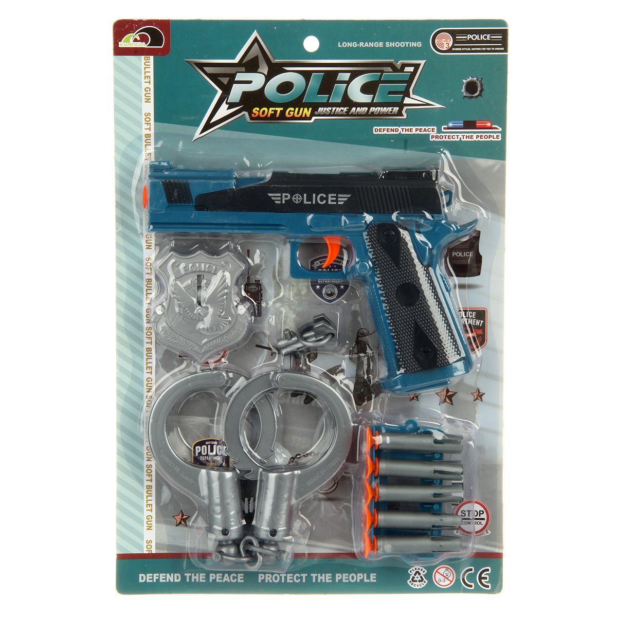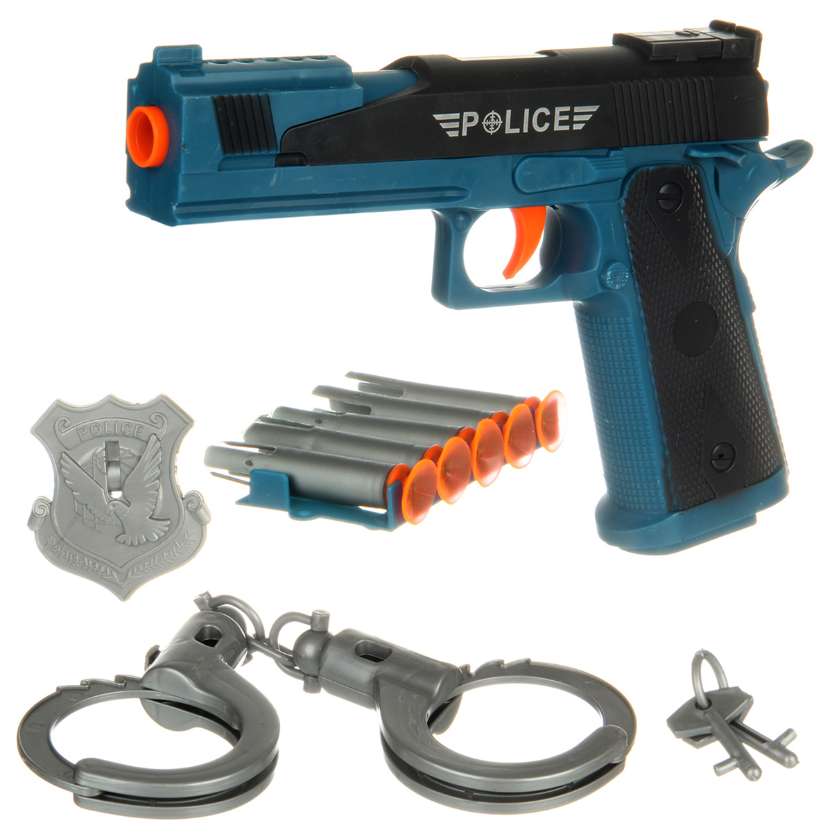 В комплекте игрушка пистолет, наручники, жетон, магазин с 5 патронами, связка ключей.