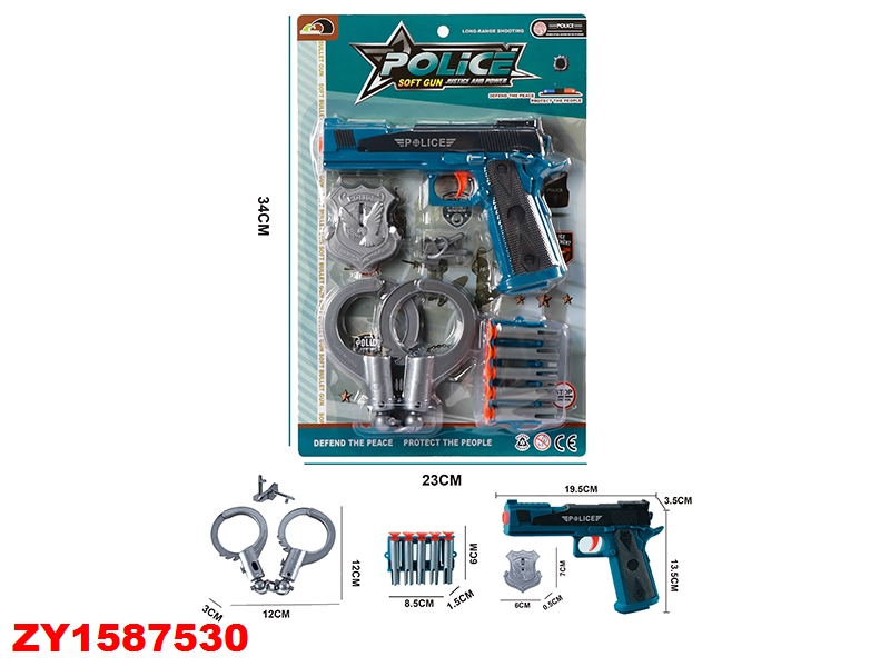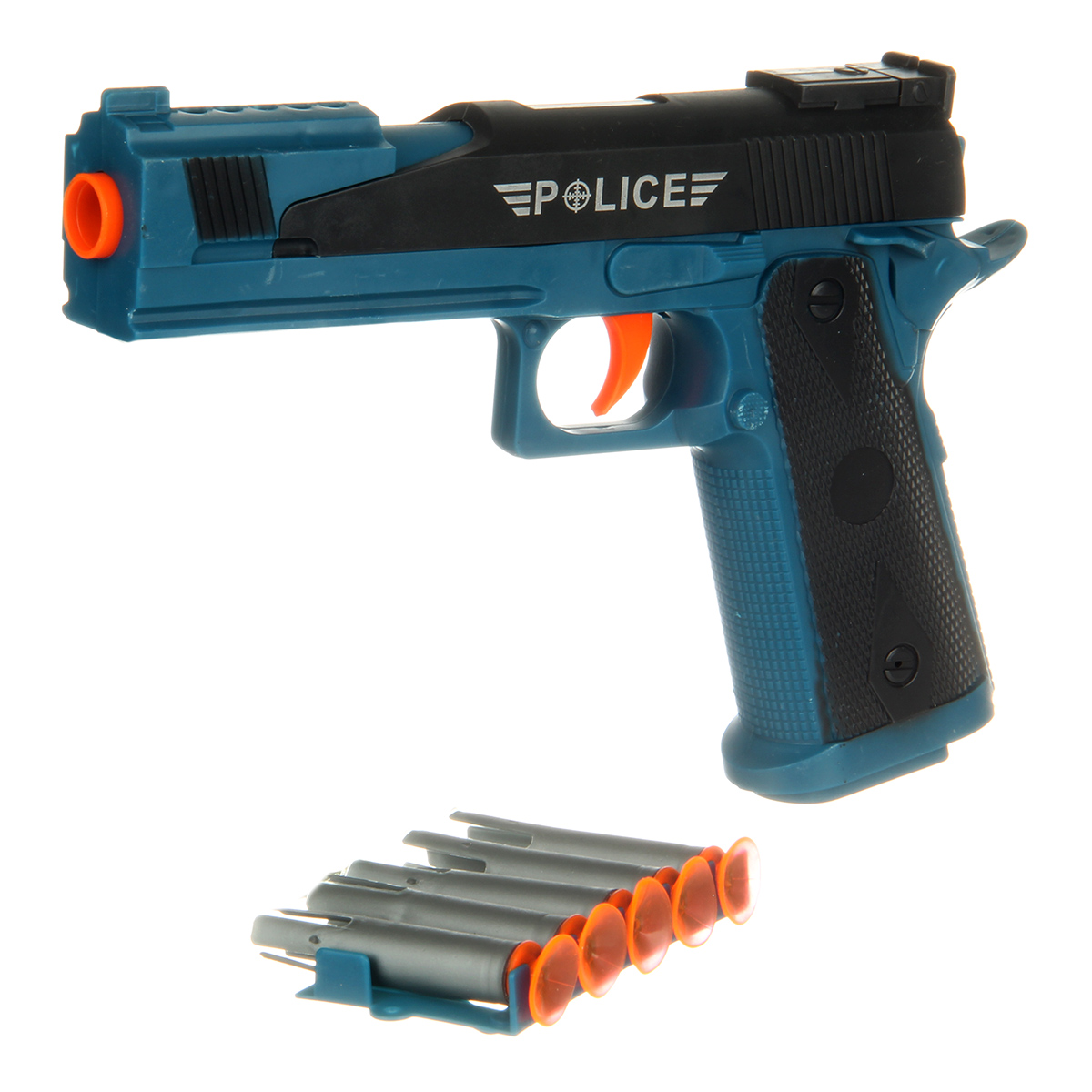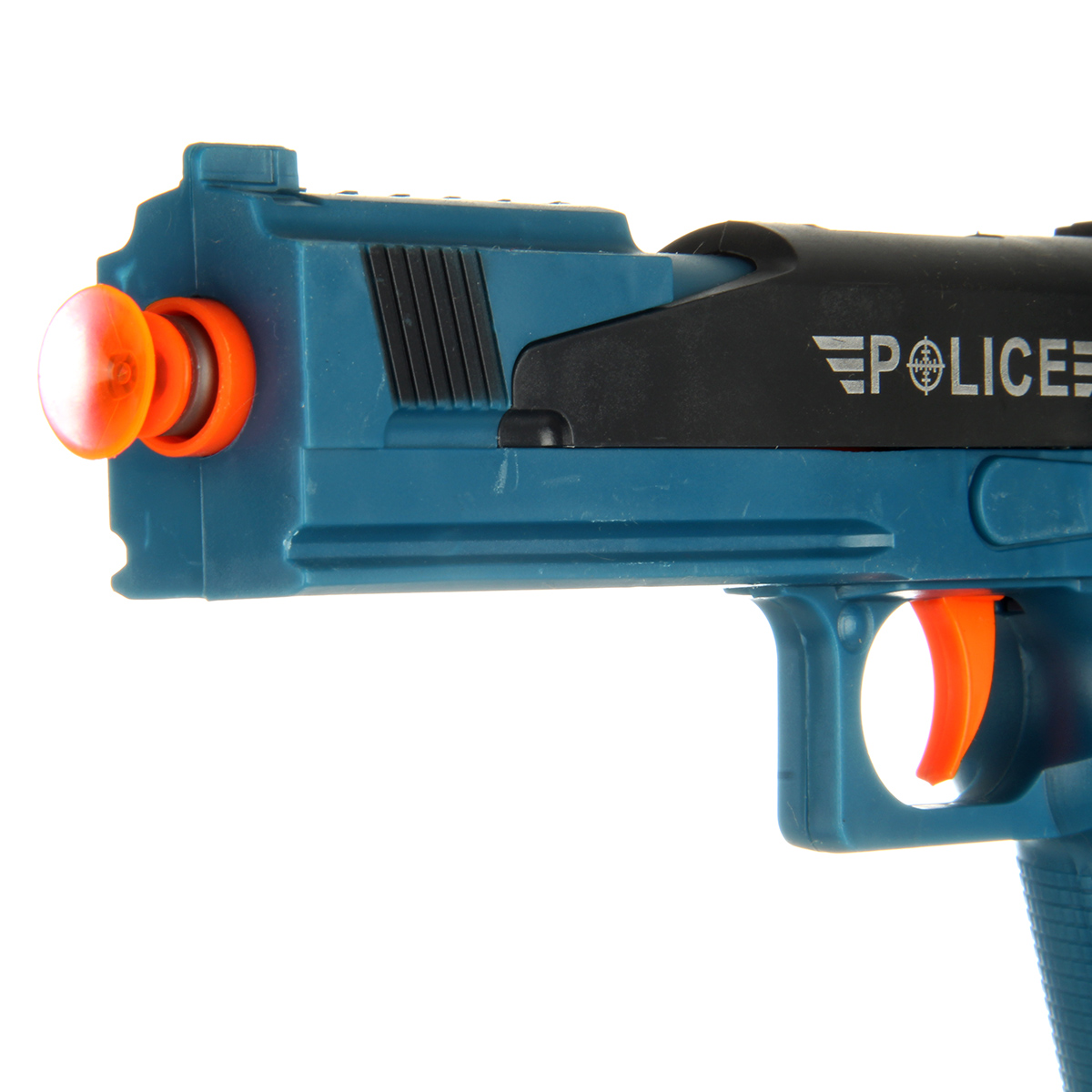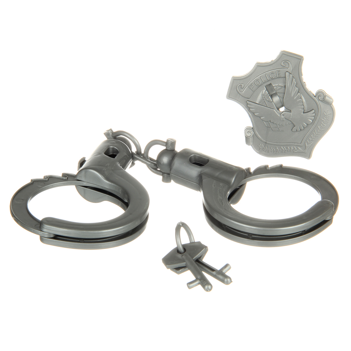 В комплекте игрушка пистолет, наручники, жетон, магазин с 5 патронами, связка ключей.