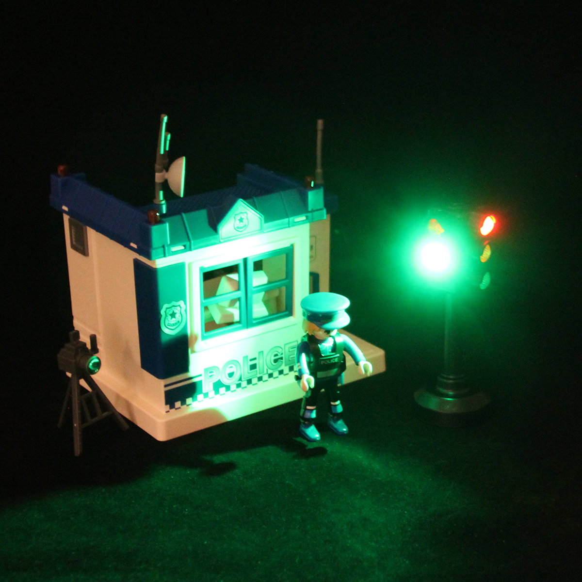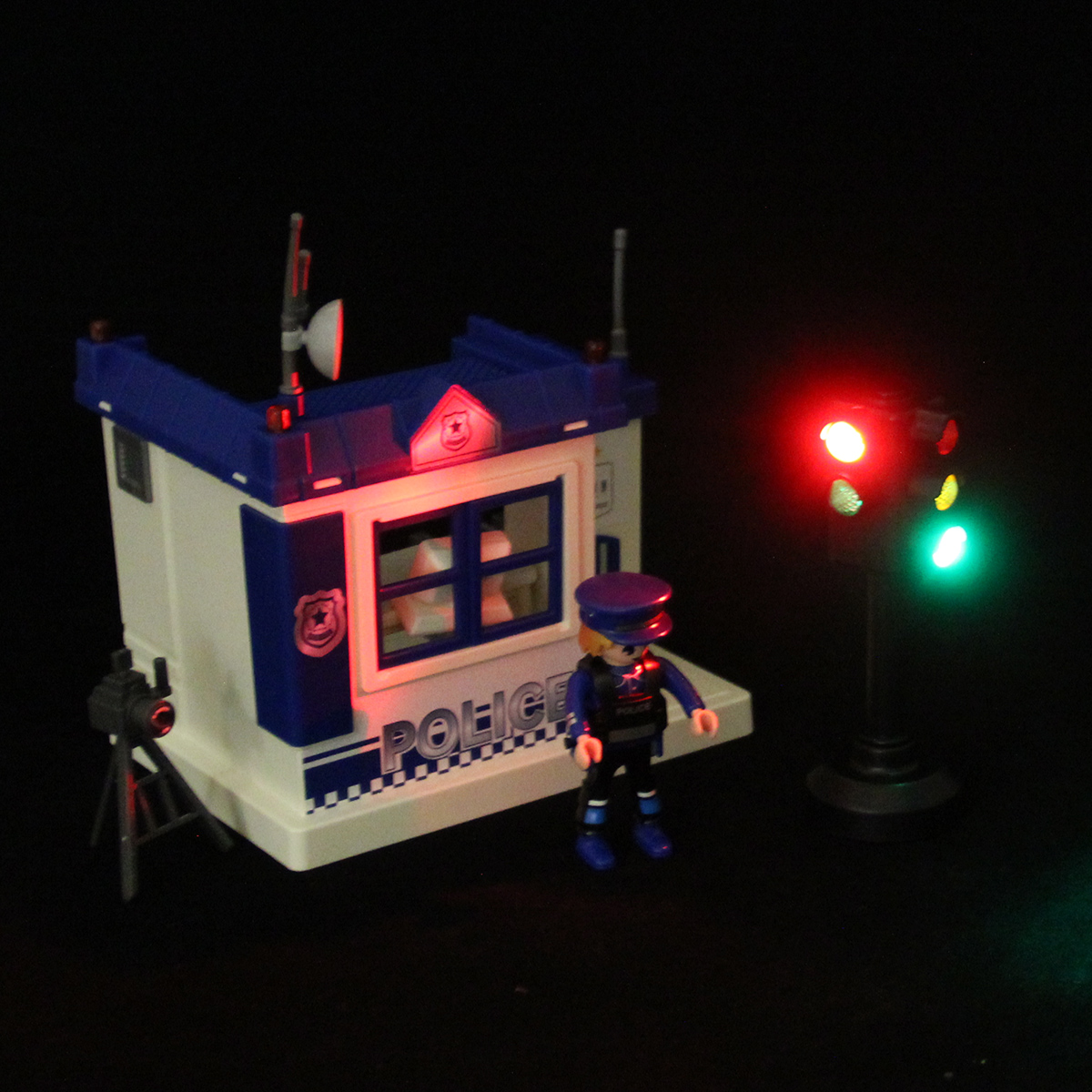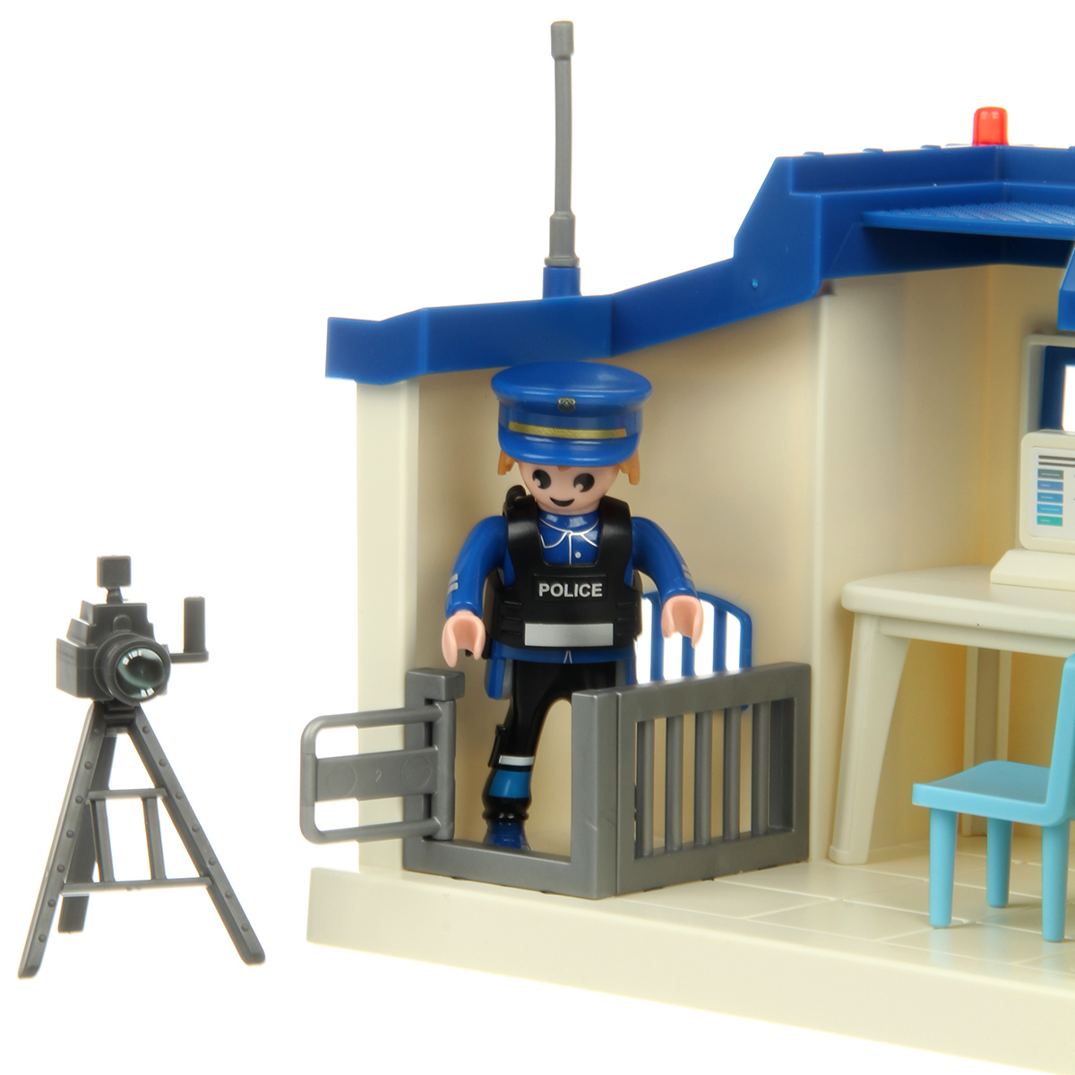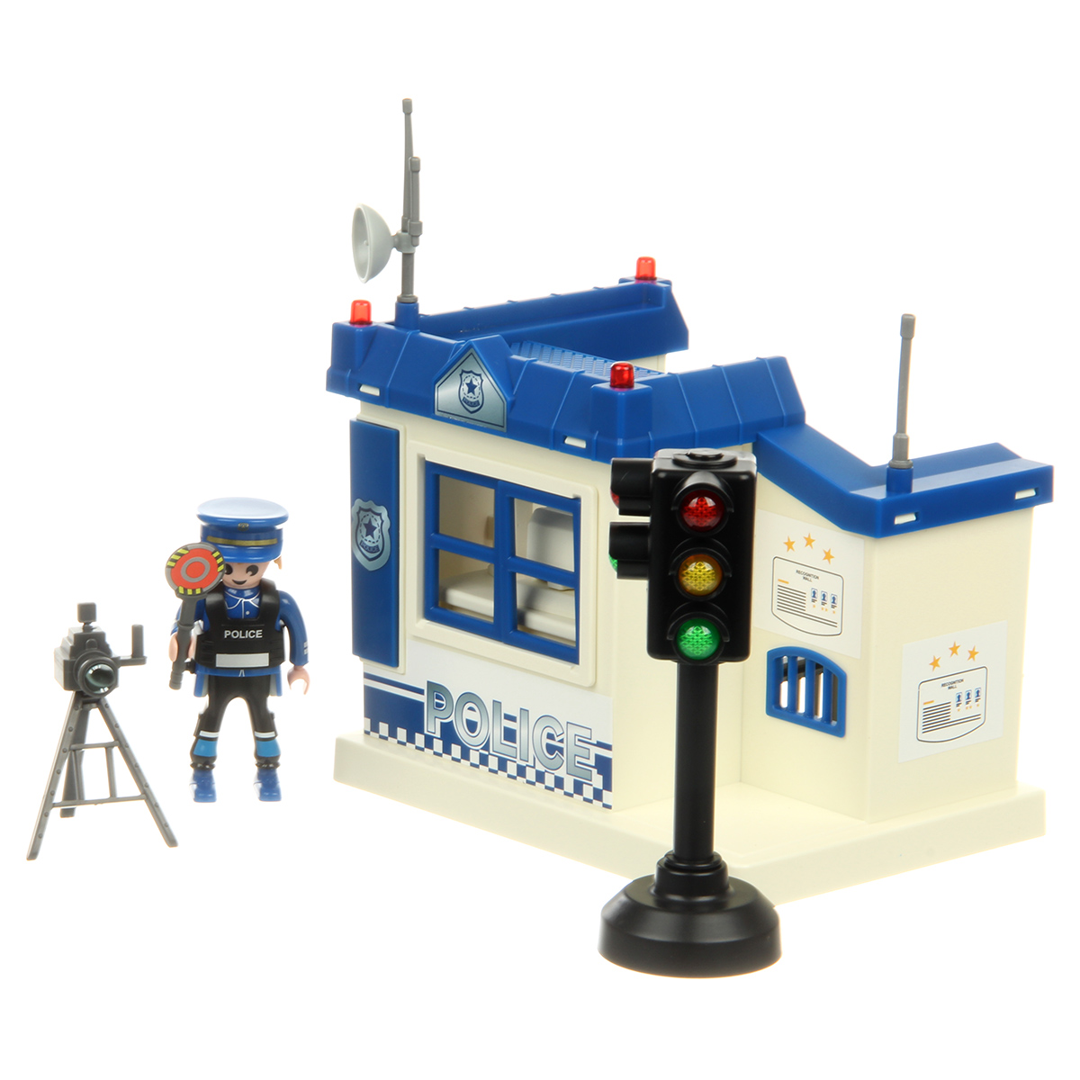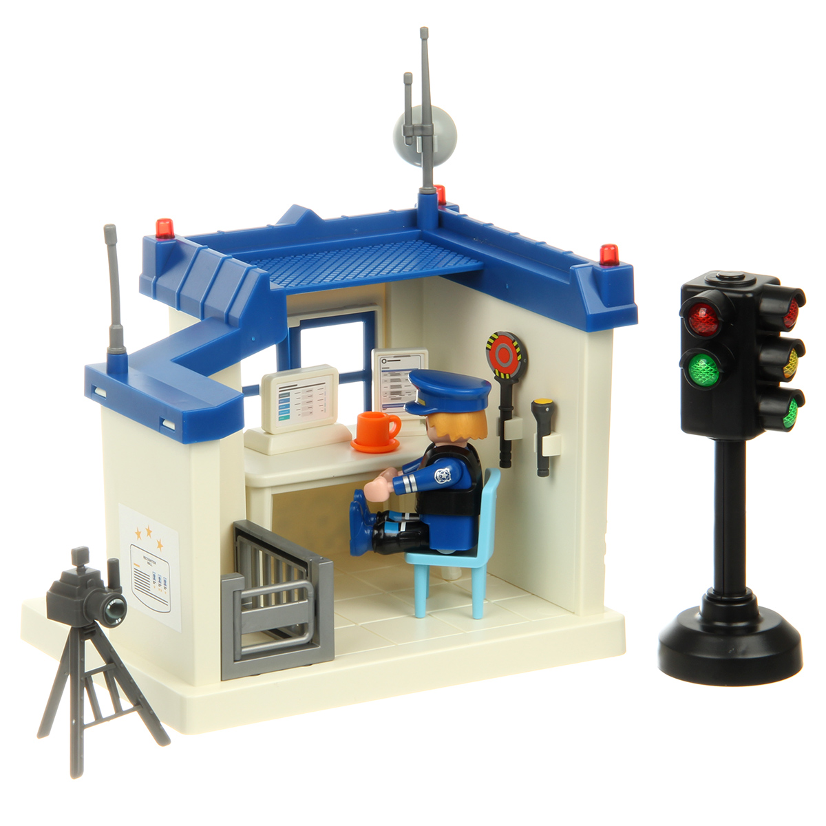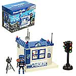 В наборе детали для сборки полицейского участка, детали для сборки полицейского, светофор, стул, стол, штатив с камерой, компьютер, табличка, фонарик, жезл, чашка с тарелкой, инструкция по сборке, набор наклеек.