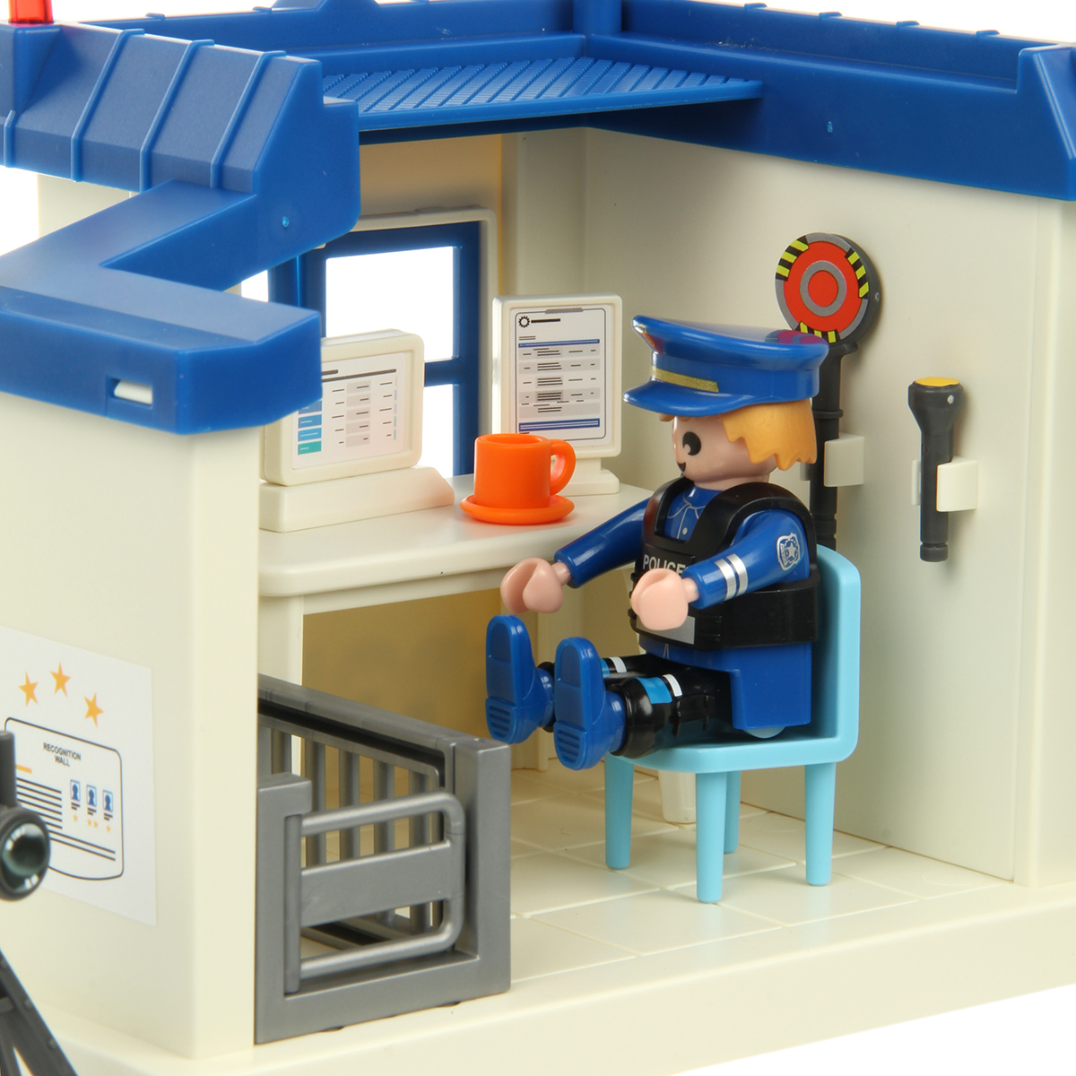 У полицейского участка отворяется калитка, открываются окошки. На стену можно прикрепить фонарик и жезл.