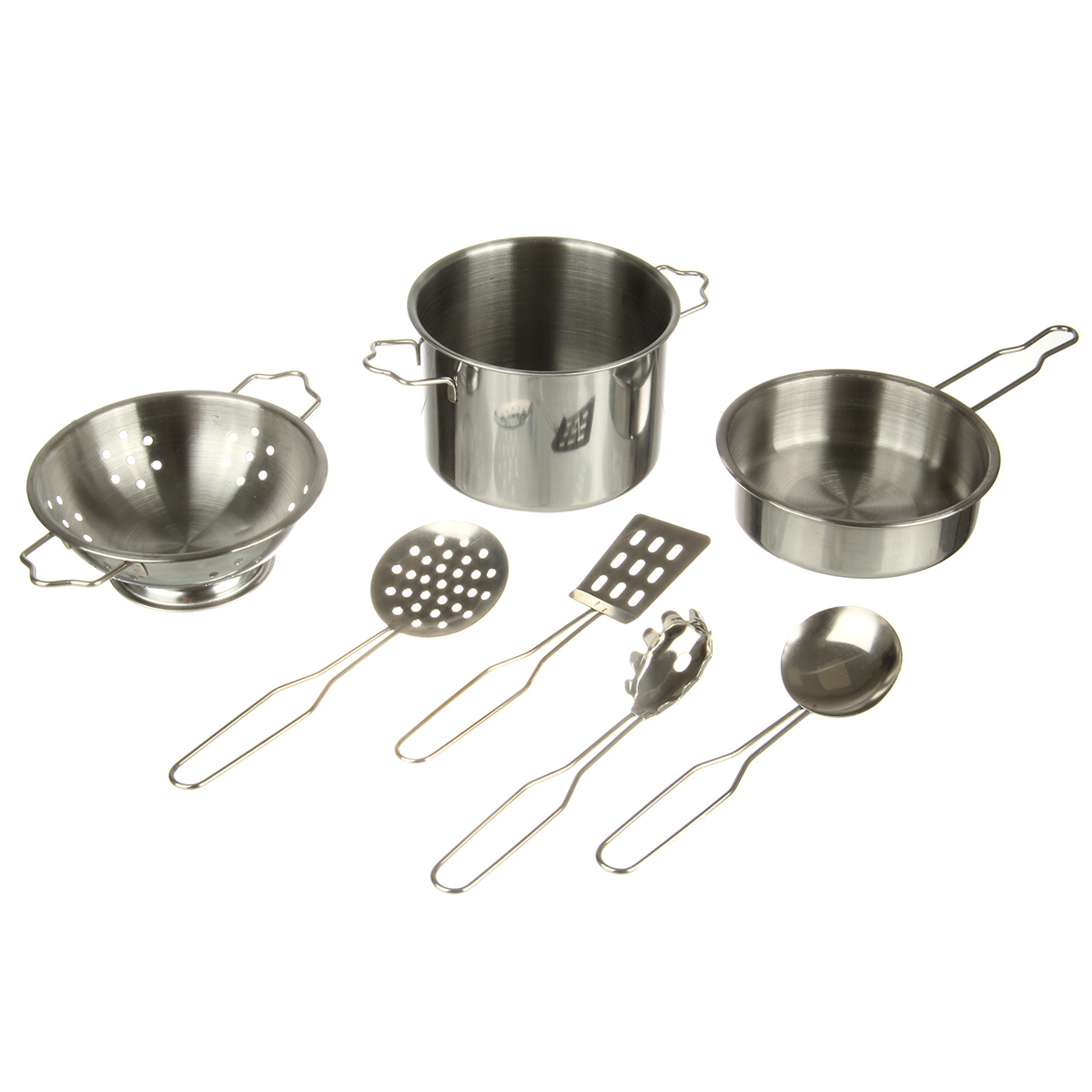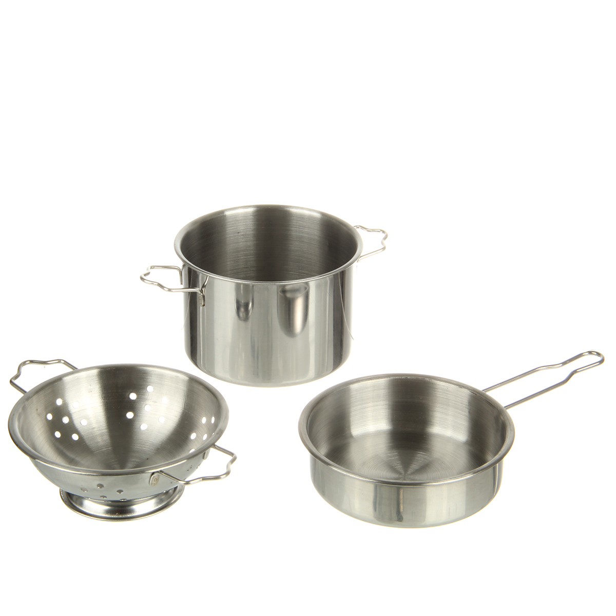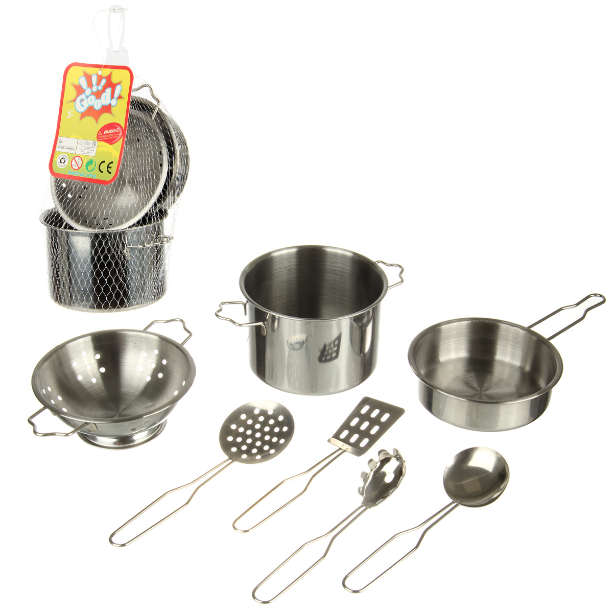 Металлическая посуда в реалистичном дизайне и компактном размере дополнит игрушечную кухню.
