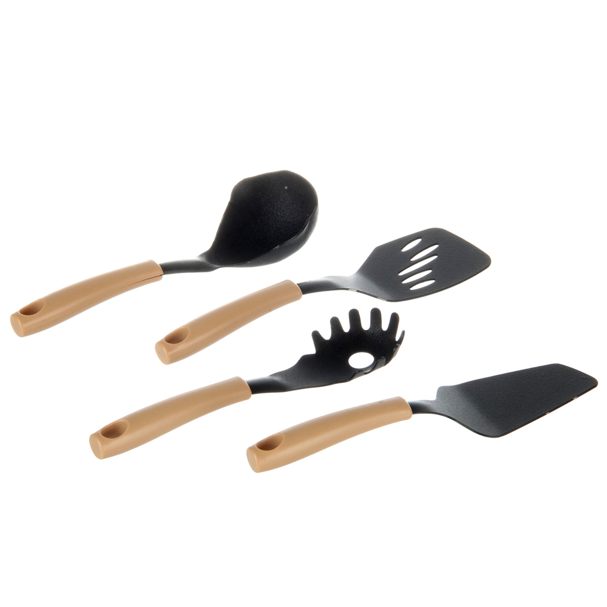 Ручки у посуды пластик, корпуса сделаны из металла, ручки у кухонных инструментов пластик, рабочая часть сделана из металла.