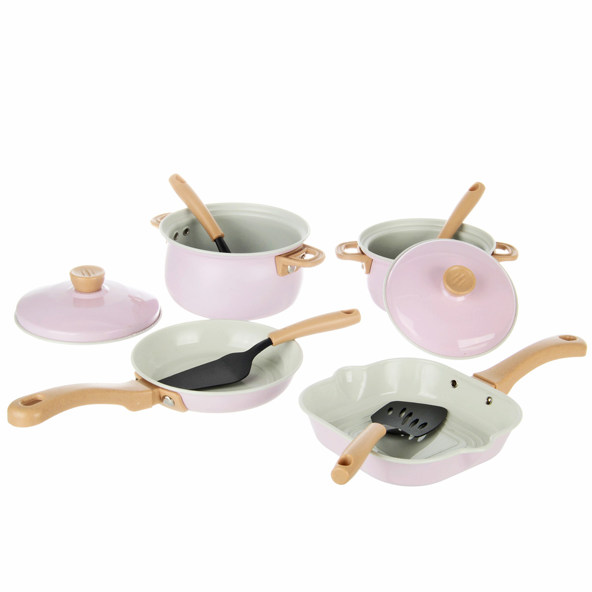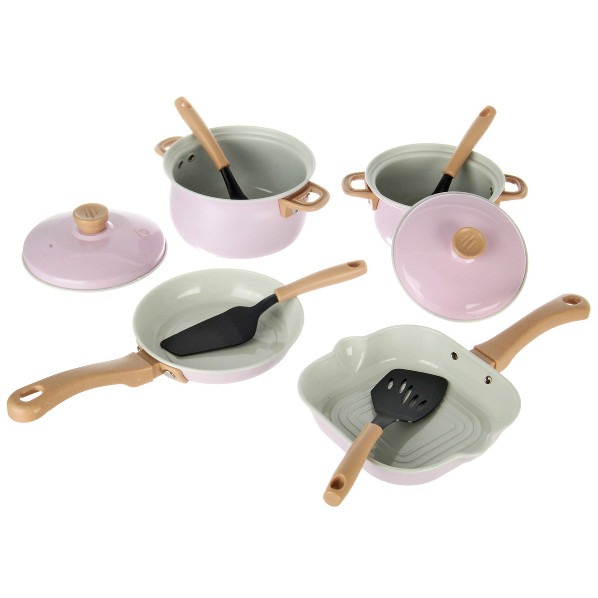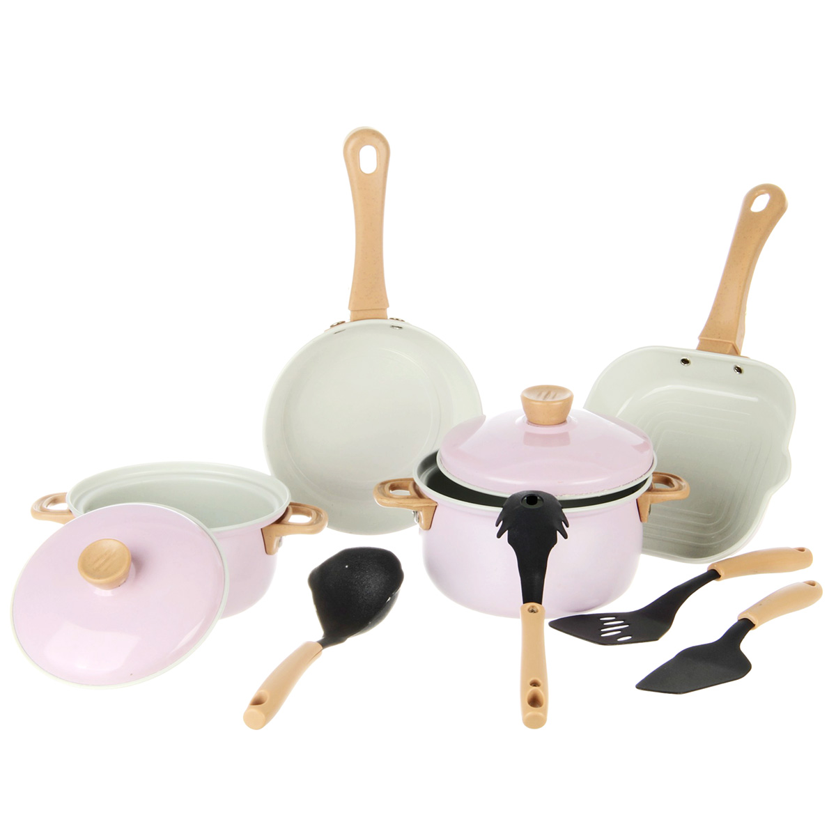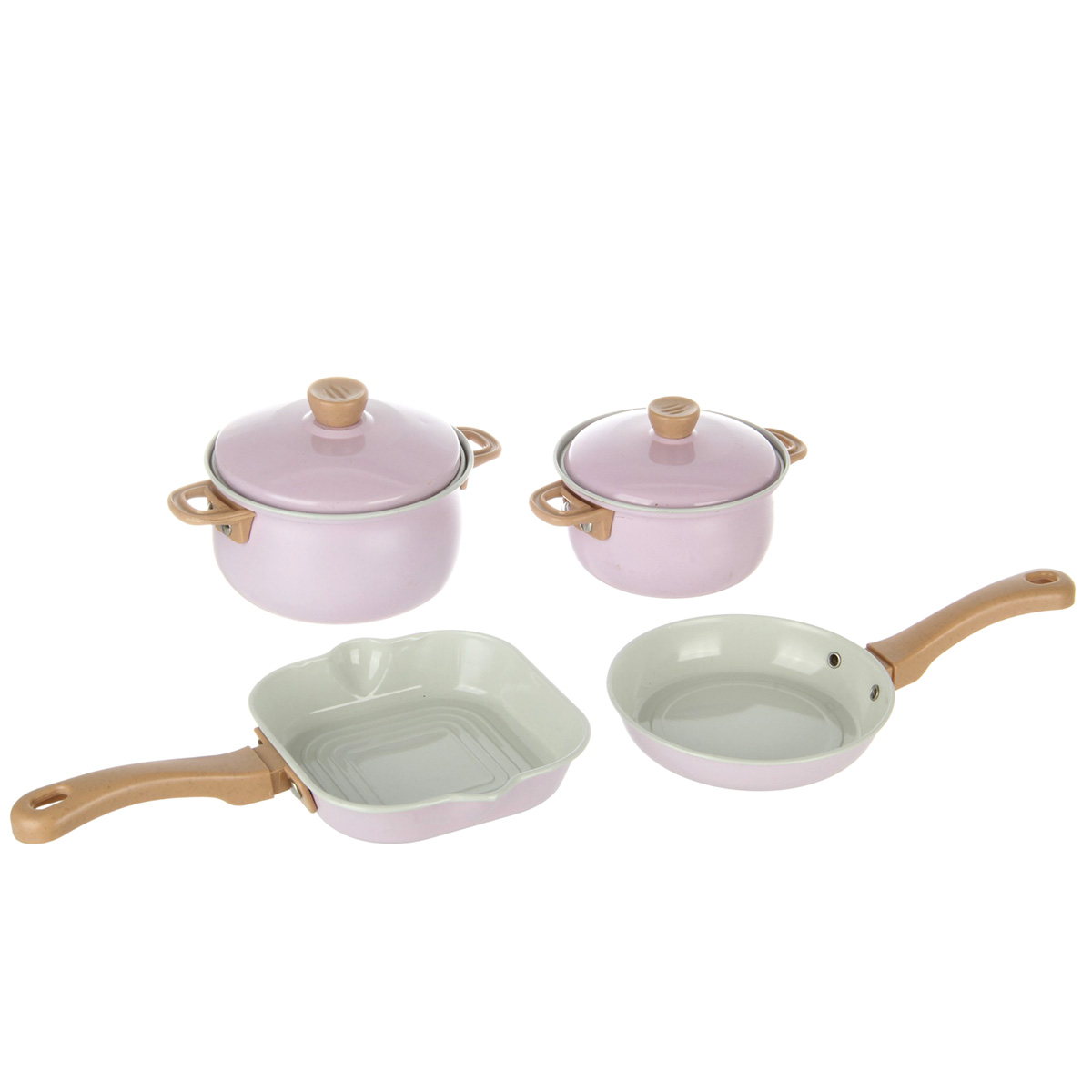 В наборе сковорода с крышкой, маленькая кастрюля с крышкой, большая кастрюля, сковорода гриль, 4 кухонных инструмента.