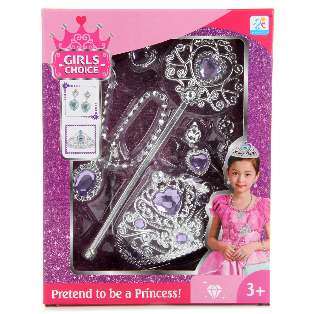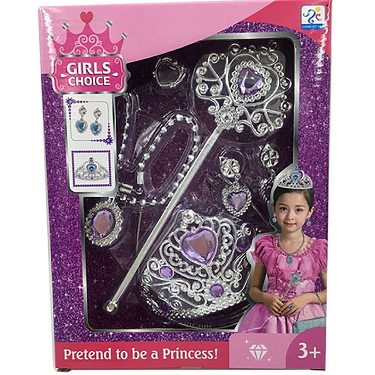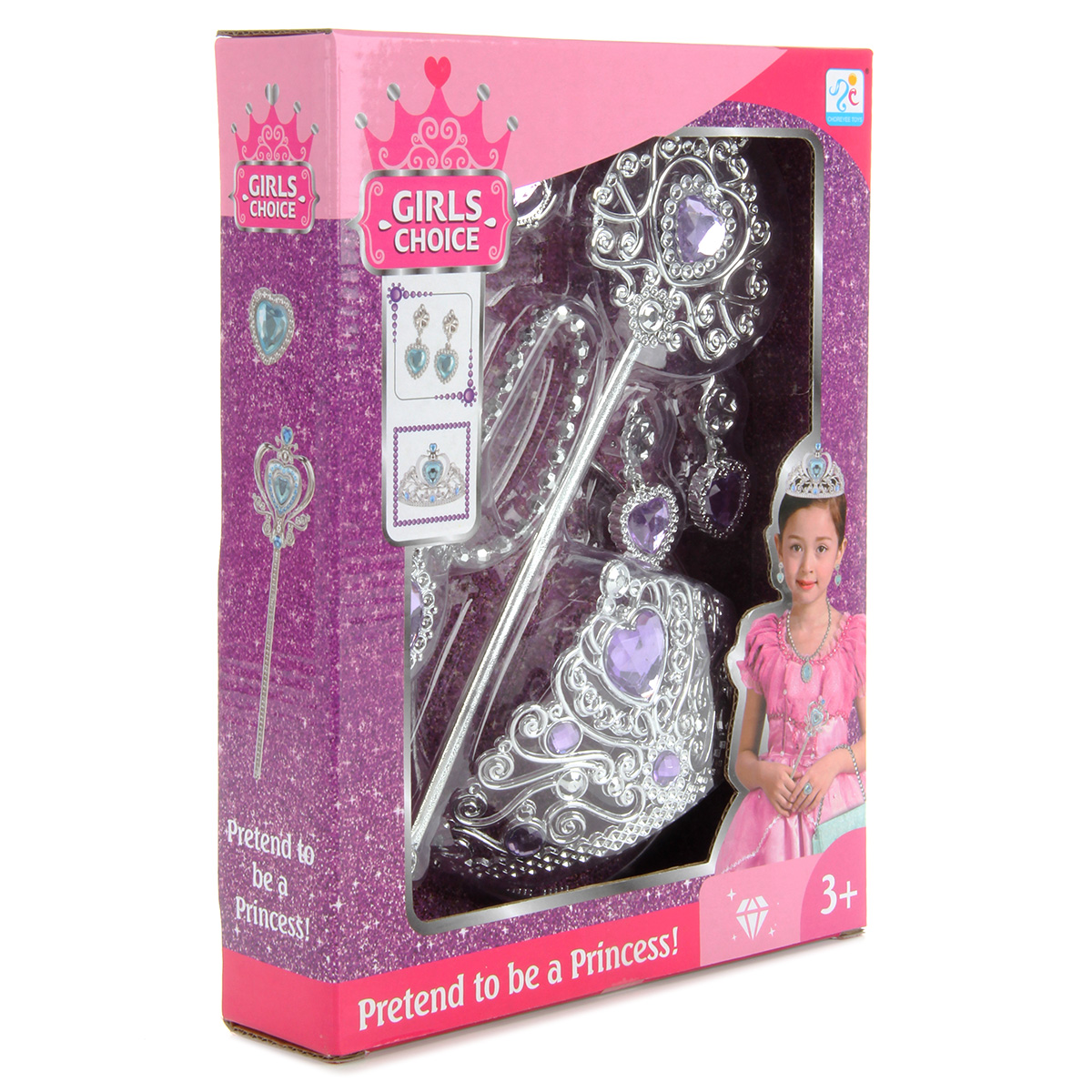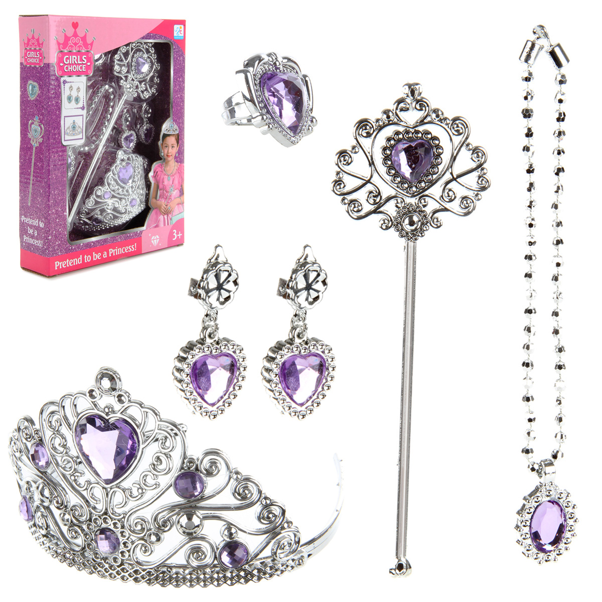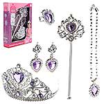 Потрясающий набор для маленькой принцессы. В комплект входят волшебная палочка, корона-ободок, колье, серьги-клипсы и кольцо. Корону при желании можно снять, колье на застежке. С таким набором ребенок придумает множество увлекательных сюжетно-ролевых игр, примерит разные образы, будет развивать воображение, мелкую моторику рук и координацию движений. Игрушка изготовлена из качественного и безопасного полимерного материала. Размеры короны-ободка: 12*13*8 см. Размеры волшебной палочки: 8*1*24 см. Внутренний диаметр кольца: 1,5 см. Размеры коробки: 20*5*26 см.