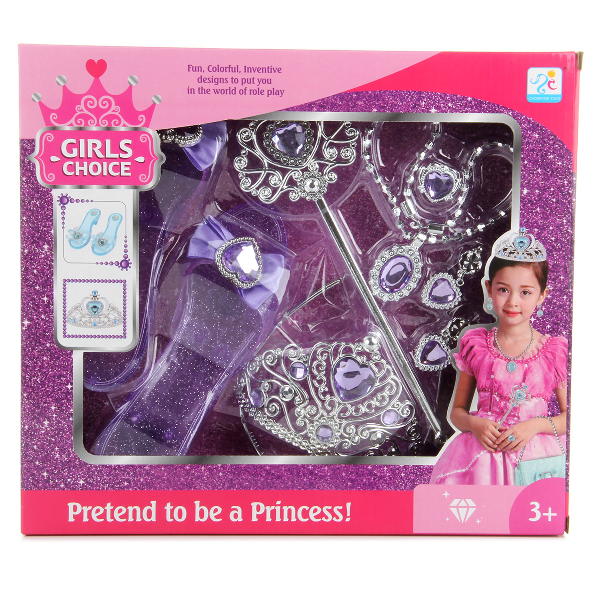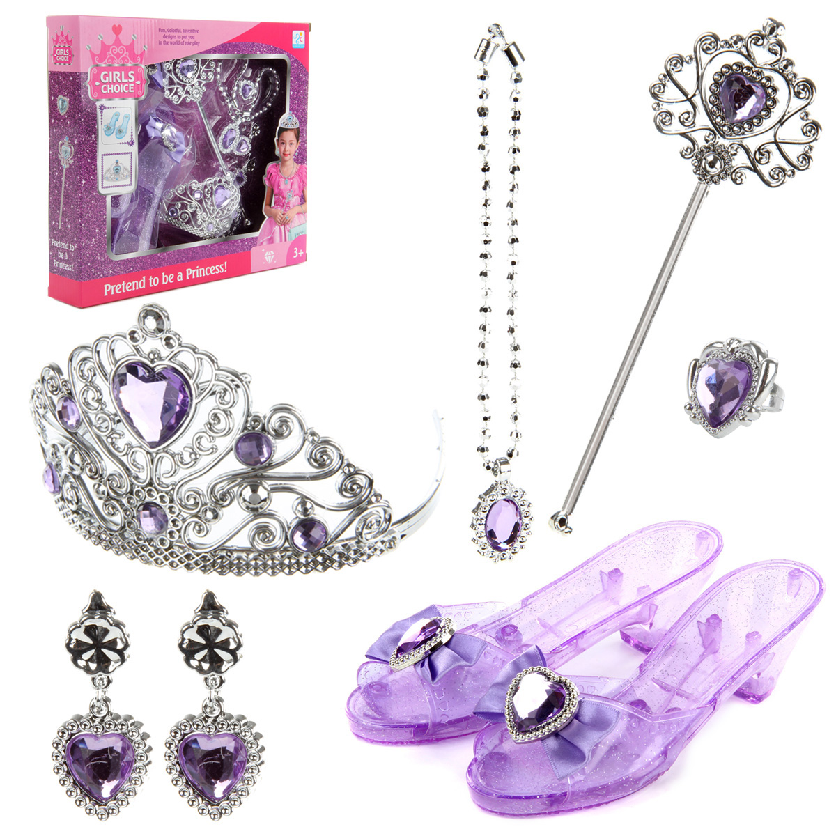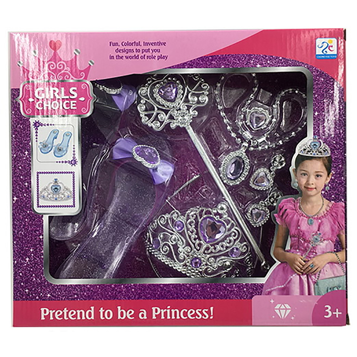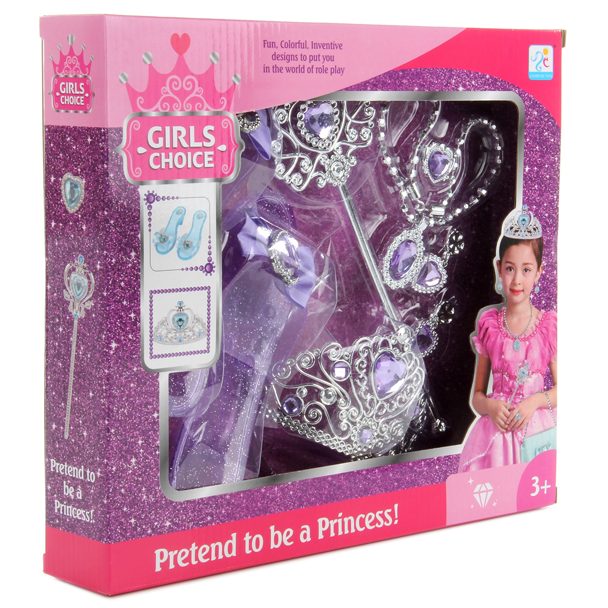 Потрясающий набор для маленькой принцессы. В комплект входят волшебная палочка, корона-ободок, ожерелье, серьги-клипсы, кольцо и туфельки. Ожерелье на застежке, ободок короны растягивается, подойдет практически для любого размера головы. С таким набором ребенок придумает множество увлекательных сюжетно-ролевых игр, примерит разные образы, будет развивать воображение, мелкую моторику рук и координацию движений. Игрушка изготовлена из качественного и безопасного полимерного материала. Размеры короны: 12*13*8 см. Размеры палочки: 24*1*8 см. Размеры туфельки: 20*6*5 см. Внутренний диаметр кольца: 1,5 см. Размеры коробки: 31*6*28 см.