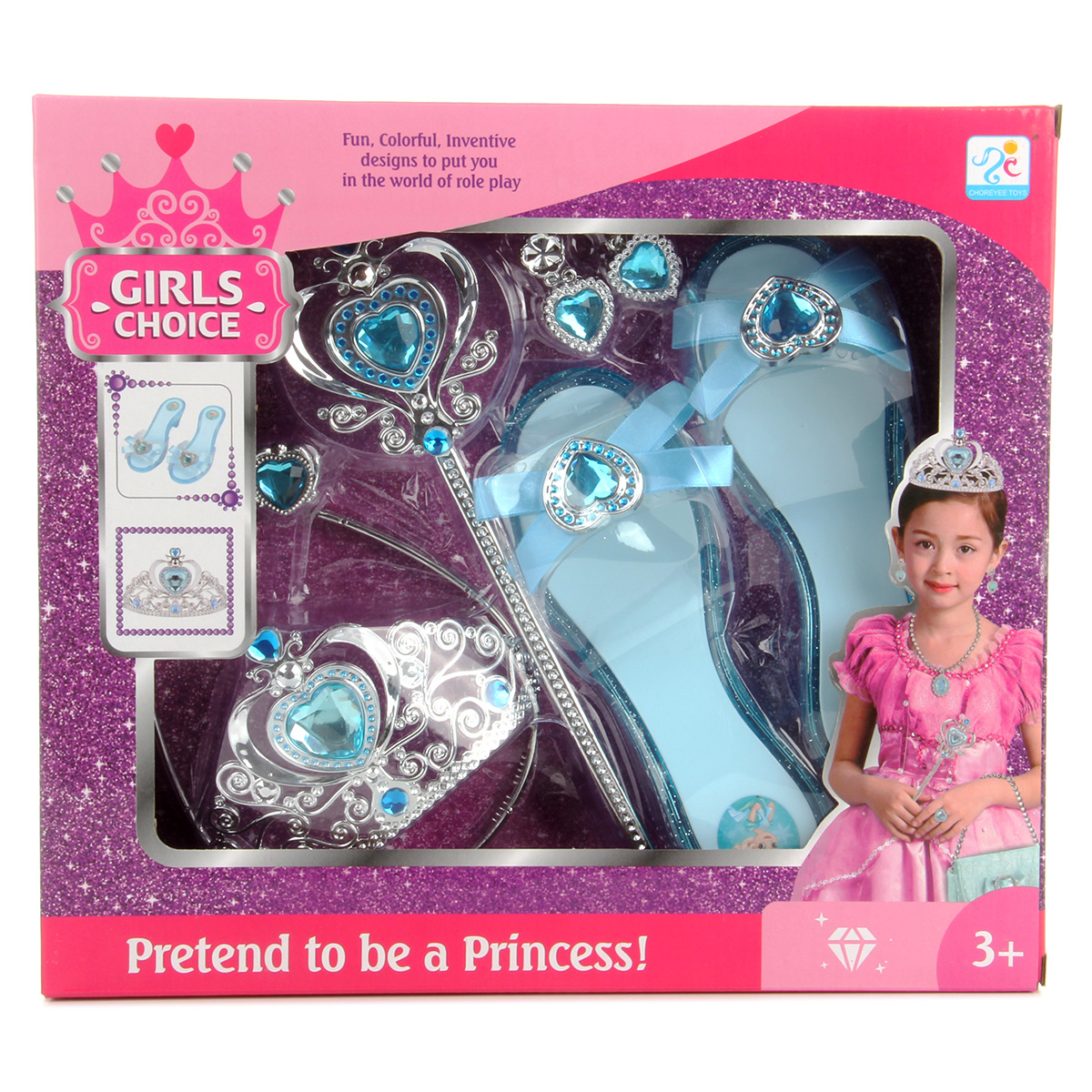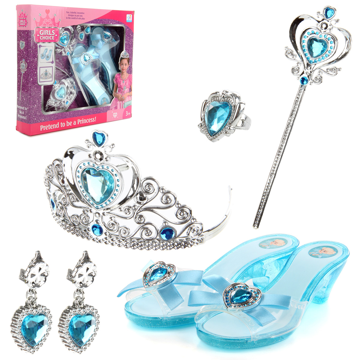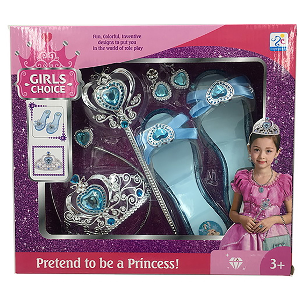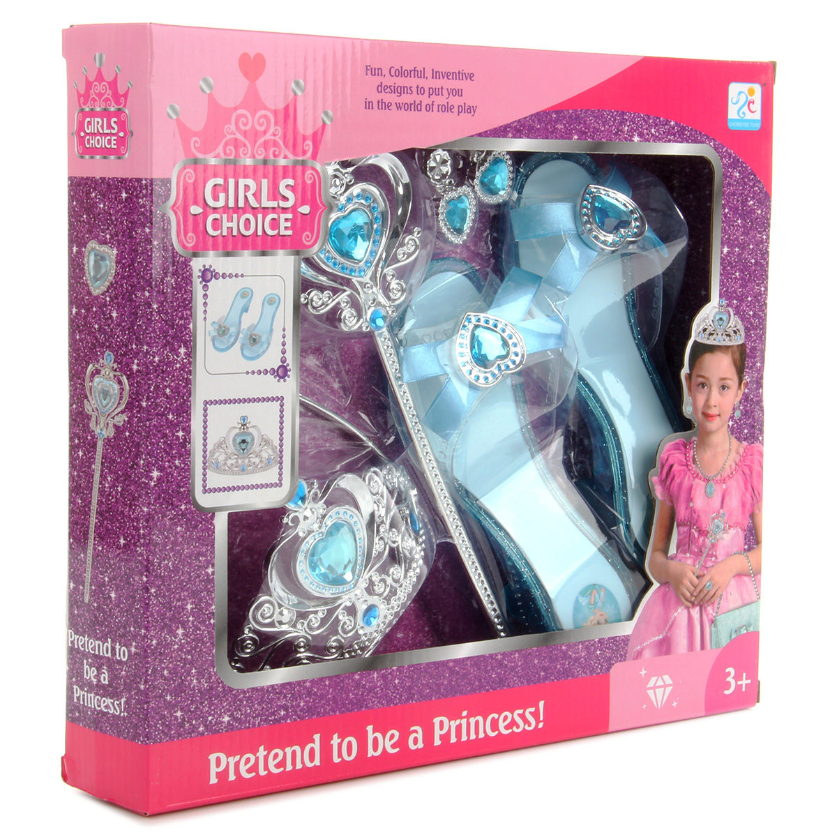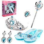 Потрясающий набор для маленькой принцессы. В комплект входят волшебная палочка, корона-ободок, серьги-клипсы, кольцо и туфельки. Ободок короны растягивается, подойдет практически для любого размера головы. С таким набором ребенок придумает множество увлекательных сюжетно-ролевых игр, примерит разные образы, будет развивать воображение, мелкую моторику рук и координацию движений. Игрушка изготовлена из качественного и безопасного полимерного материала. Размеры короны-ободка: 13*13*8 см. Размеры палочки: 24*1*7 см. Размеры туфельки: 18,5*7*5 см. Внутренний диаметр кольца: 1,5 см. Размеры коробки: 31*6*28 см.