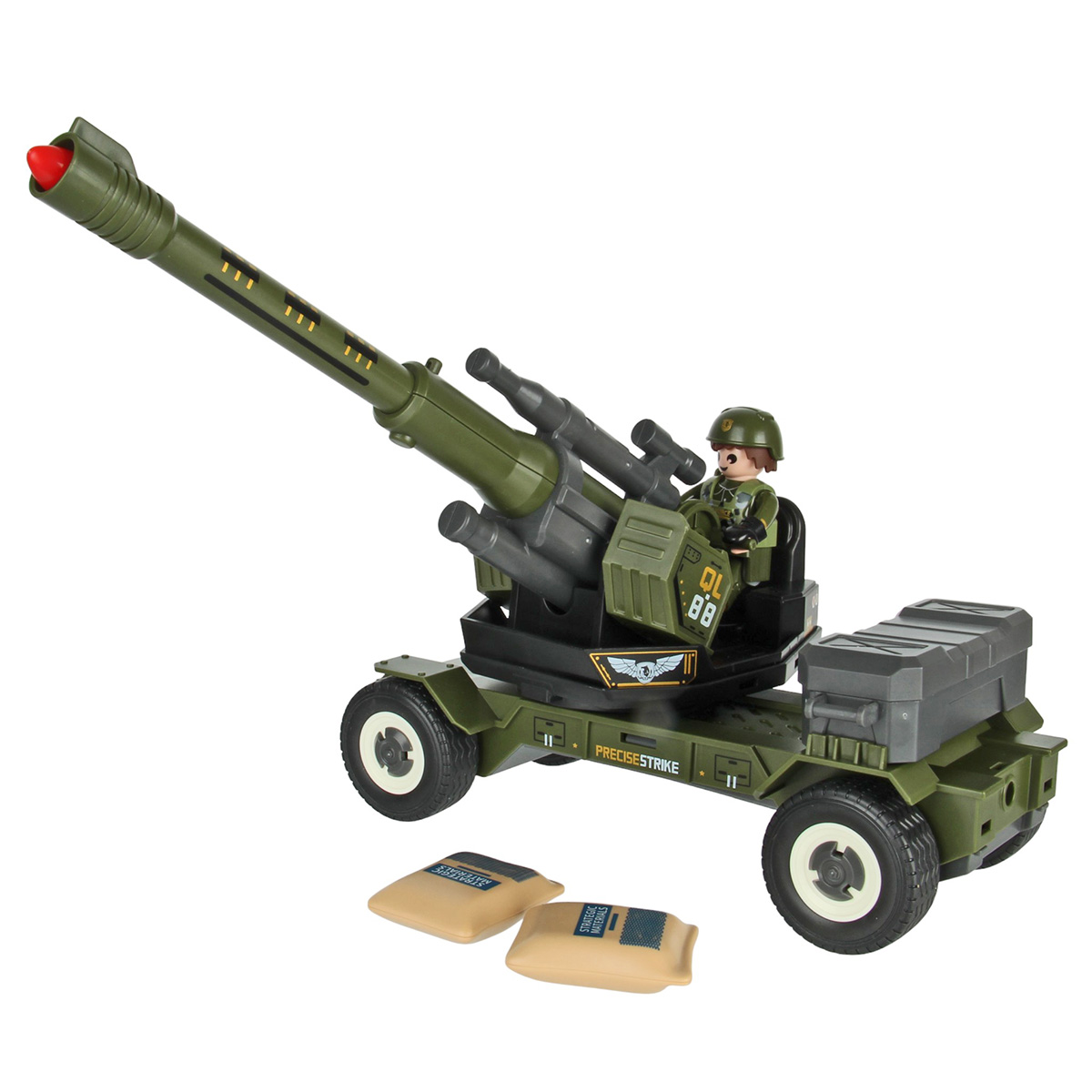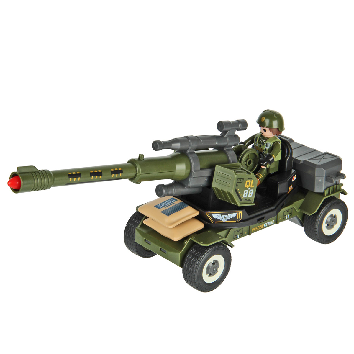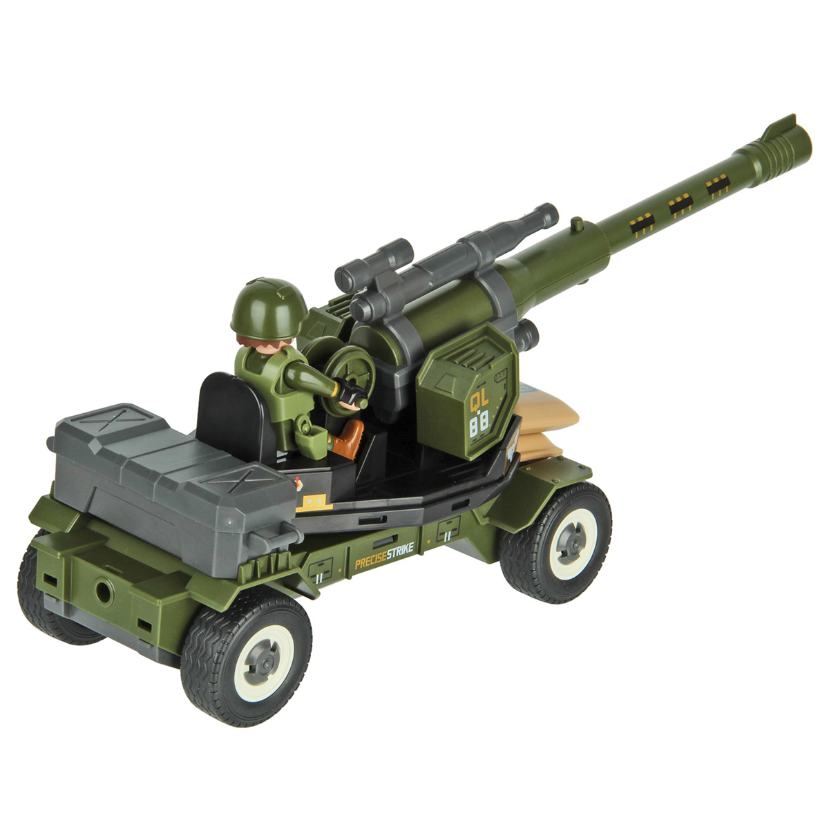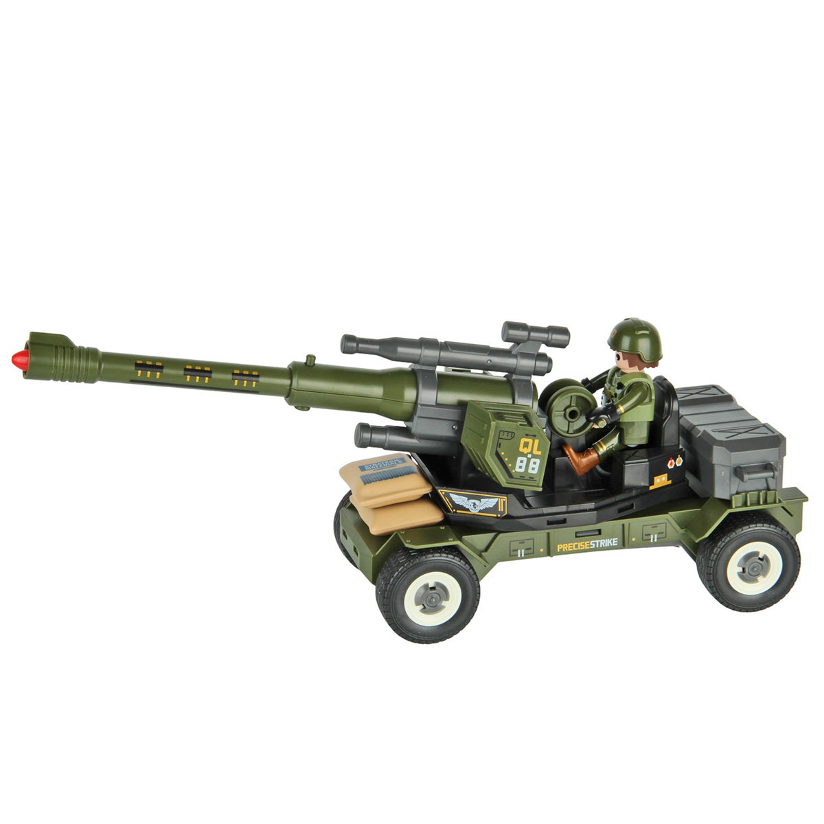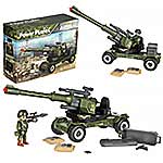 Противотанковая пушка, стреляющая снарядом, фигурка солдата и аксессуары в наборе. Простая сборка, прорезиненные колеса, движение вперёд и назад. Ствол пушки поднимается и опускается, руки и ноги солдата двигаются, в руки можно вложить оружие, голова крутится, крышка чемодана открывается. Игрушка изготовлена из прочных и долговечных материалов в качественном исполнении, оформлена в стильной военной расцветке.