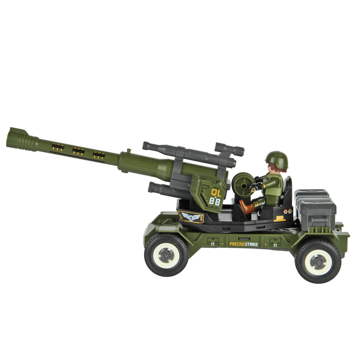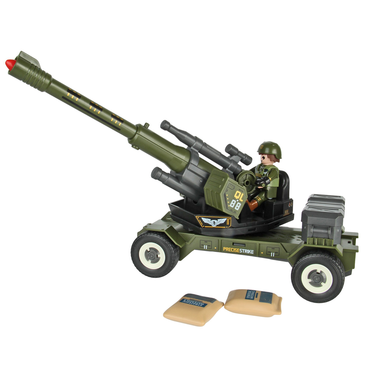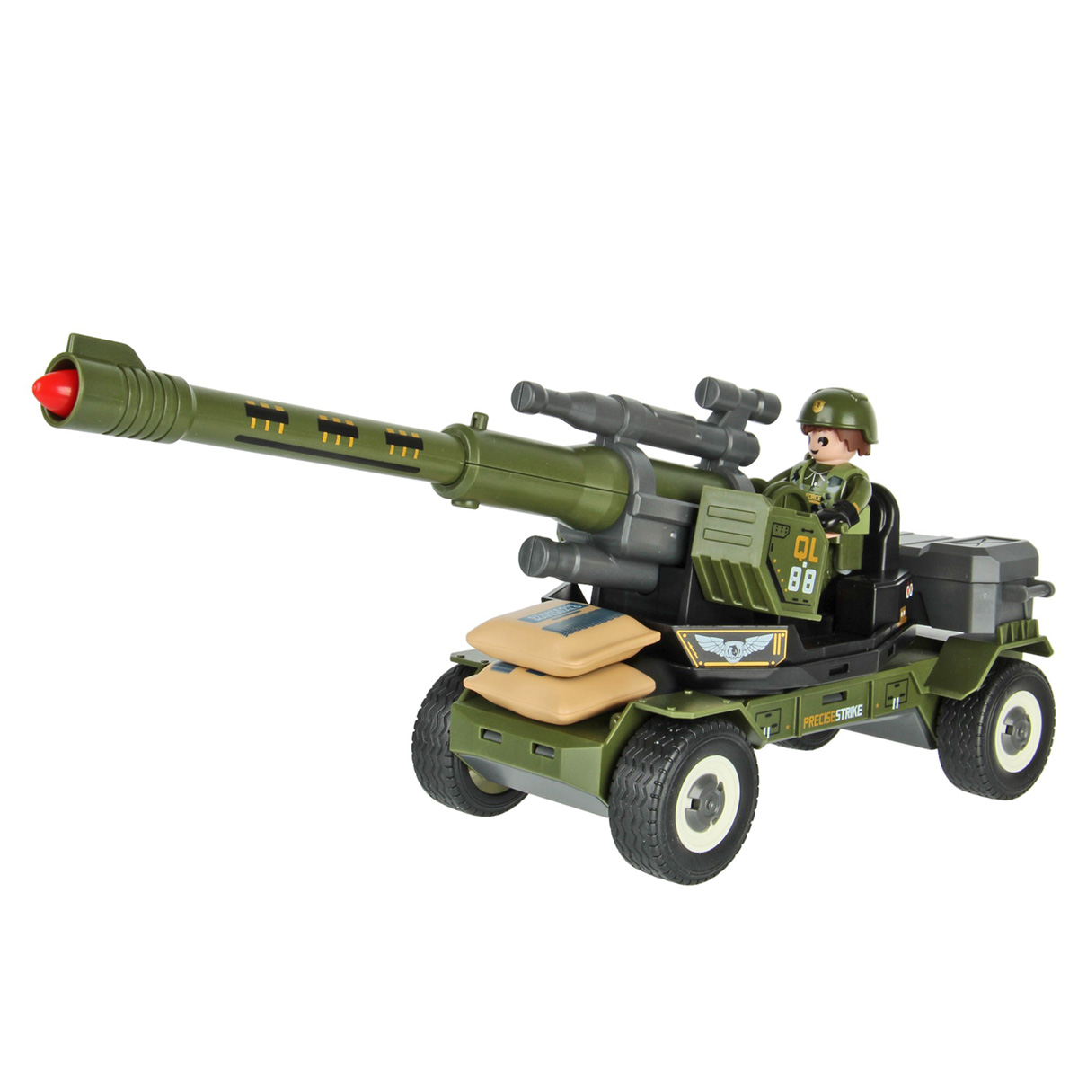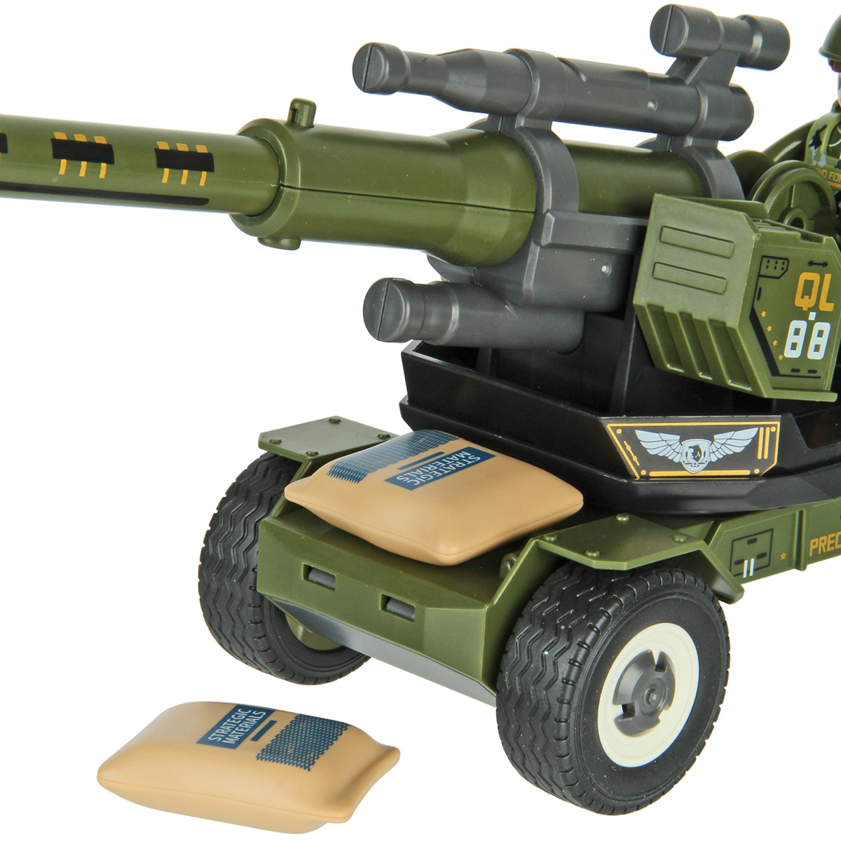 Противотанковая пушка, стреляющая снарядом, фигурка солдата и аксессуары в наборе. Простая сборка, прорезиненные колеса, движение вперёд и назад. Ствол пушки поднимается и опускается, руки и ноги солдата двигаются, в руки можно вложить оружие, голова крутится, крышка чемодана открывается. Игрушка изготовлена из прочных и долговечных материалов в качественном исполнении, оформлена в стильной военной расцветке.