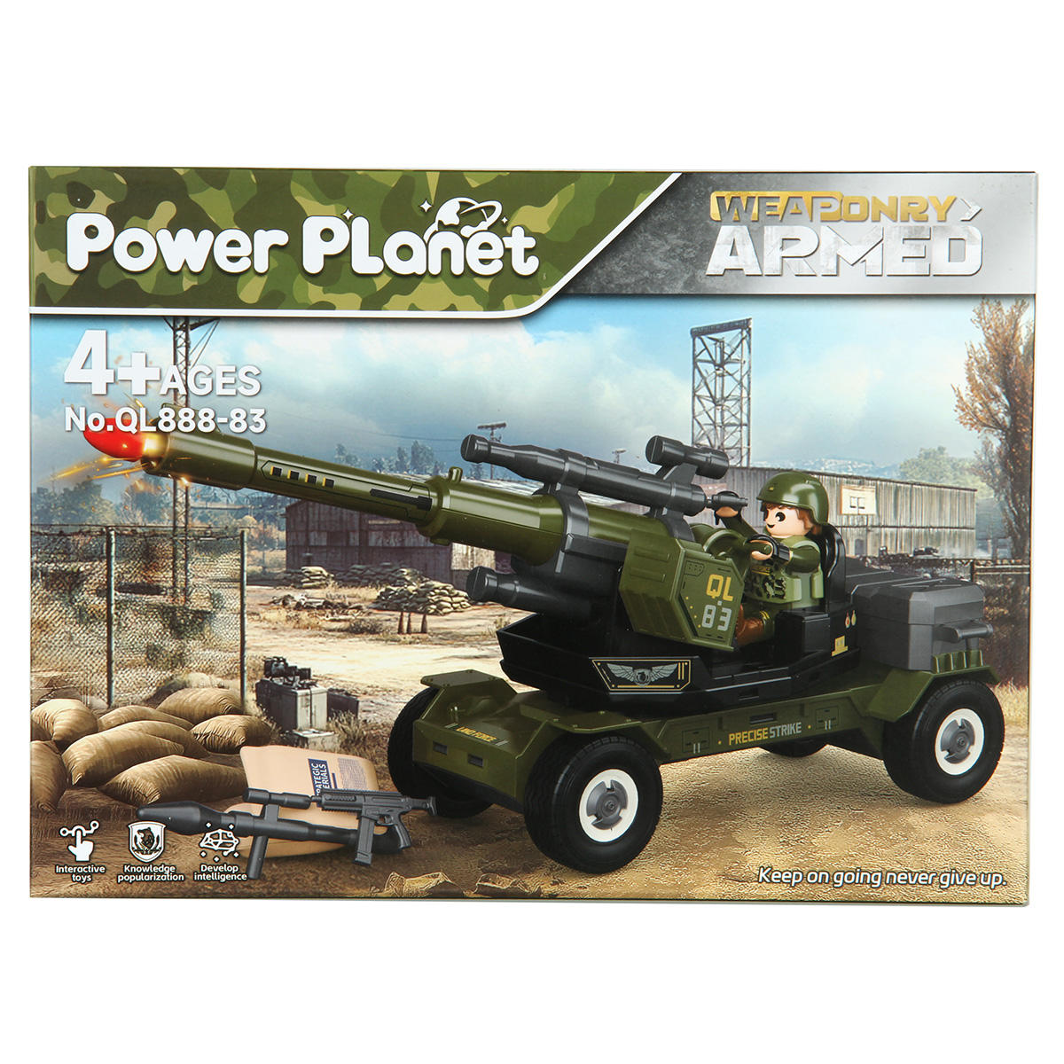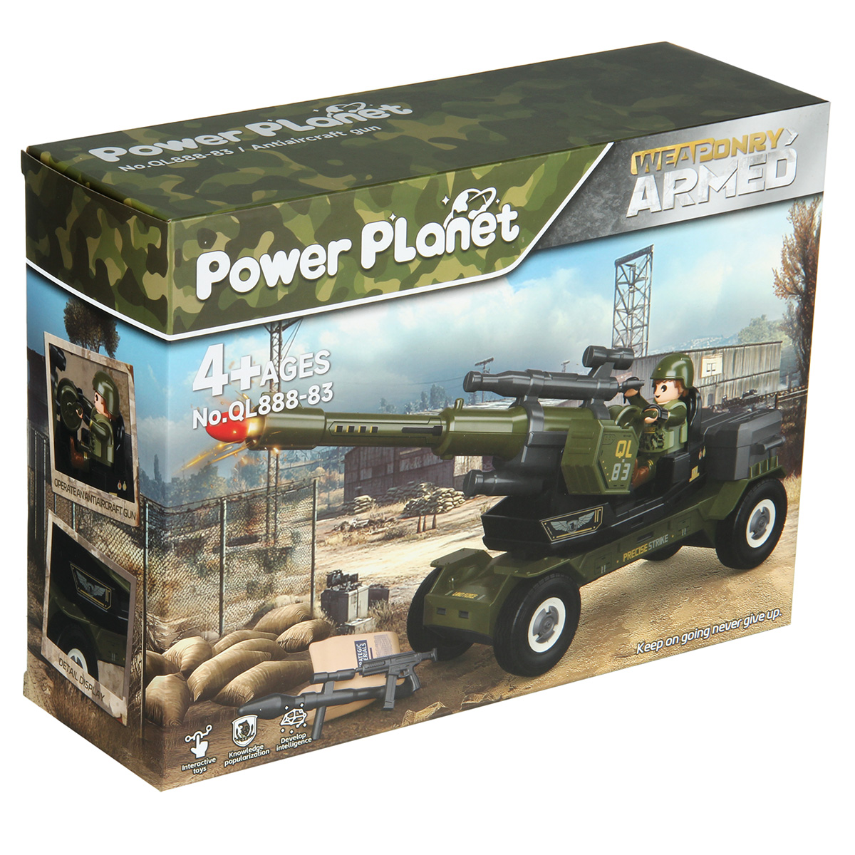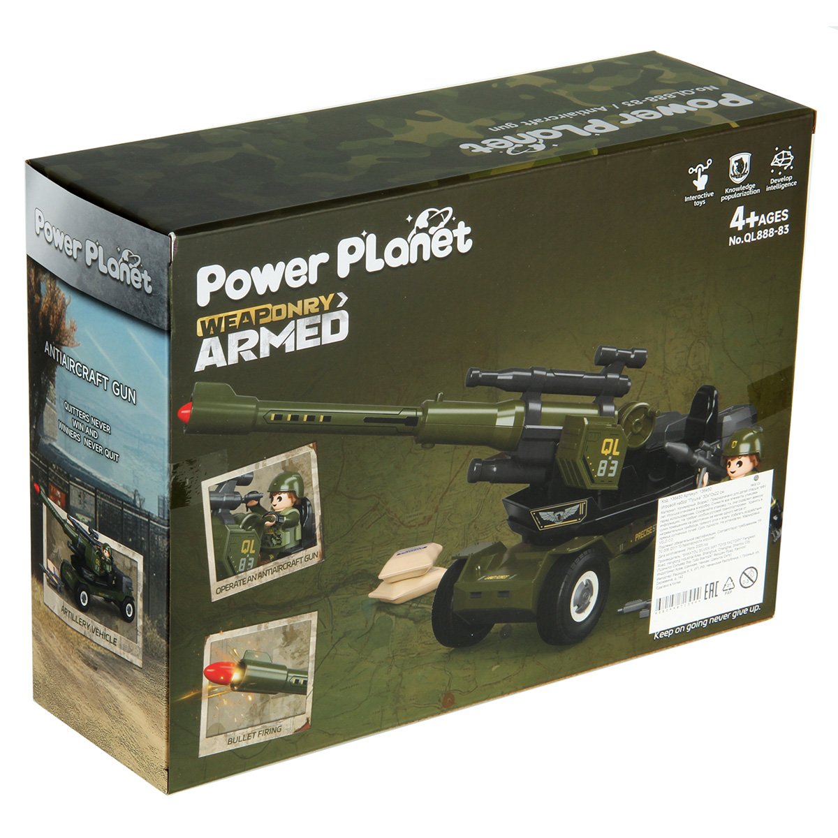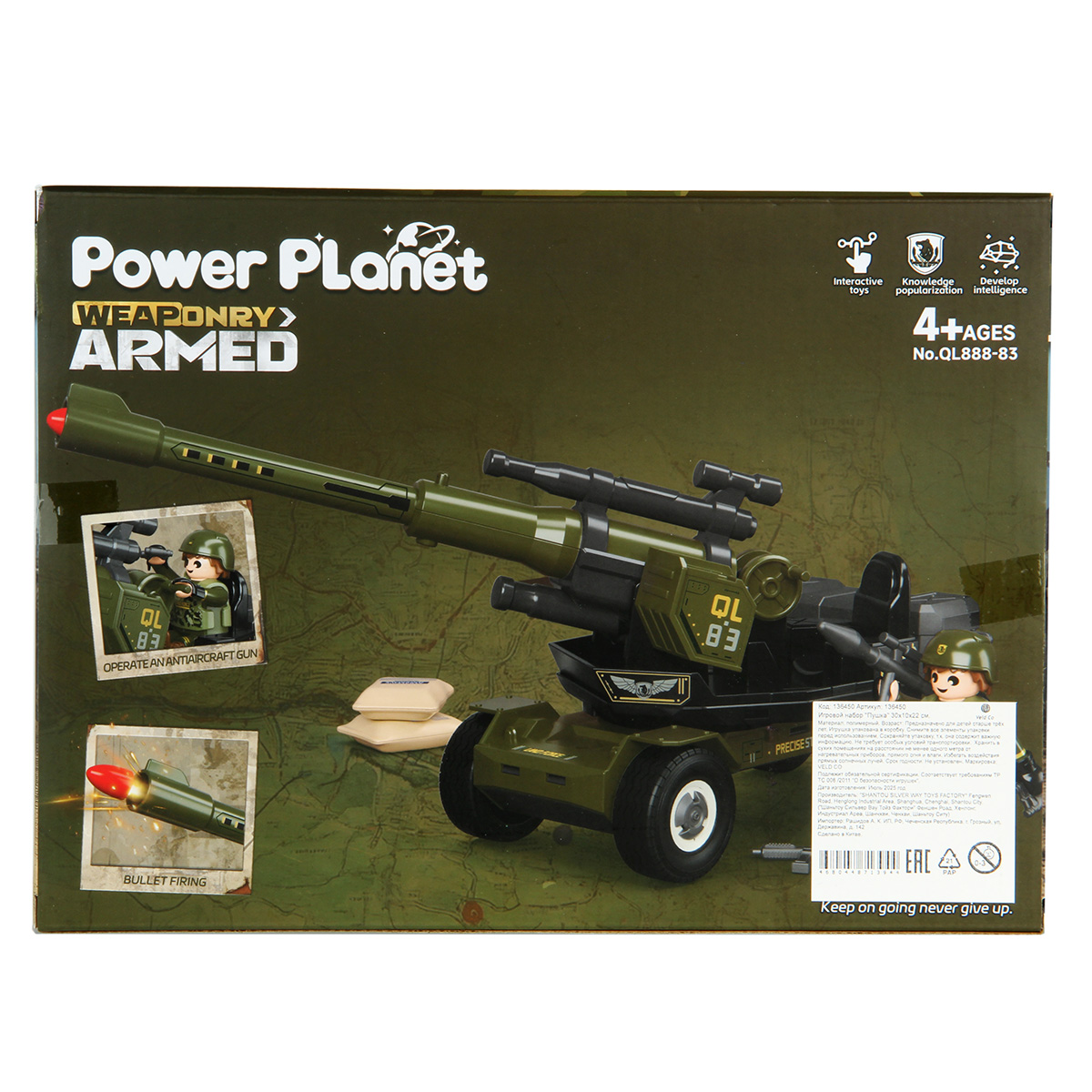 Противотанковая пушка, стреляющая снарядом, фигурка солдата и аксессуары в наборе. Простая сборка, прорезиненные колеса, движение вперёд и назад. Ствол пушки поднимается и опускается, руки и ноги солдата двигаются, в руки можно вложить оружие, голова крутится, крышка чемодана открывается. Игрушка изготовлена из прочных и долговечных материалов в качественном исполнении, оформлена в стильной военной расцветке.