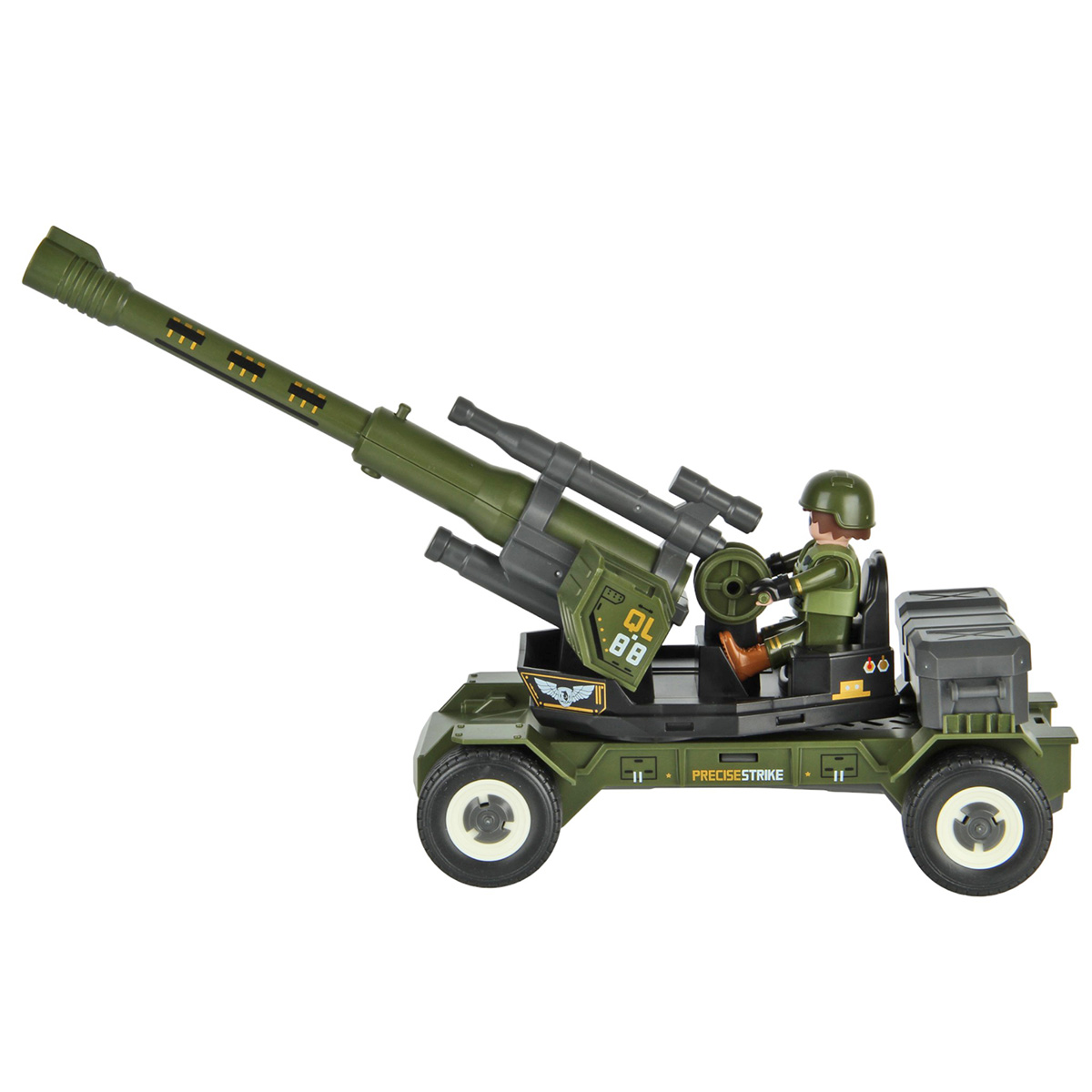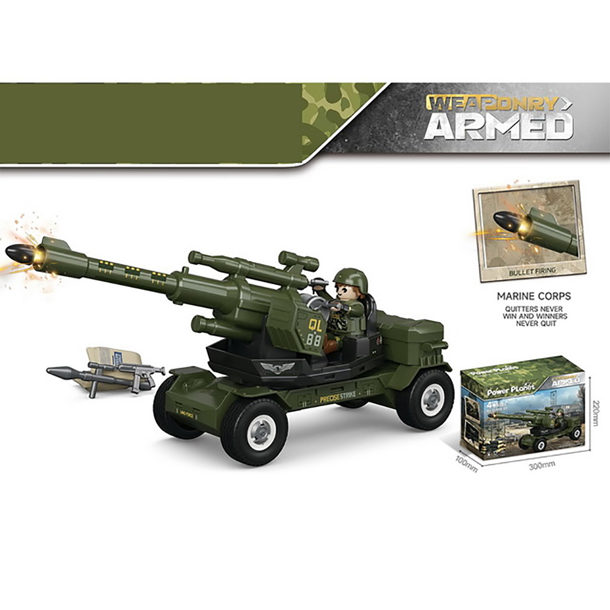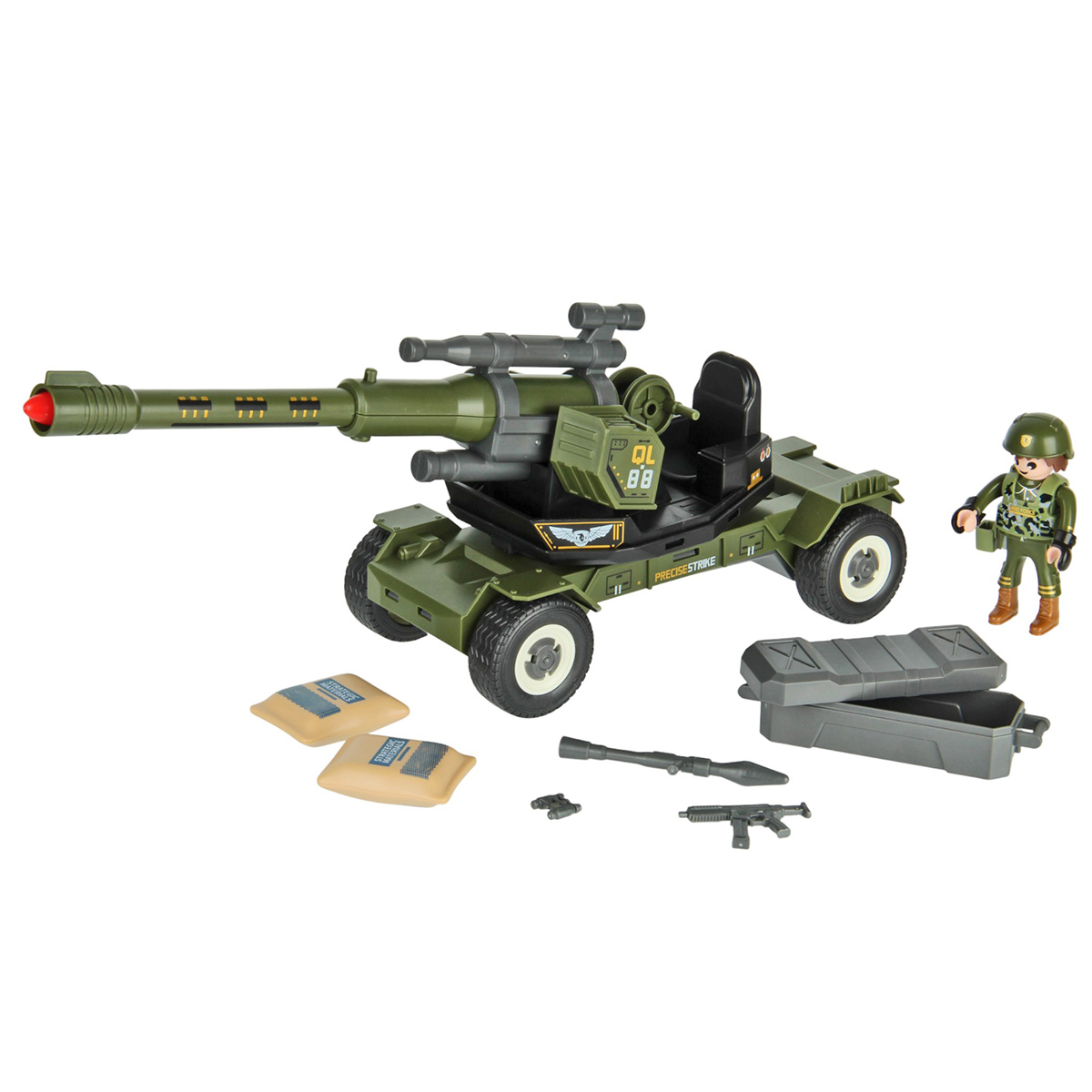 Размер противотанковой пушки с опущенной стрелой 33х9х13 см, высота с поднятой стрелой 18 см.