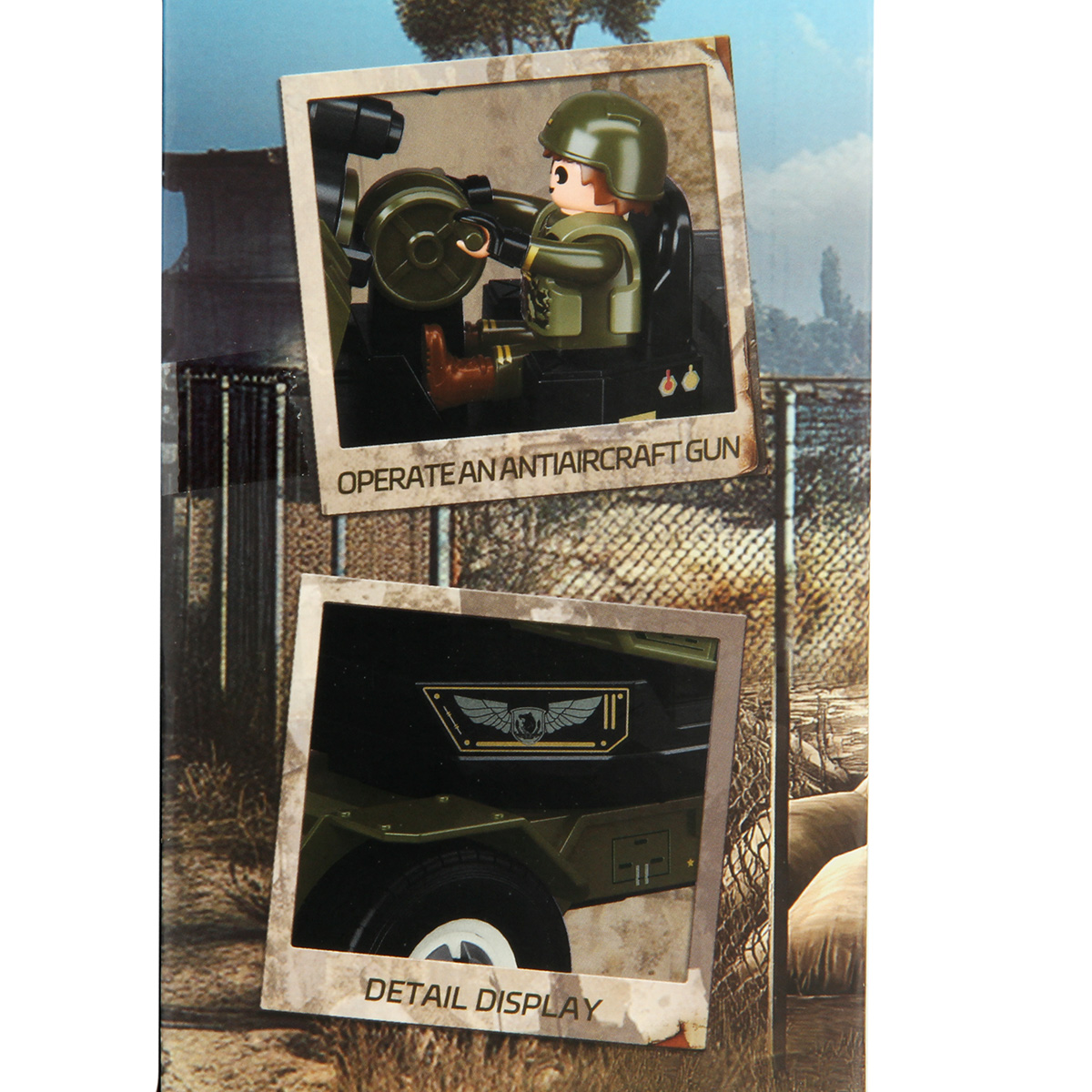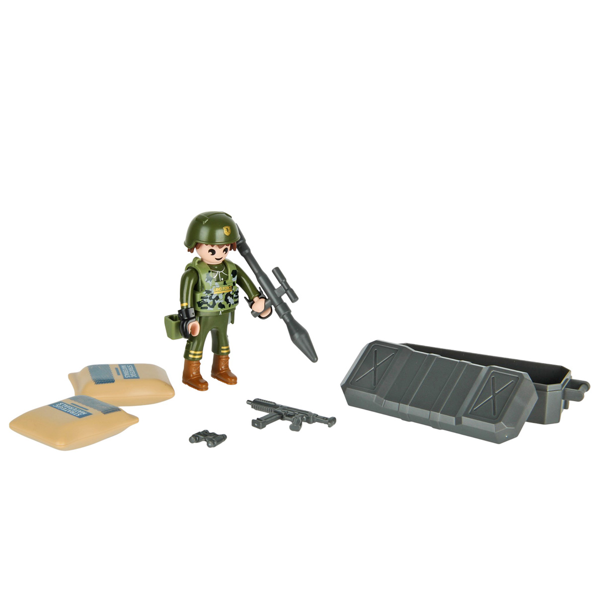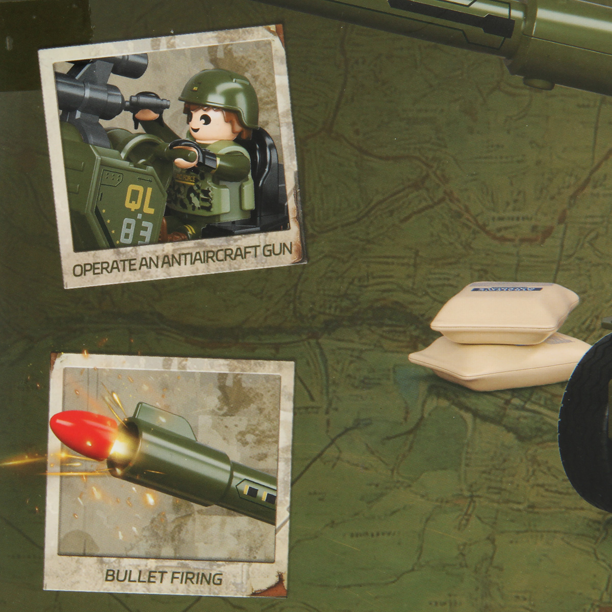 Детали для сборки противотанковой пушки, детали для сборки фигурки солдата, 2 детали для сборки снаряда, 2 мешка со стратегическими материалами из 2 деталей, чемодан, фигурки автомата, бинокля, базуки, инструкция по сборке на английском языке.