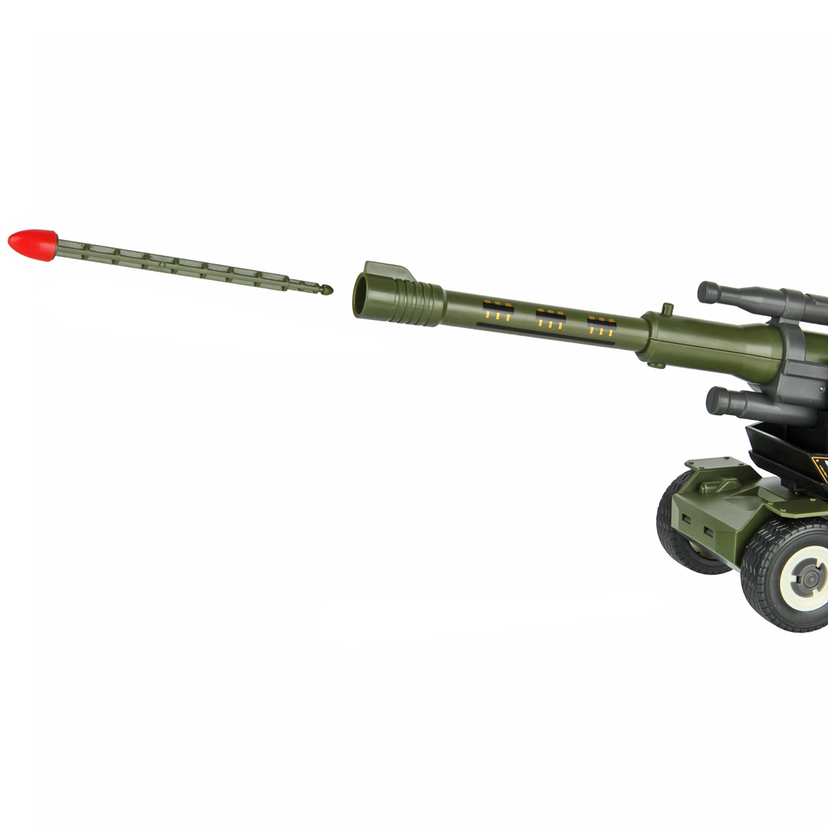 1.Ствол пушки поднимается и опускается. При нажатии на кнопку на пушке выстрелит снарядом.