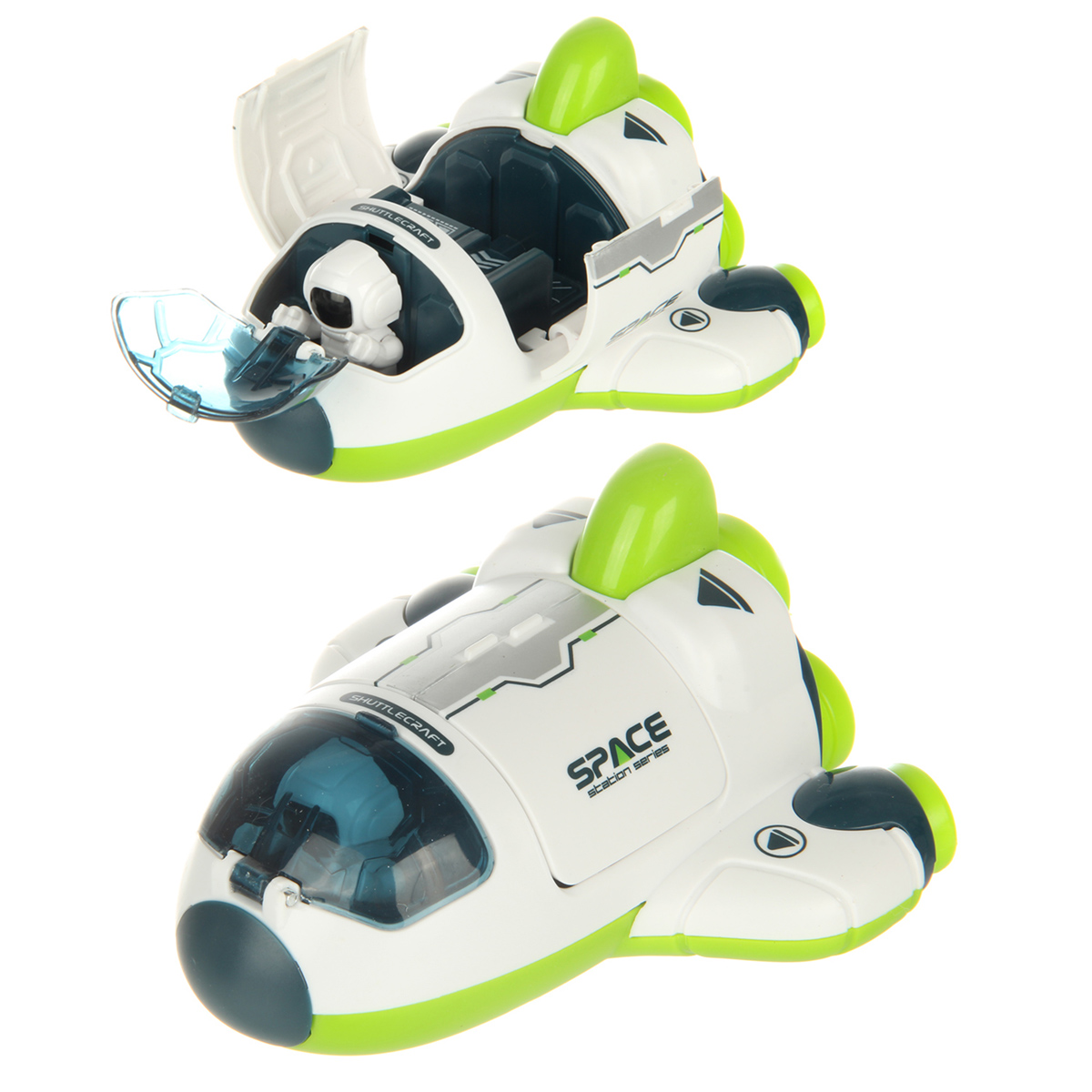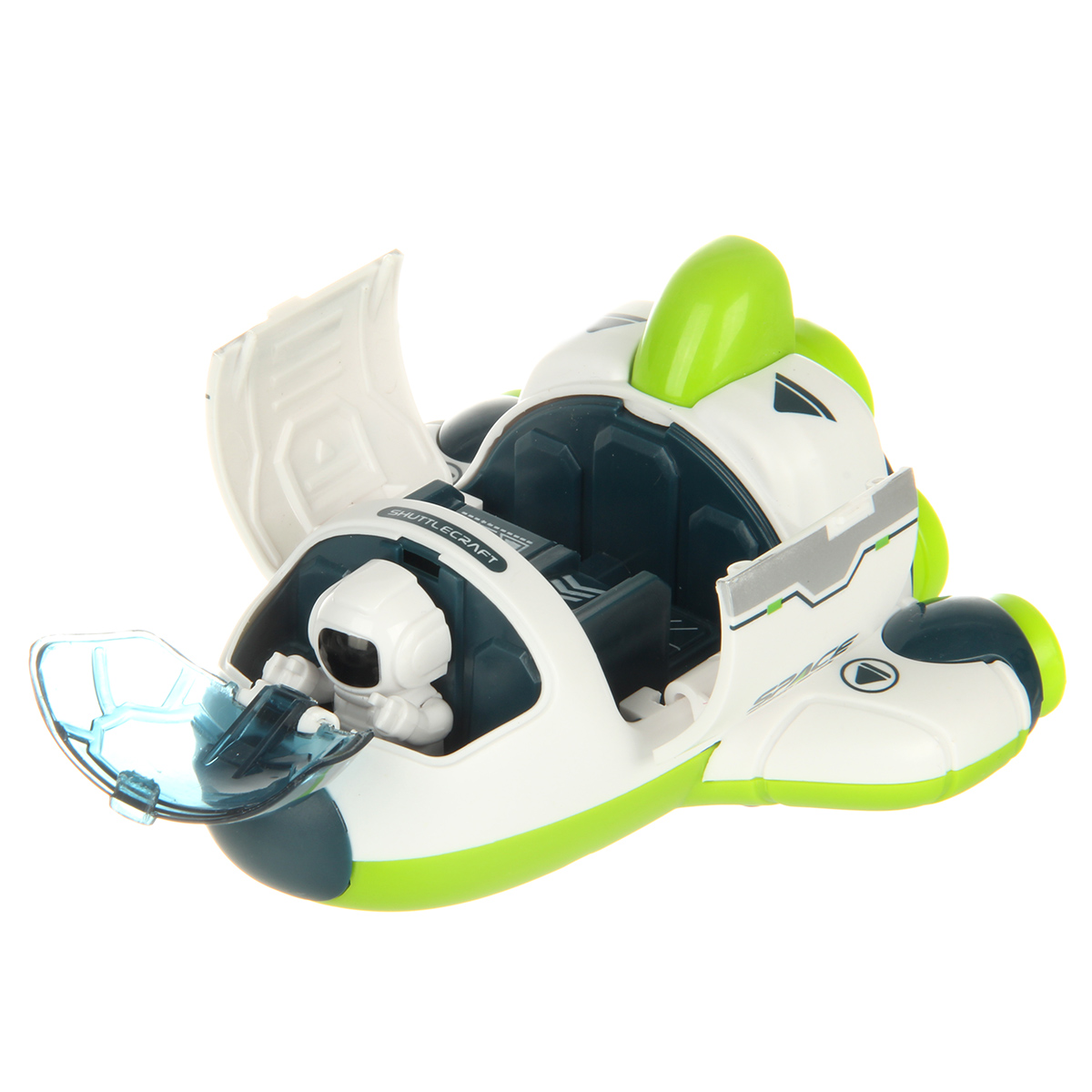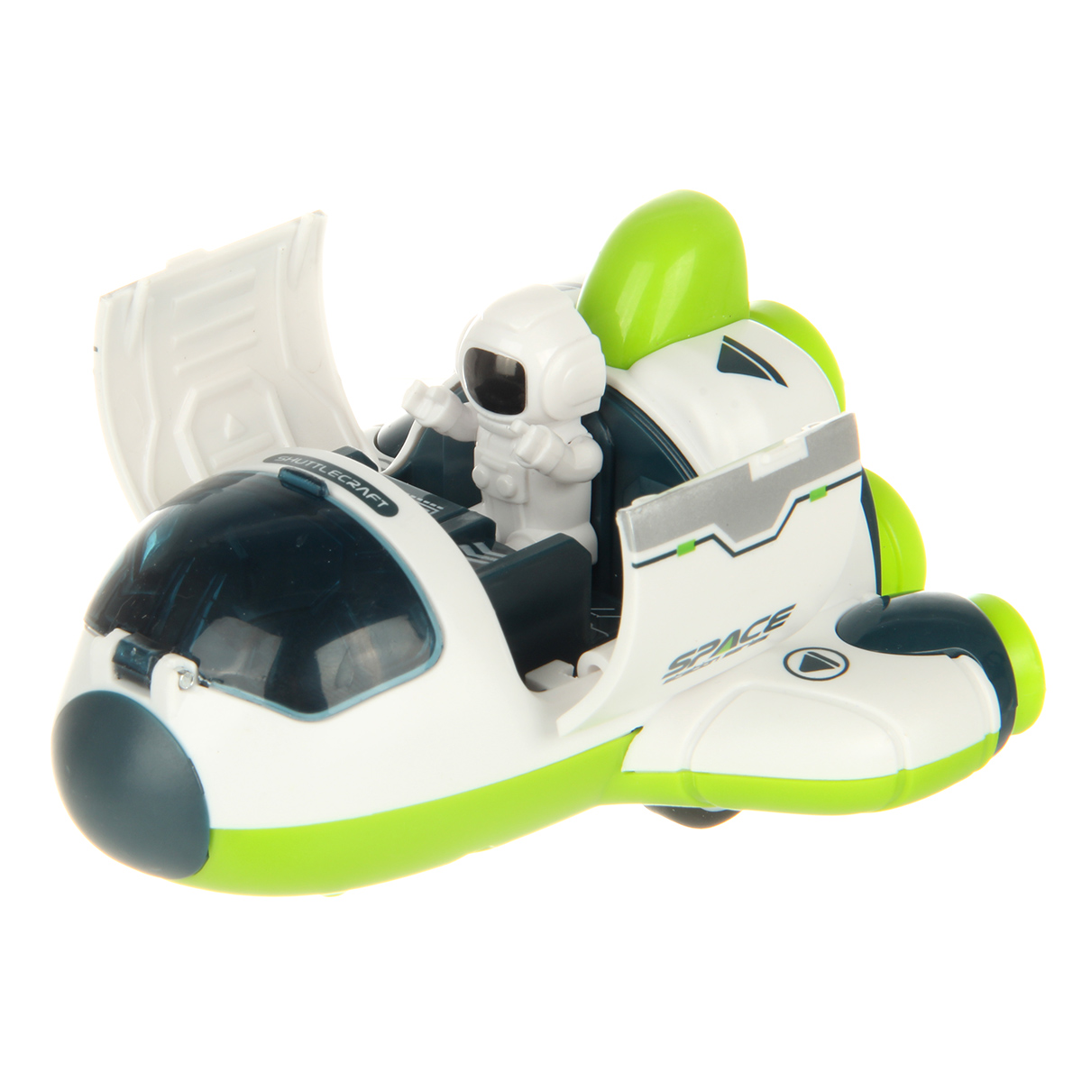 Космический корабль в качественном исполнении и с прорезиненными колесами. Игрушка изготовлена из безопасных и долговечных материалов, прослужит много лет. Корабль катается вперед и назад, оснащен фрикционным механизмом. Кабина открывается, космонавта можно вынуть. Шаттл открывается с помощью створок.