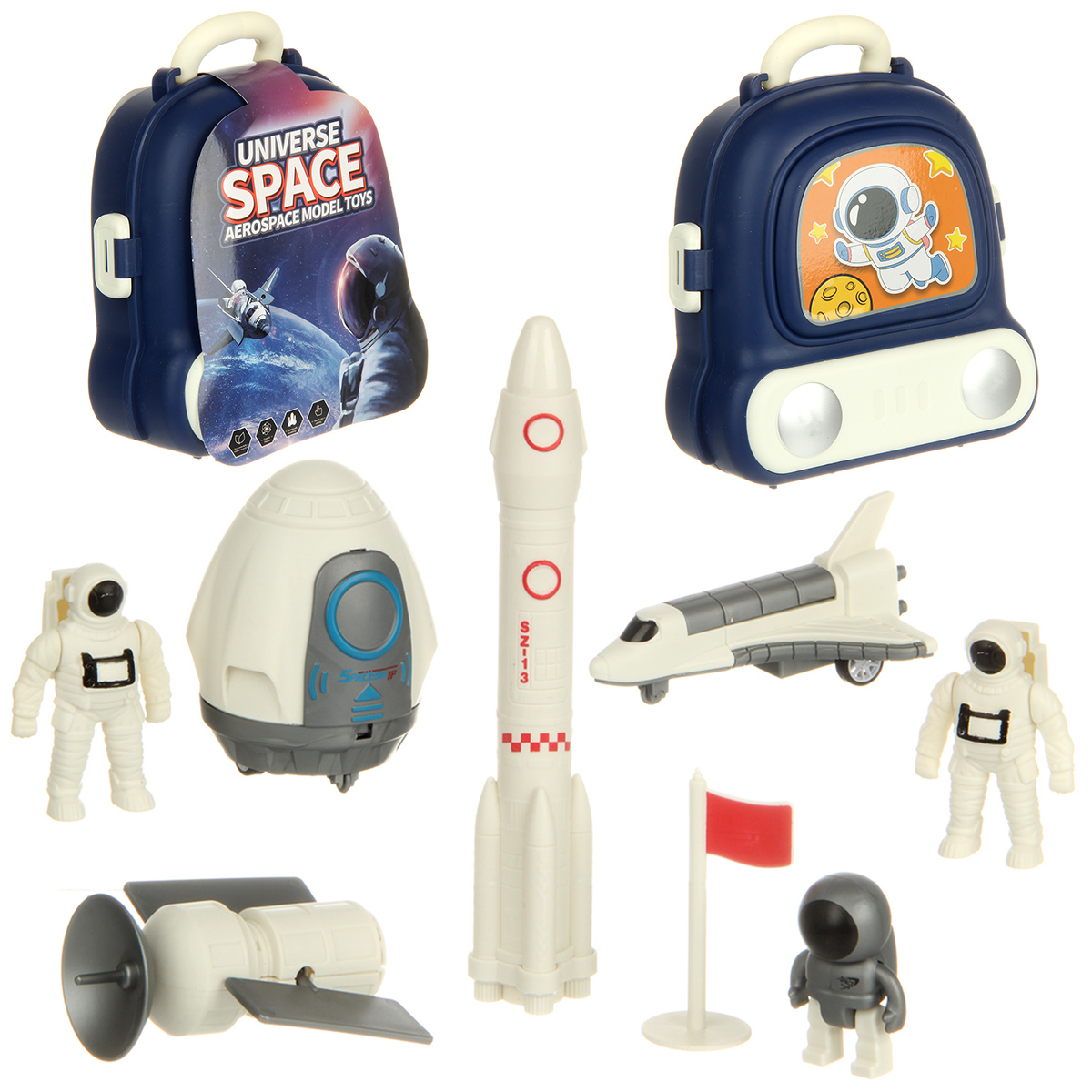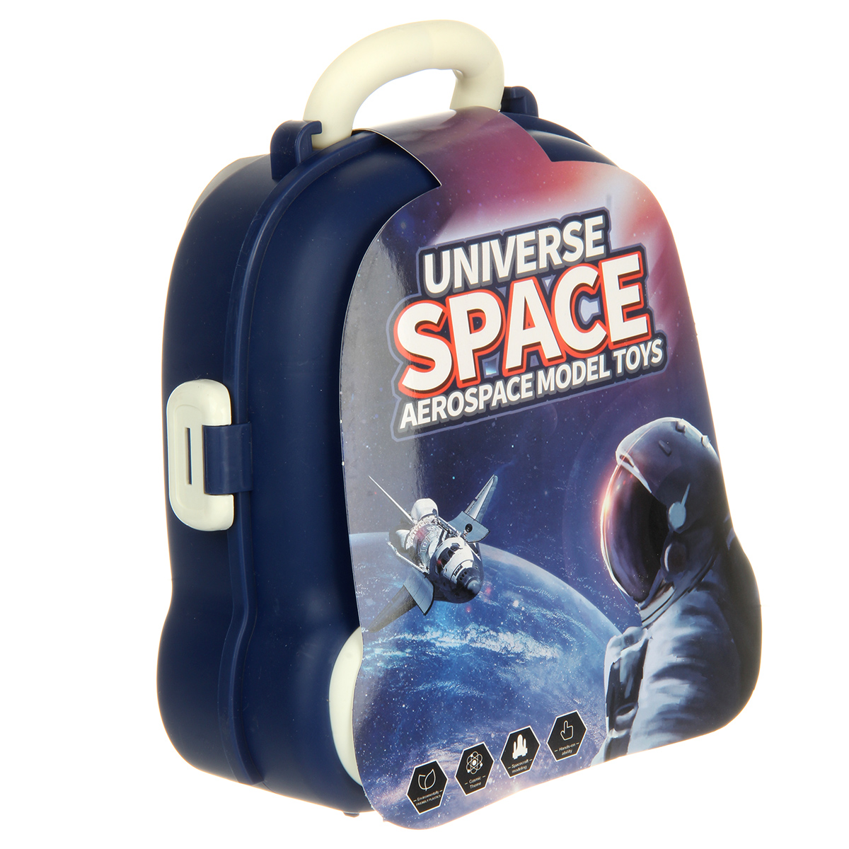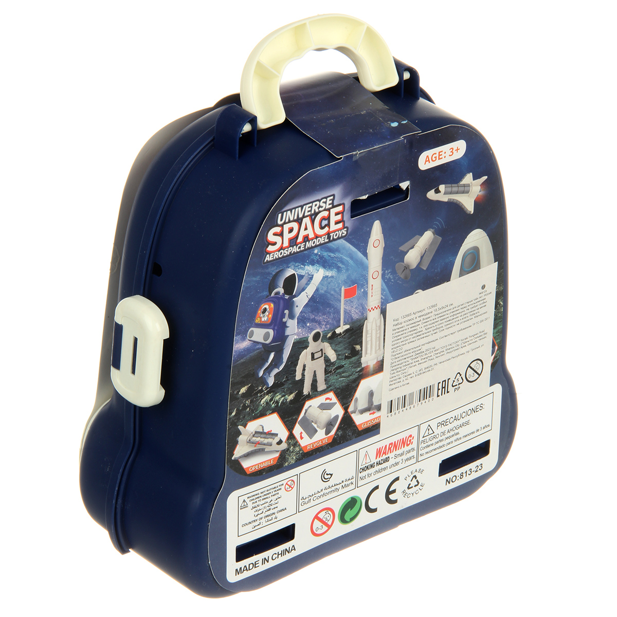 Комплектация. 2 больших космонавта, маленький космонавт, ракета, орбитальный самолет, сегмент МКС, посадочный модуль, флажок, плечевой ремешок на карабинах, чемоданчик, куда помещаются все предметы.