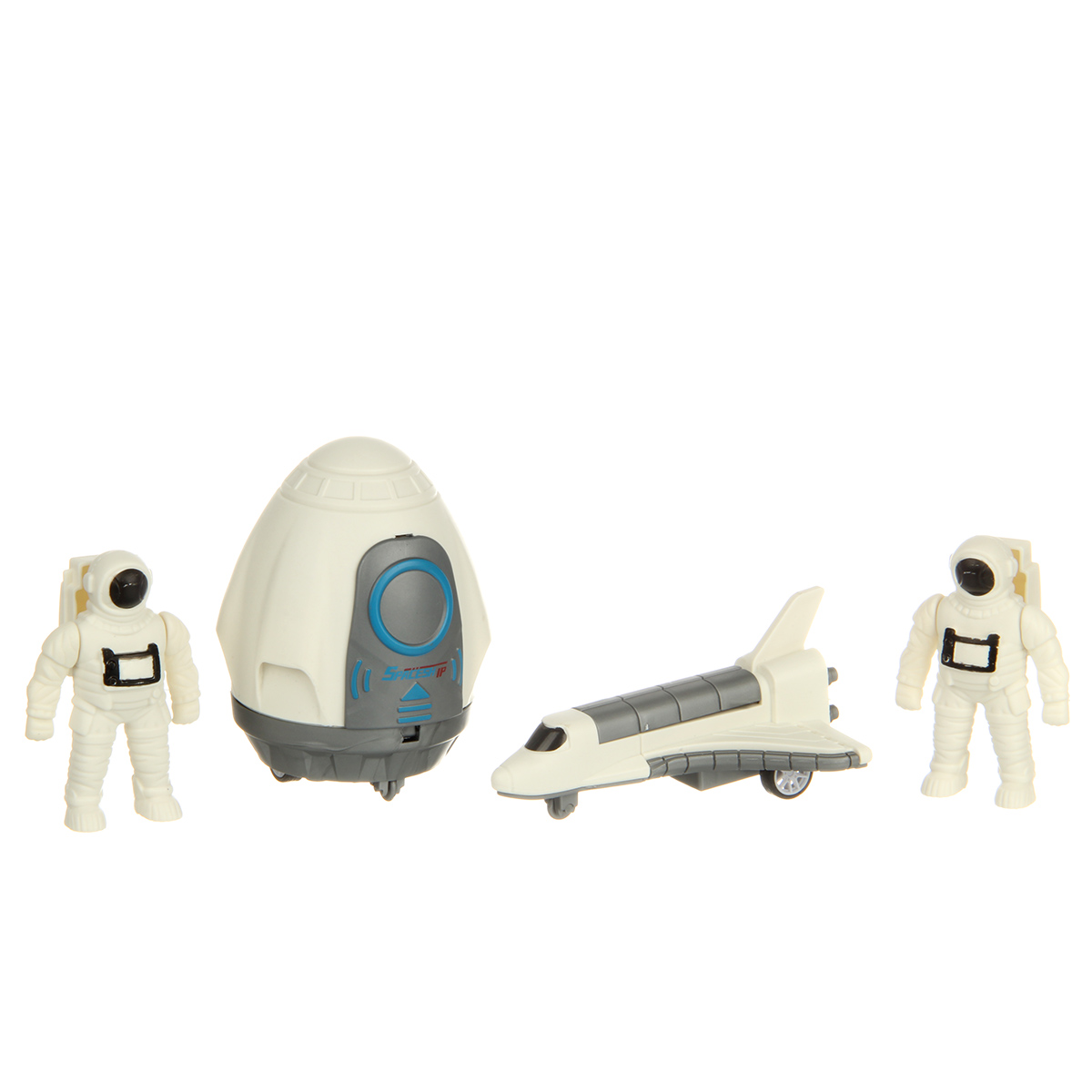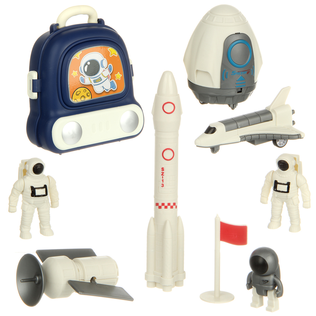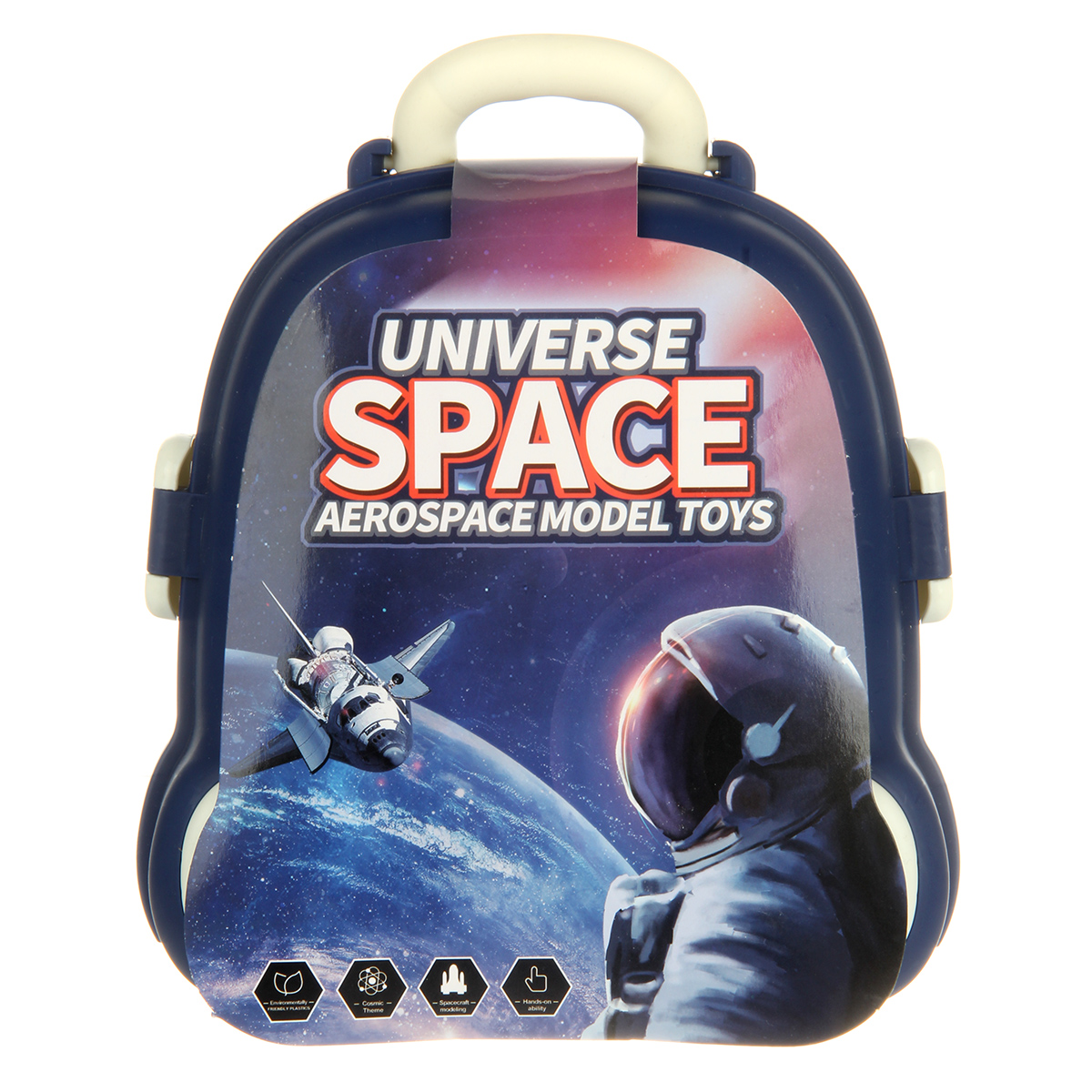 Комплектация. 2 больших космонавта, маленький космонавт, ракета, орбитальный самолет, сегмент МКС, посадочный модуль, флажок, плечевой ремешок на карабинах, чемоданчик, куда помещаются все предметы.