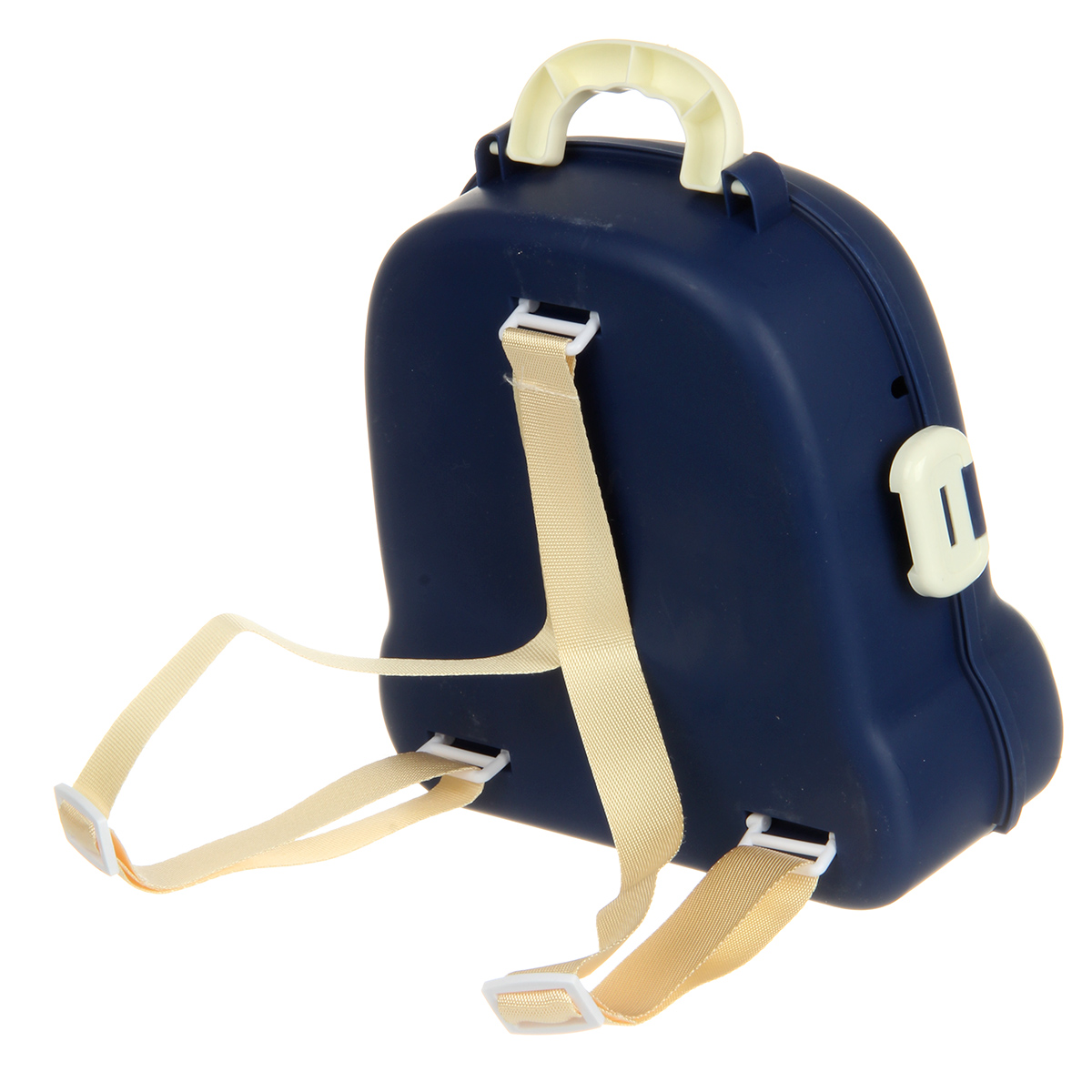 Чемоданчик открывается и закрывается, закрывается на замочки. Плечевой ремешок крепится карабинами за отверстия в задней части чемоданчика, можно носить как рюкзак. Длина ремешка регулируется. У рюкзака есть ручка, удобно носить в руках.