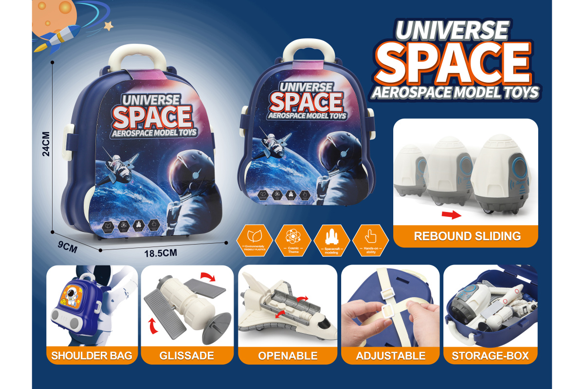 Транспорт с инерционным механизмом, сегмент МКС с крутящимися солнечными батареями, рюкзачок, в который вмещаются все предметы.