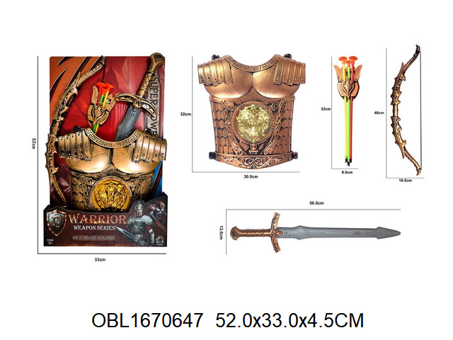 В наборе доспех, меч, лук, держатель для стрел с 3 стрелами.