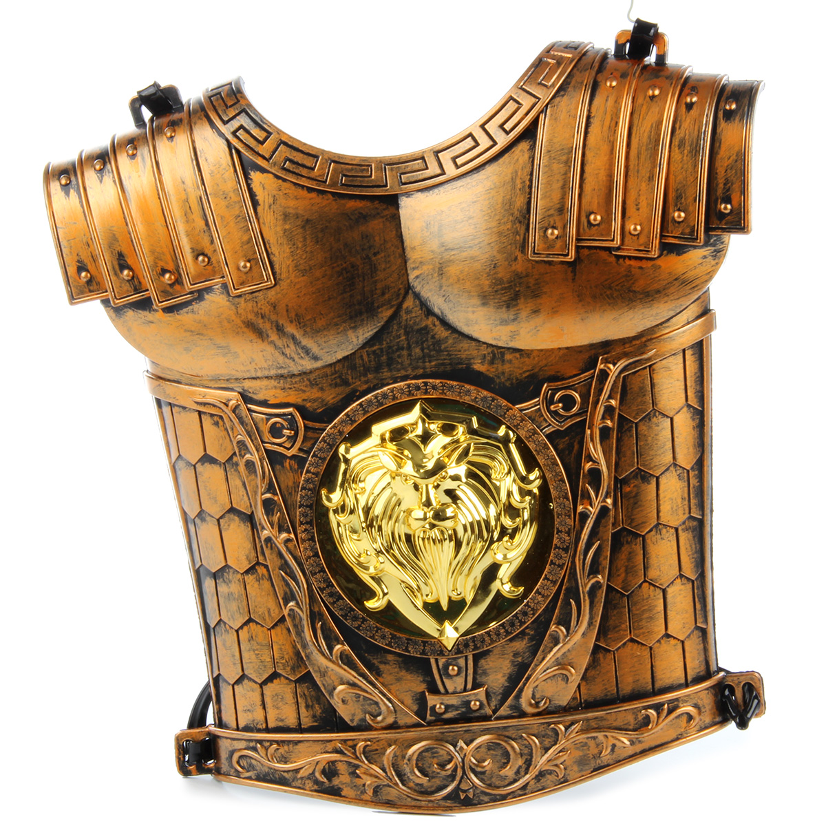 У доспеха с обратной стороны есть лямки, можно закрепить доспех на груди.
