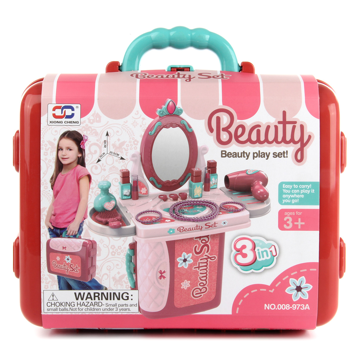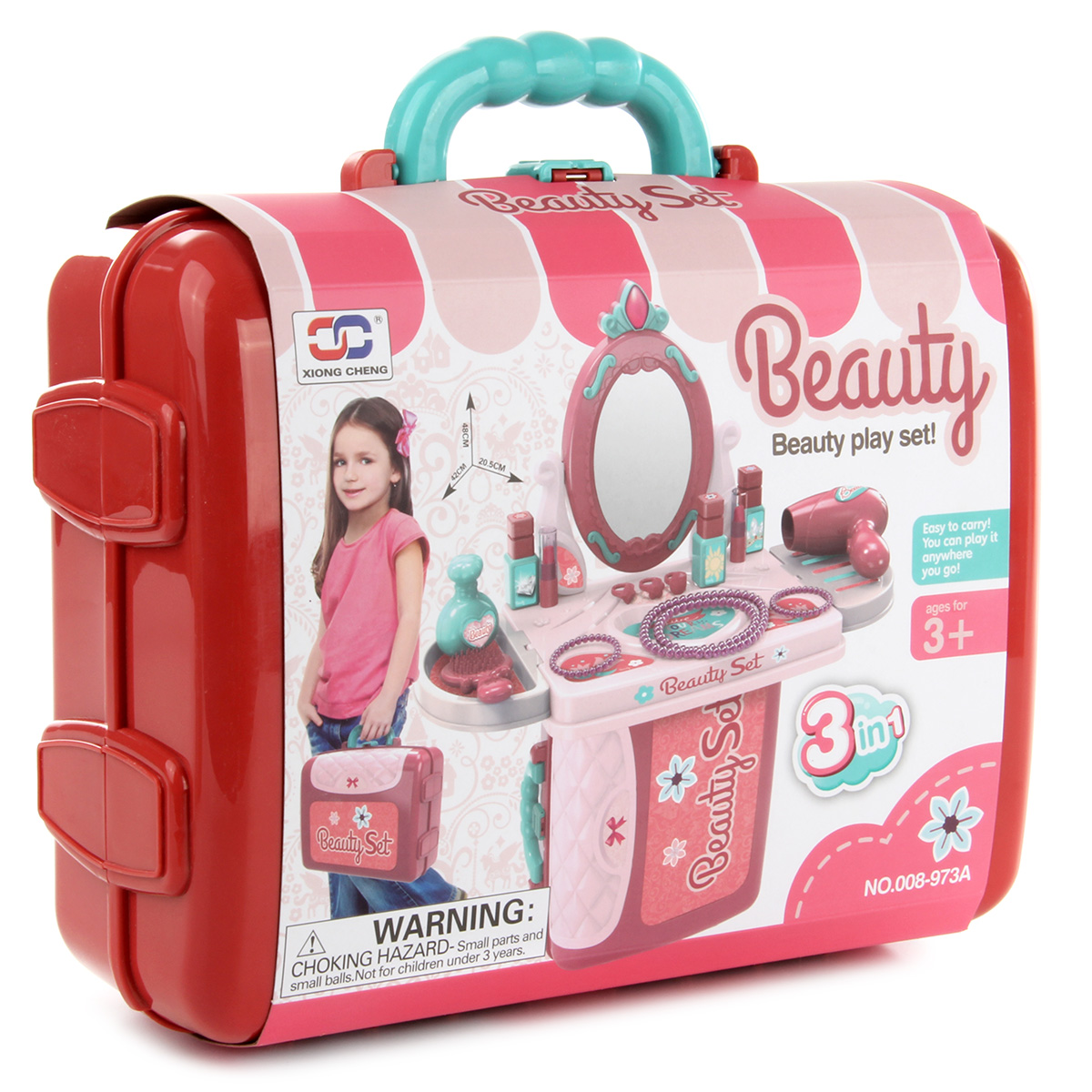 Чемоданчик можно собрать двумя способами - в виде стойки и в виде стола, чемоданчик закрывается на защелку, есть ручка, удобно переносить. Зеркало крутится, у тюбиков-имитации губной помады и флакончиков-имитации лаков снимаются колпачки, ожерелье и браслеты не растягиваются.