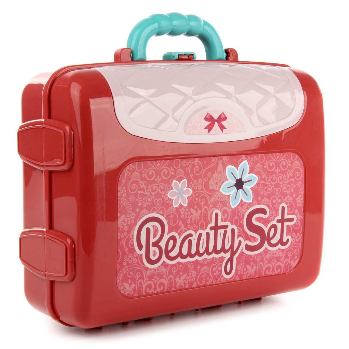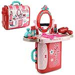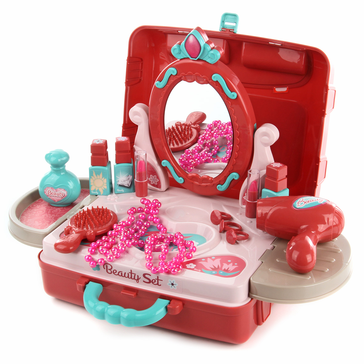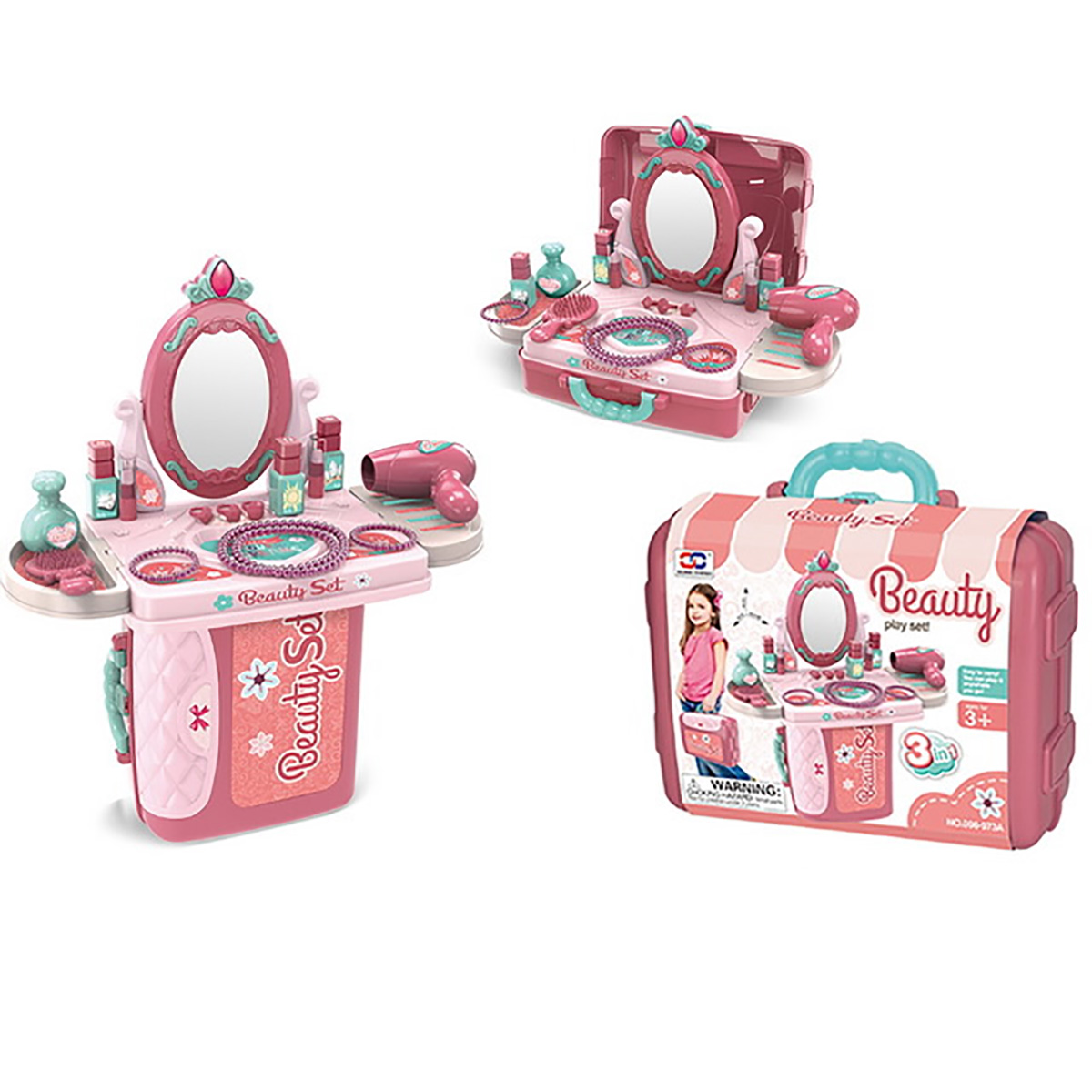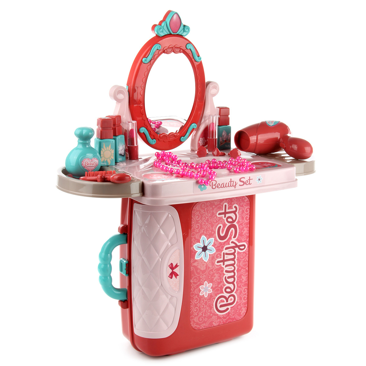 В комплект входят рабочая панель, две подставки, крепящиеся по бокам рабочей панели, зеркало, устанавливающееся на рабочую панель, 3 флакончика-имитации лака для ногтей, 2 тюбика-имитации губной помады, фен, флакончик-имитация духов, расческа, 2 браслетика, ожерелье, 3 кольца, набор стикеров и чемоданчик, в который помещаются все предметы.