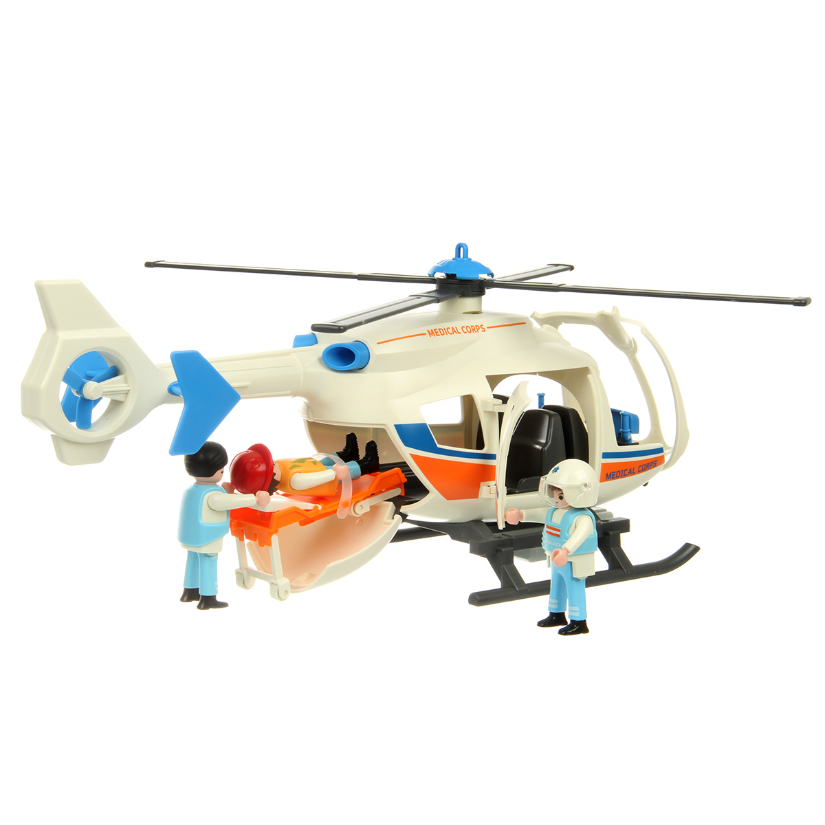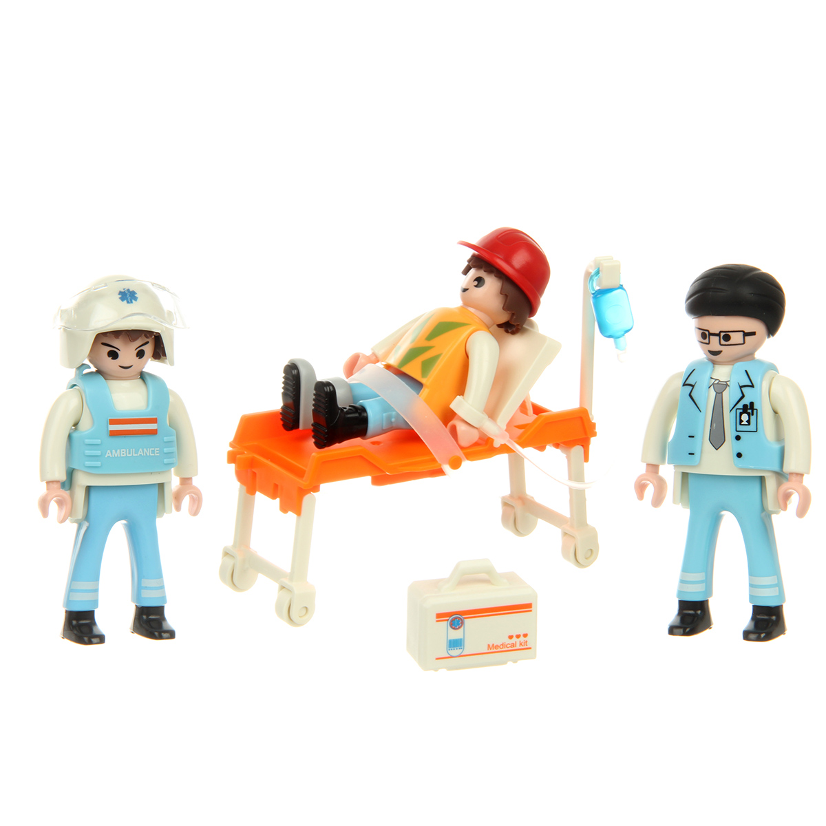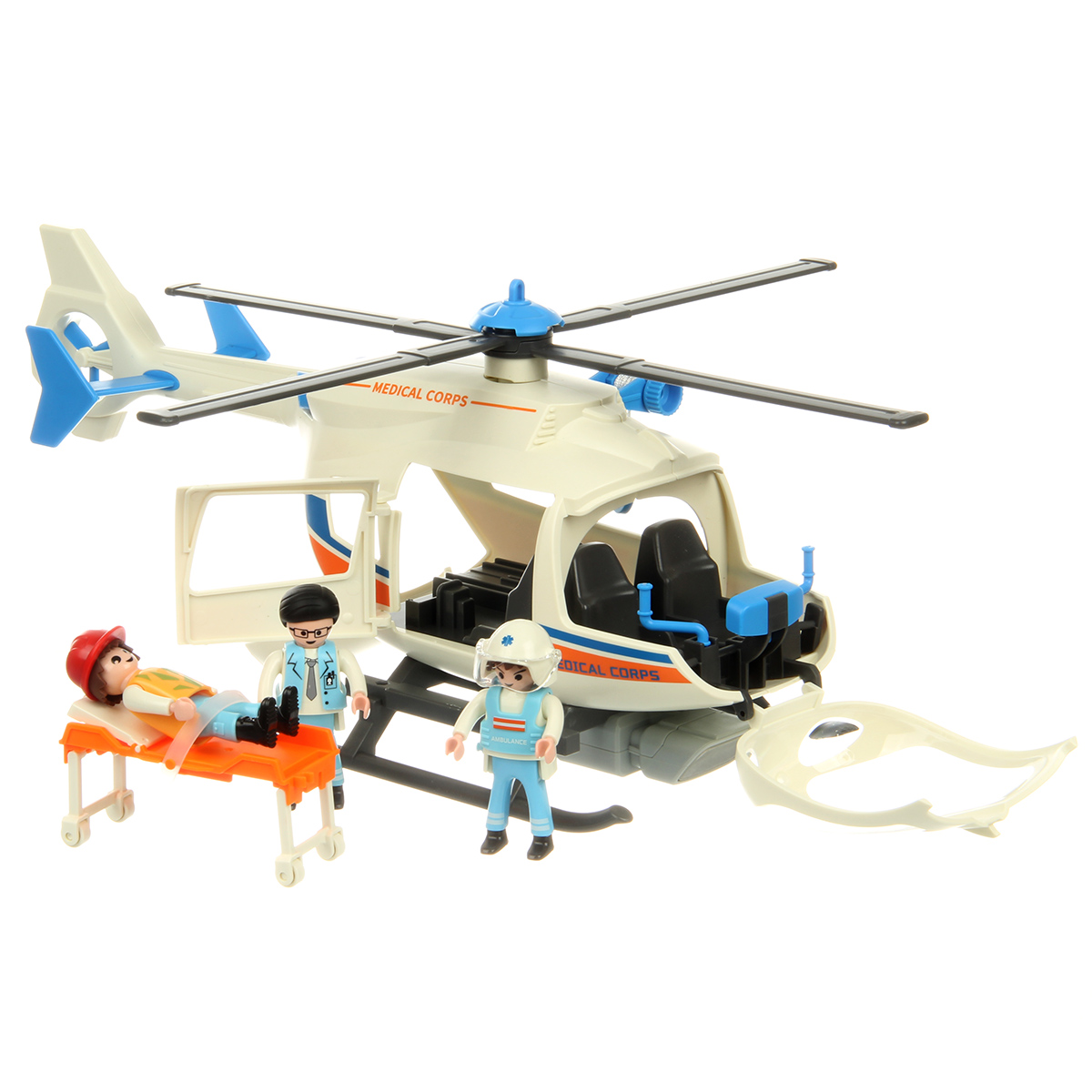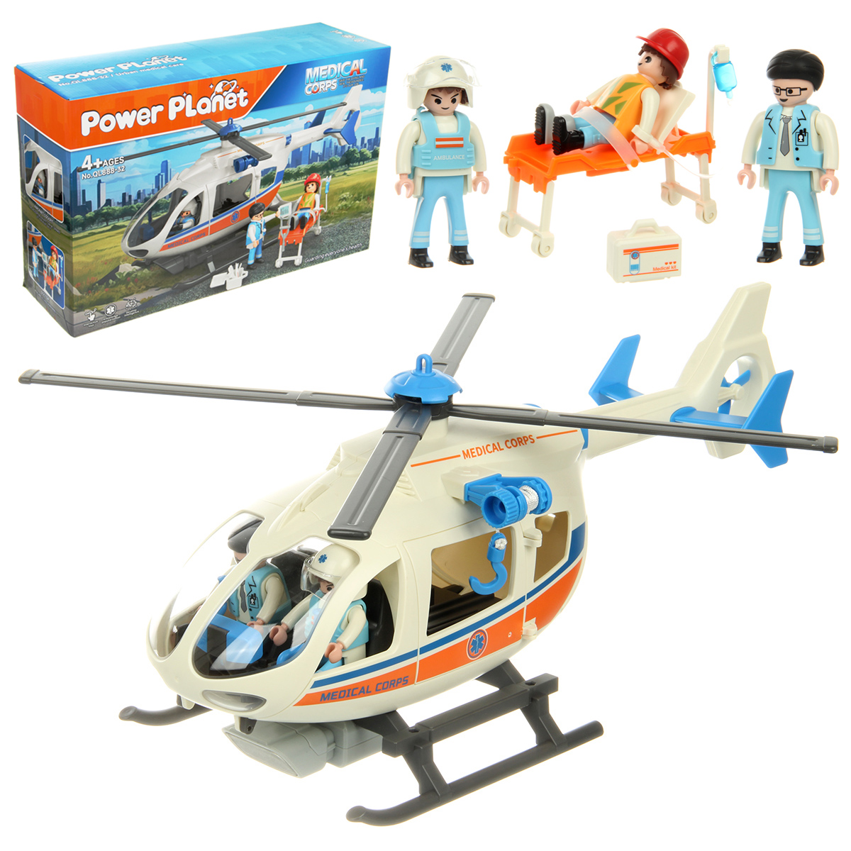 В наборе детали для сборки вертолета, детали для сборки 3 человечков, носилки каталка, медицинские инструменты, чемоданчик, планшет, инструкция по сборке.