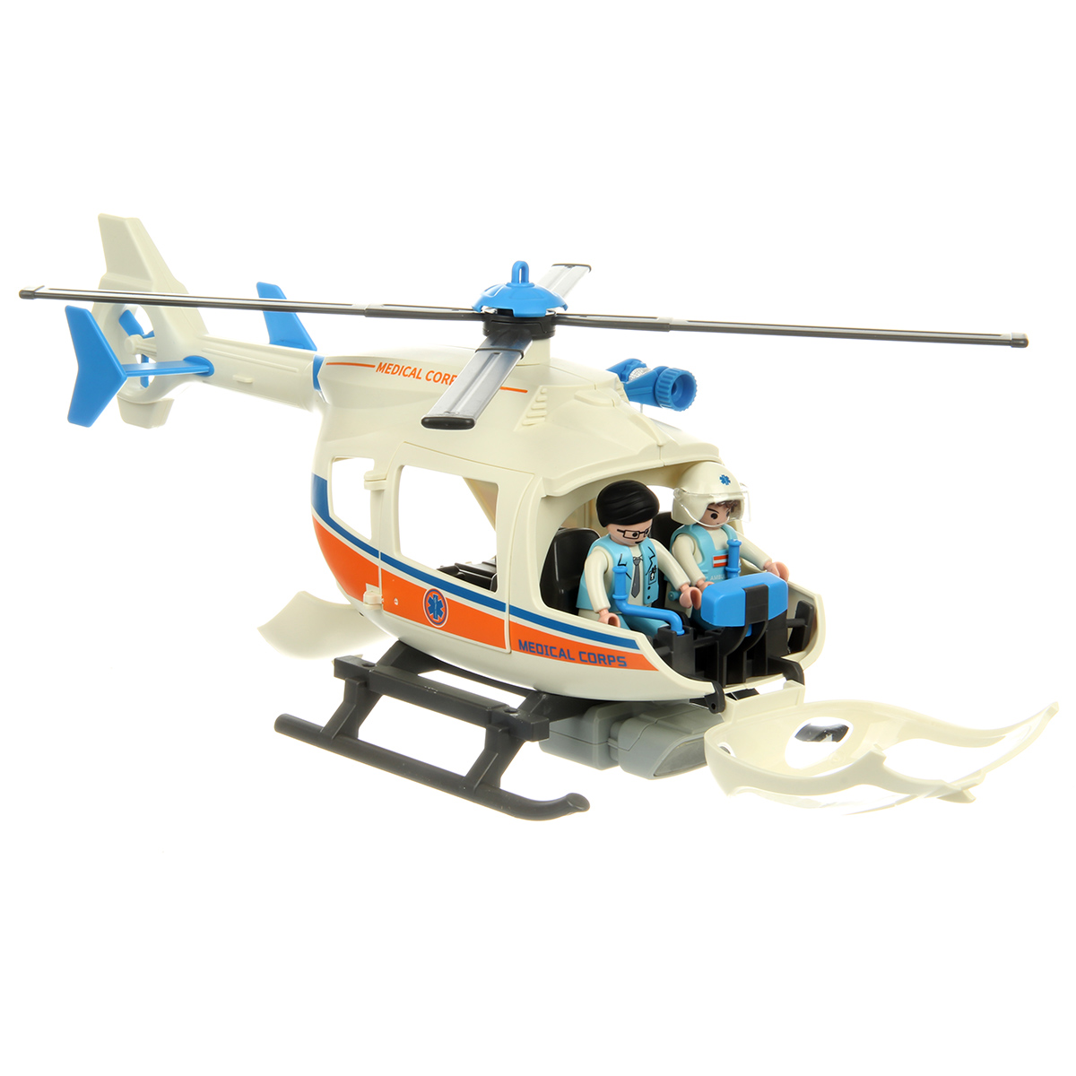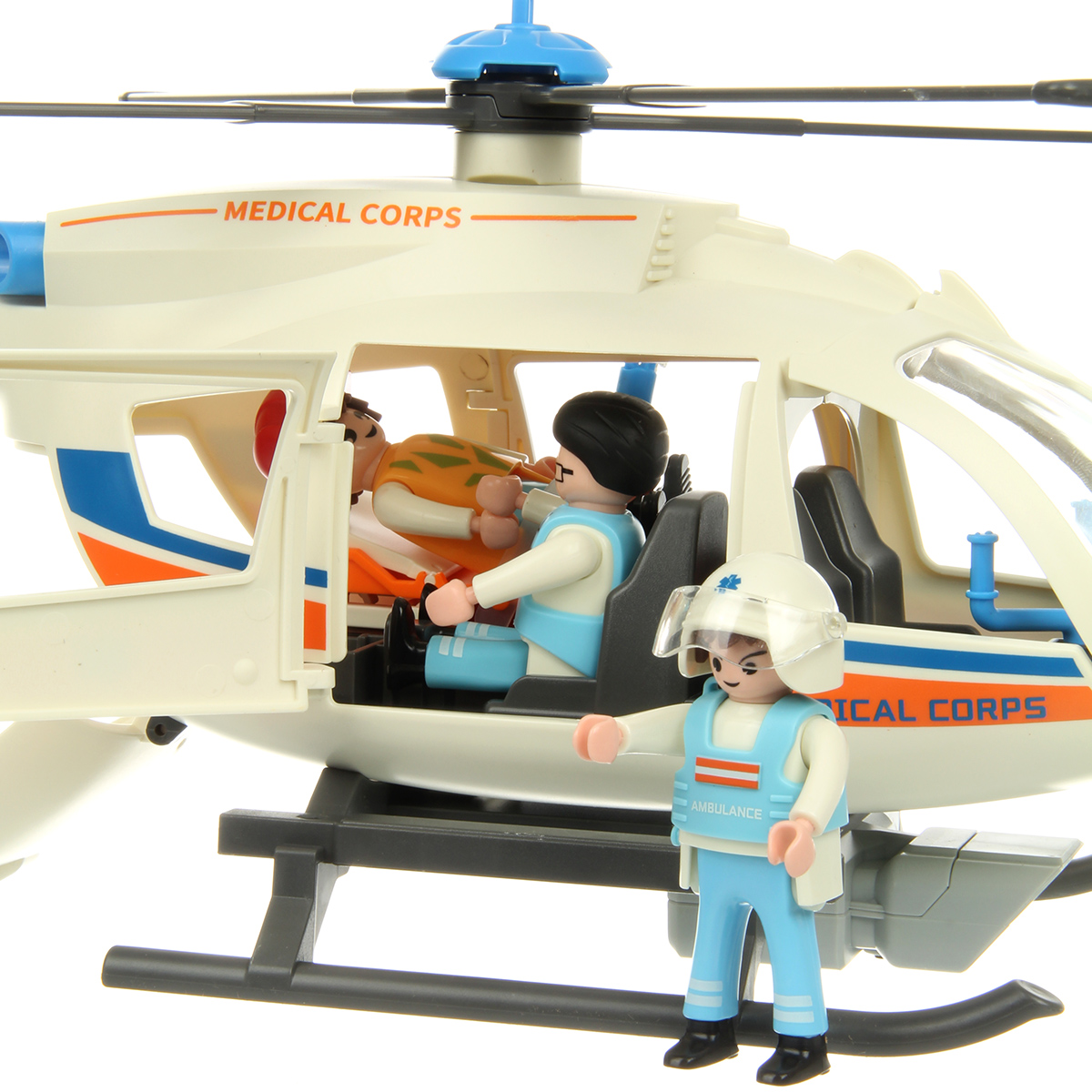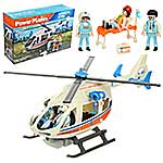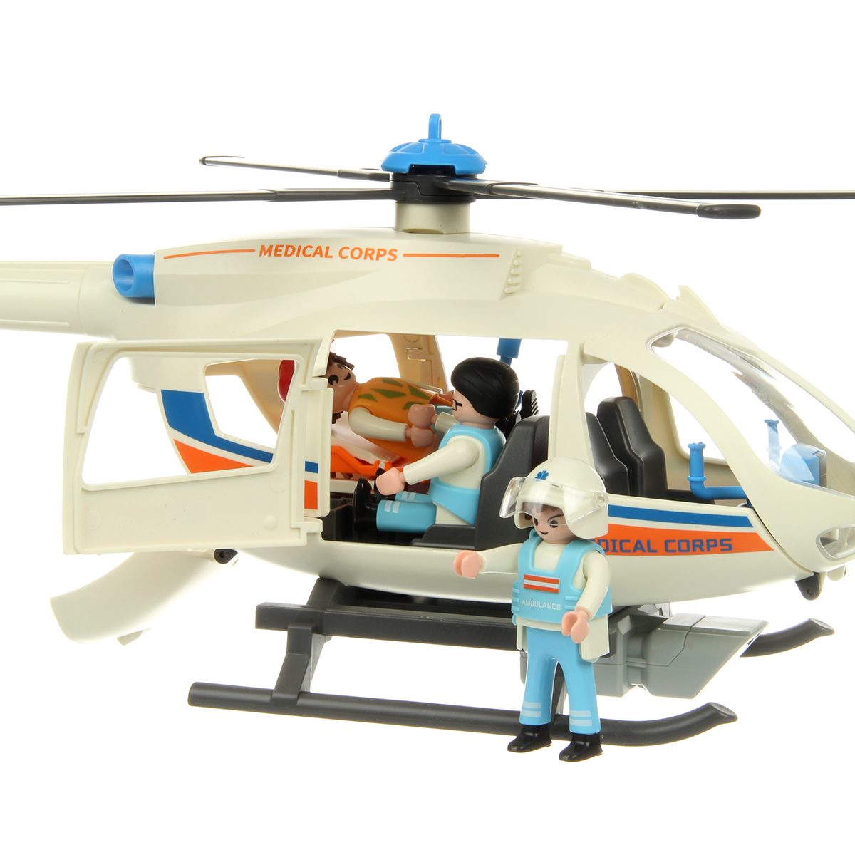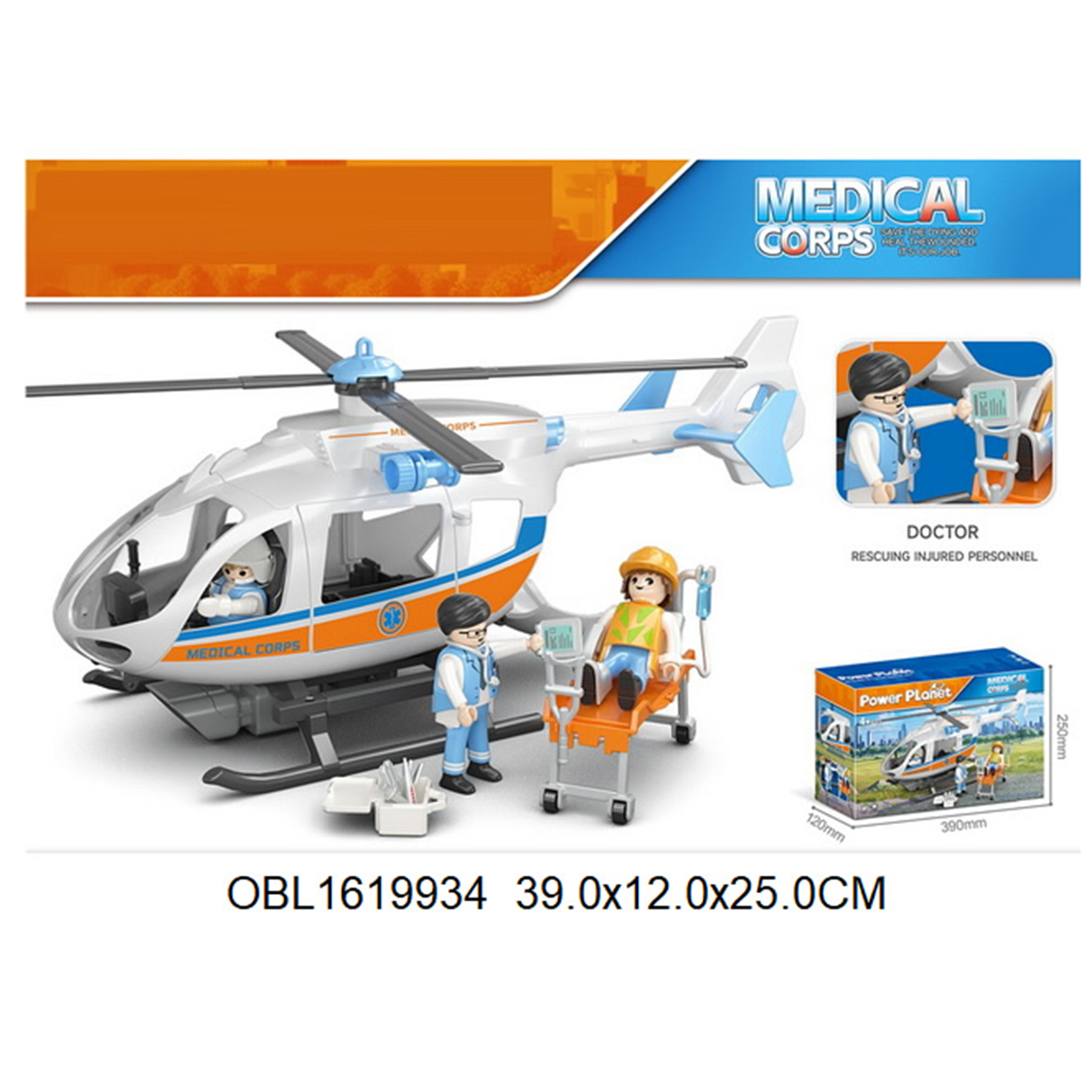 В наборе детали для сборки вертолета, детали для сборки 3 человечков, носилки каталка, медицинские инструменты, чемоданчик, планшет, инструкция по сборке.
