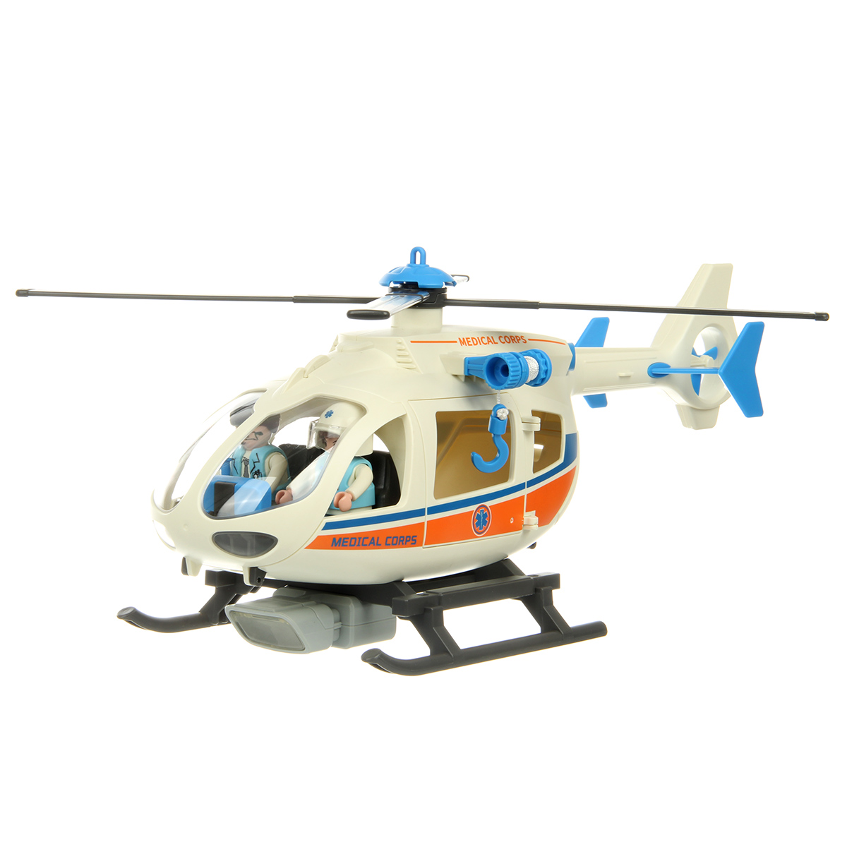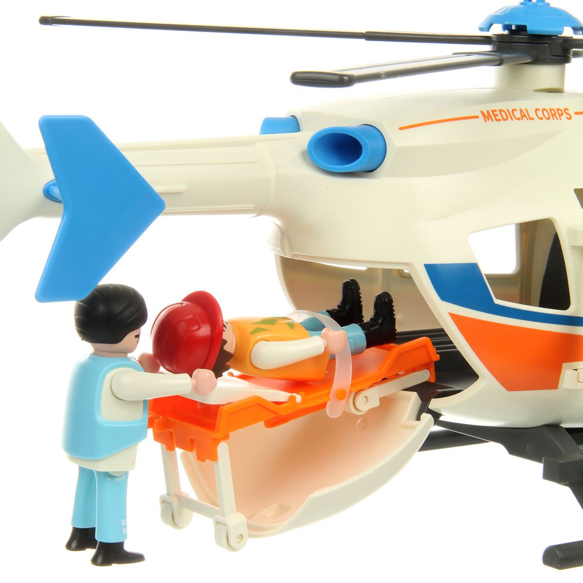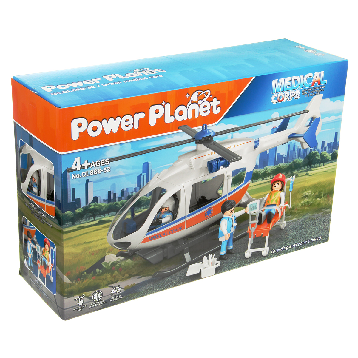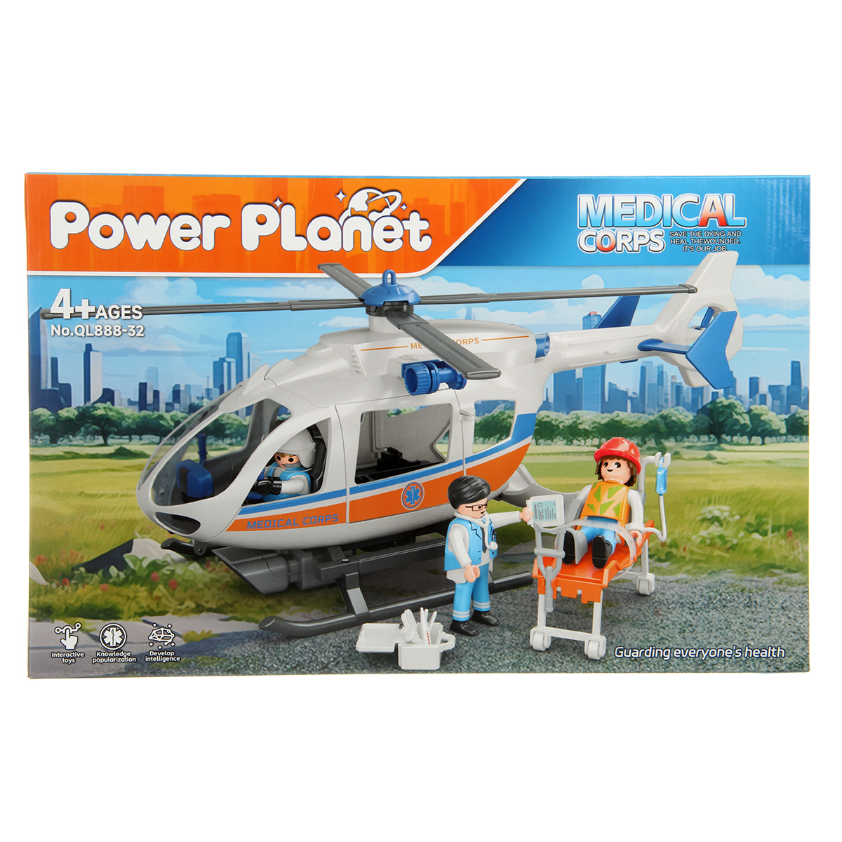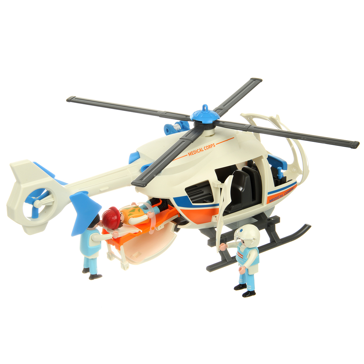 В наборе детали для сборки вертолета, детали для сборки 3 человечков, носилки каталка, медицинские инструменты, чемоданчик, планшет, инструкция по сборке.