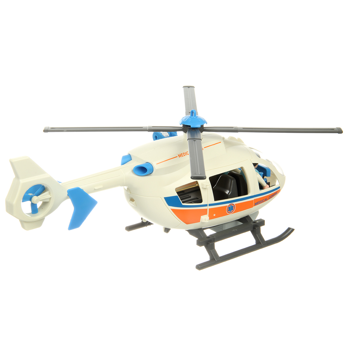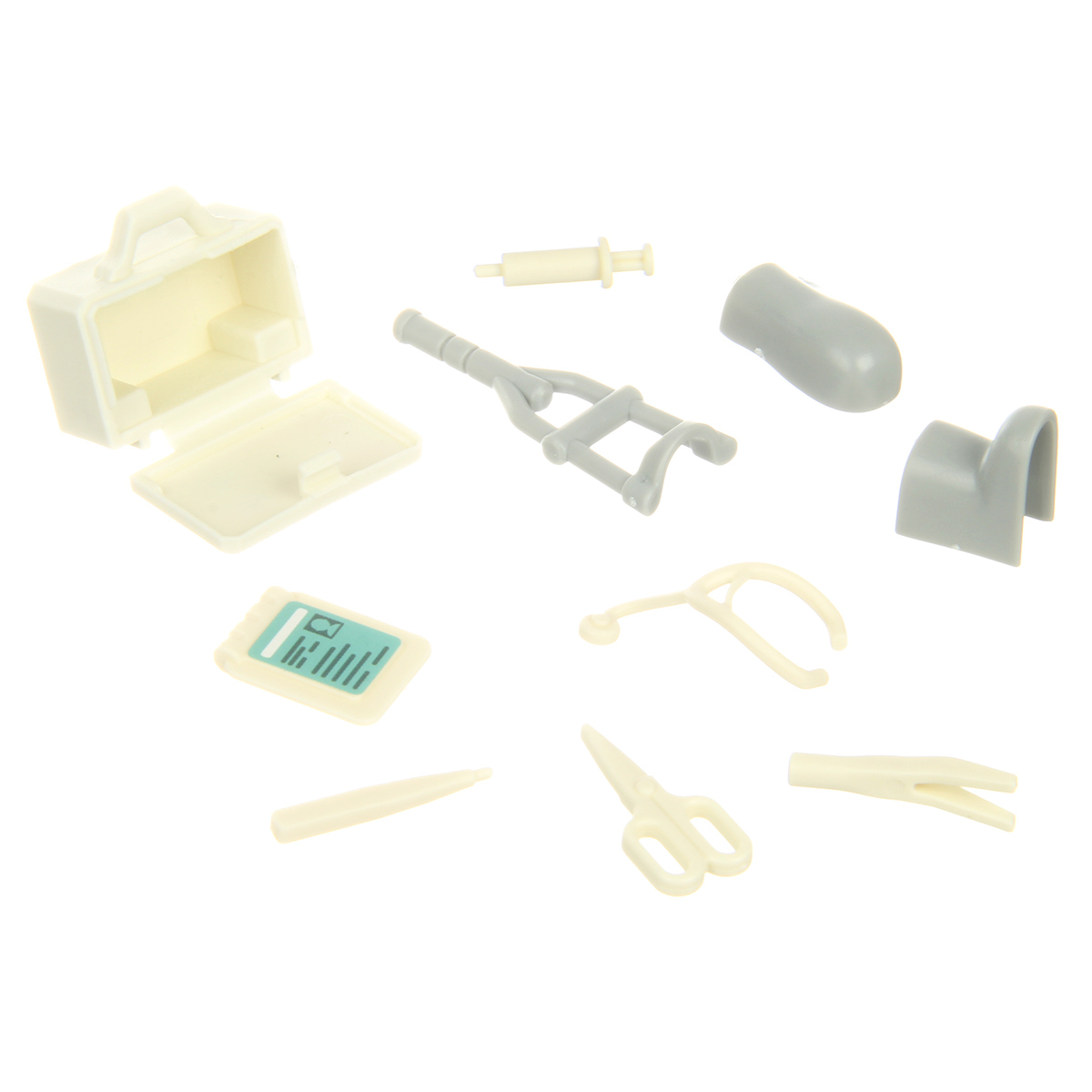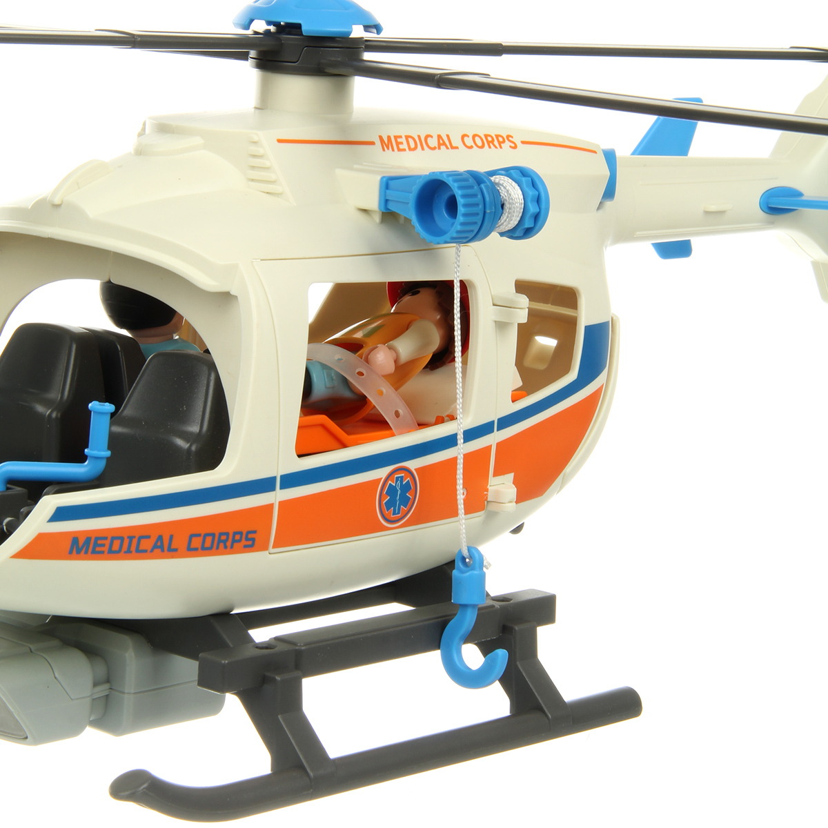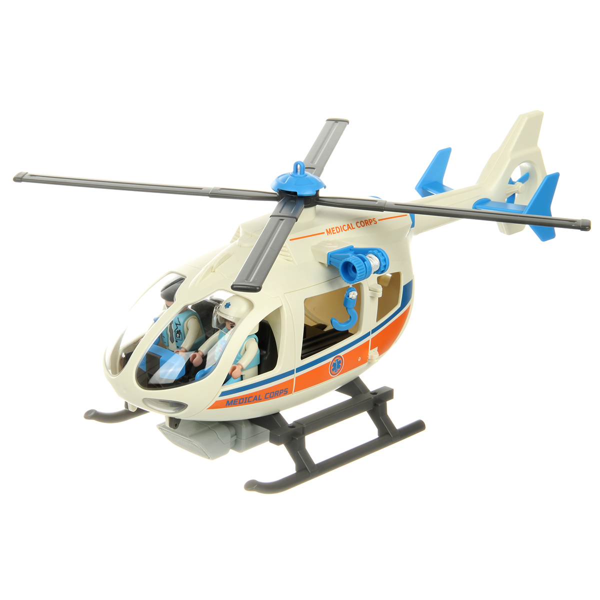 В наборе детали для сборки вертолета, детали для сборки 3 человечков, носилки каталка, медицинские инструменты, чемоданчик, планшет, инструкция по сборке.