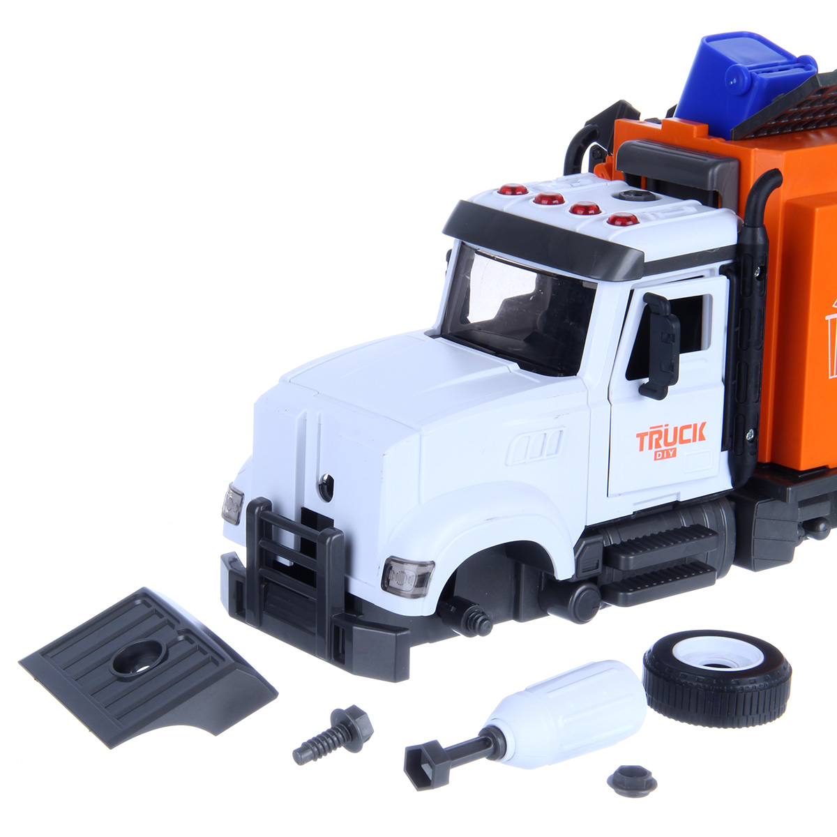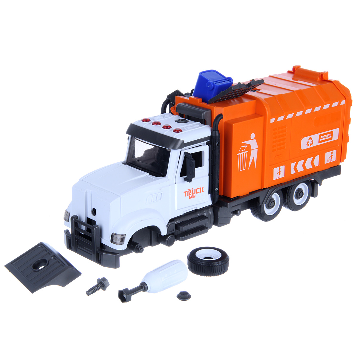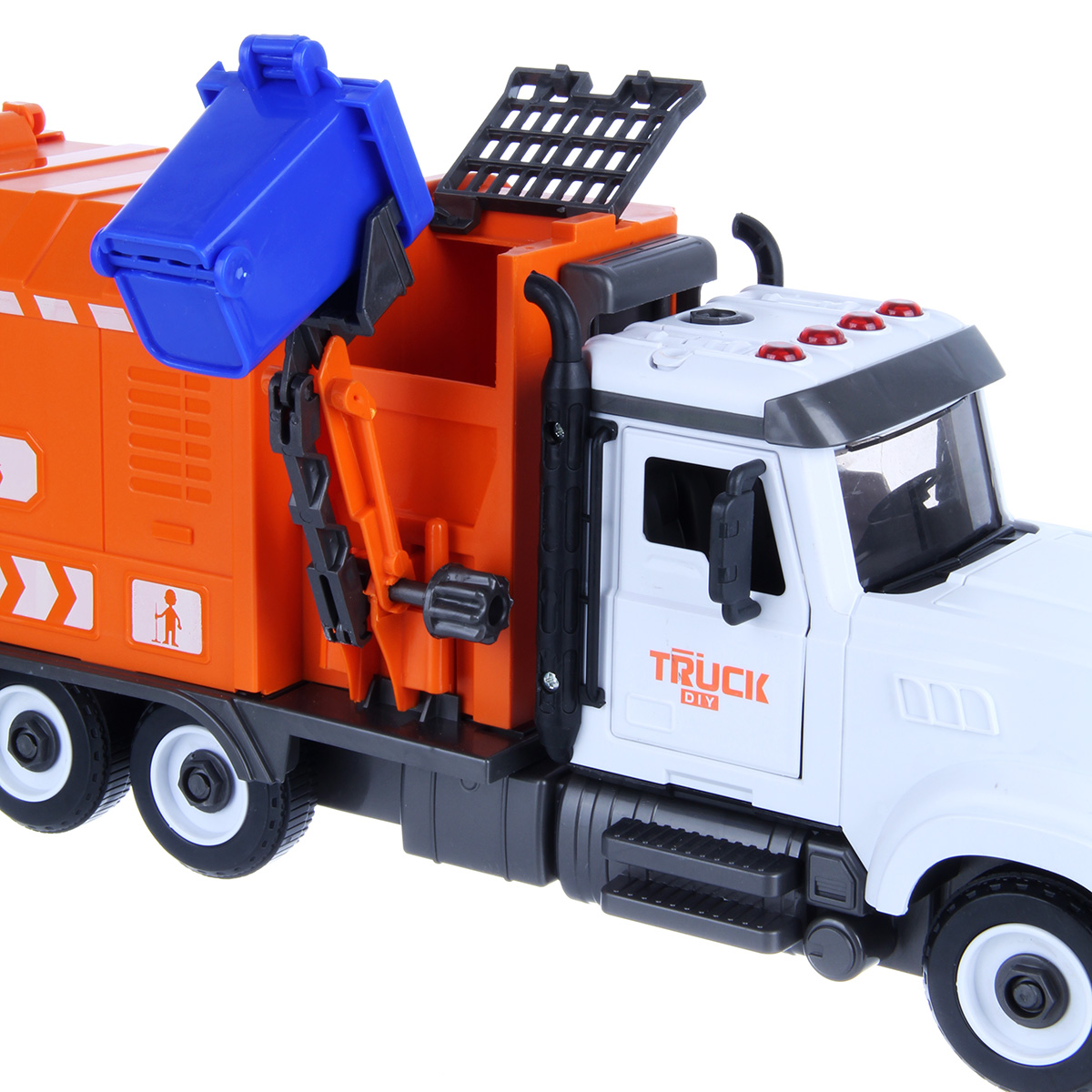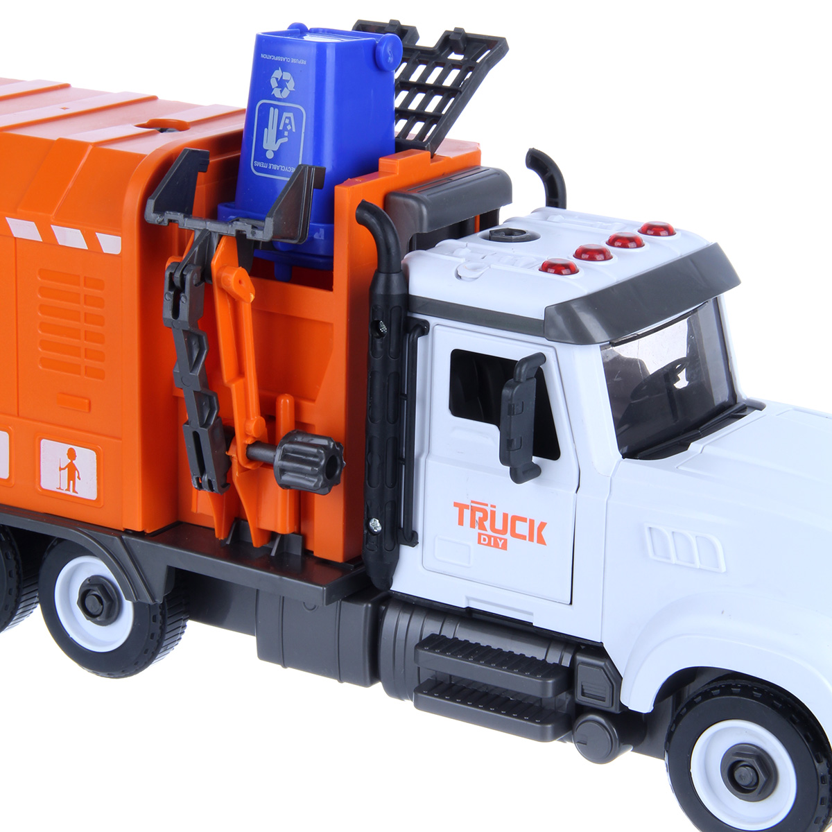 Полностью разборный конструктор скрутка мусоровоз со световыми и звуковыми эффектами. Машина издает звуки заднего хода, гудка, двигателя, проигрывает мелодию, разноцветная подсветка кабины. Движение вперёд и назад, фрикционный механизм, открывающиеся дверцы кабины, задний борт поднимается и опускается, крышка мусоросборника поднимается, площадка машинки подходит для сборки на ней фигурок из классического лего. Есть специальный механизм для перемещения мусорного бака, при вращении рычага стрела механизма поднимается и опускается, можно прикрепить мусорный бак. В наборе отвертка со сменными насадками, можно вкручивать болты, мусорный бак с открывающейся крышкой. Игрушечный мусоровоз изготовлен из прочных и безопасных материалов в качественном исполнении с вниманием к деталям.