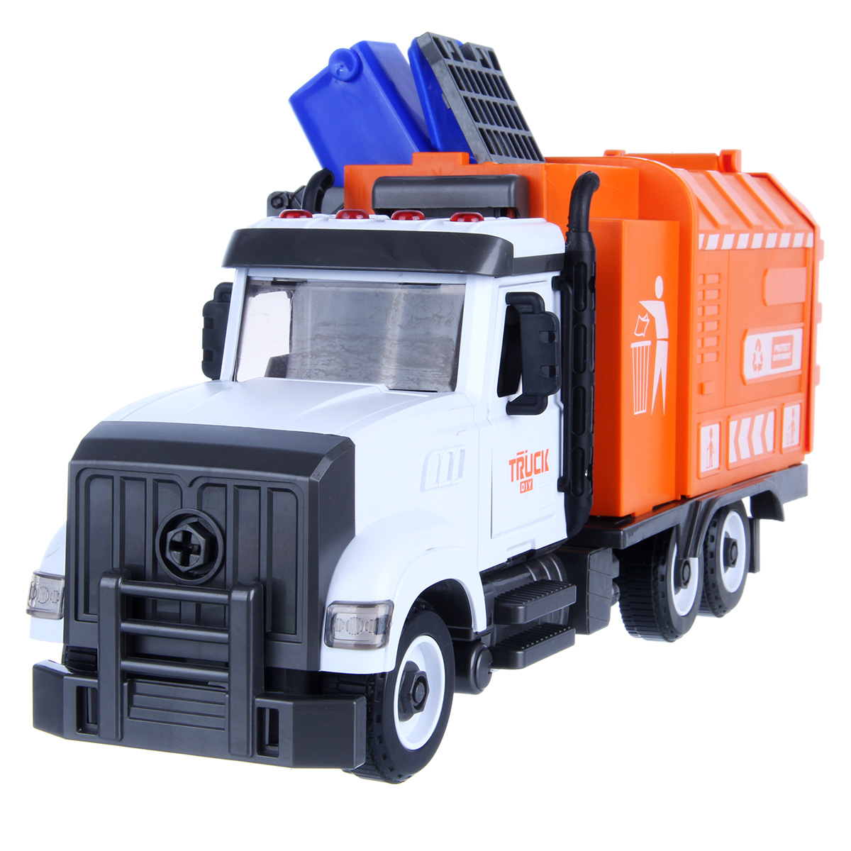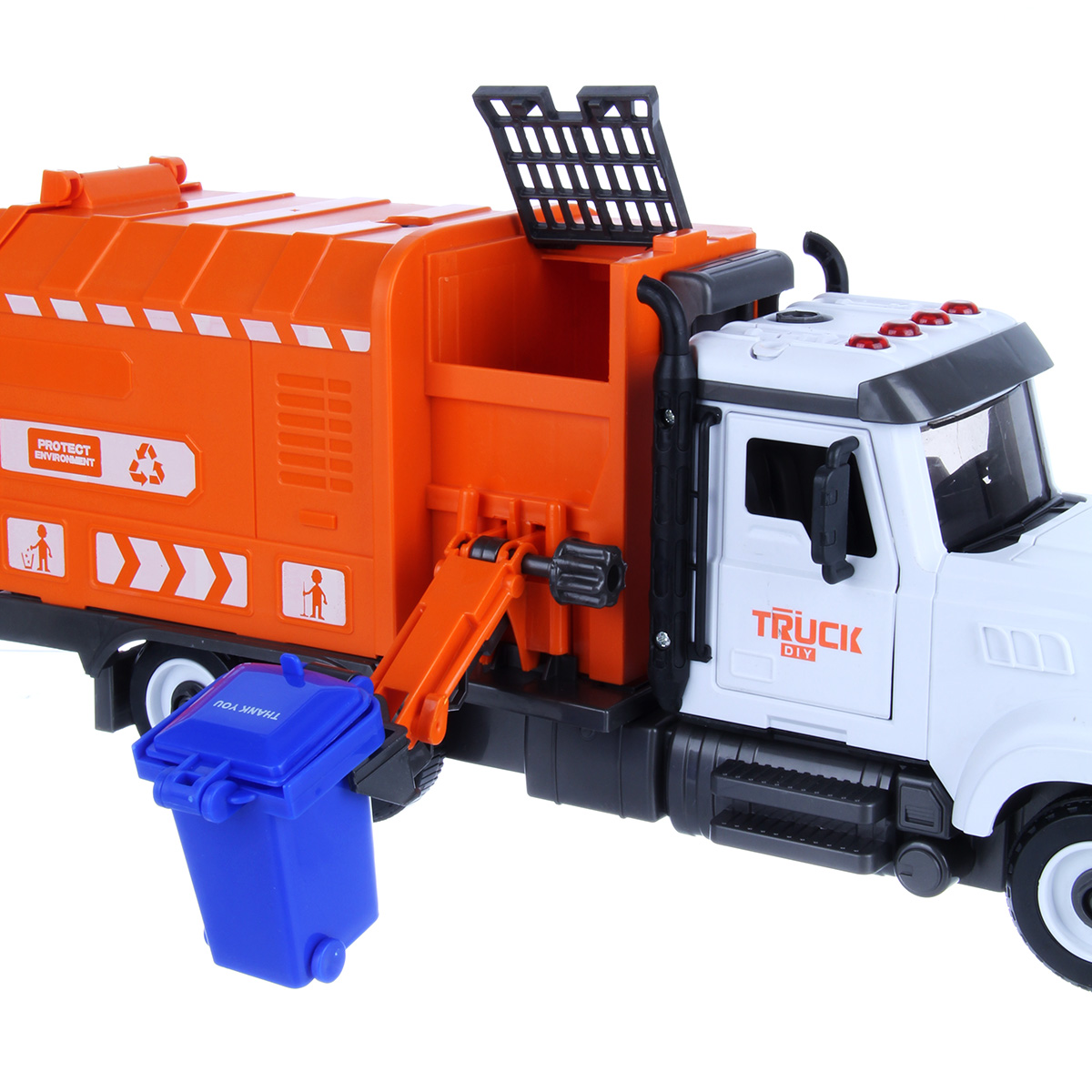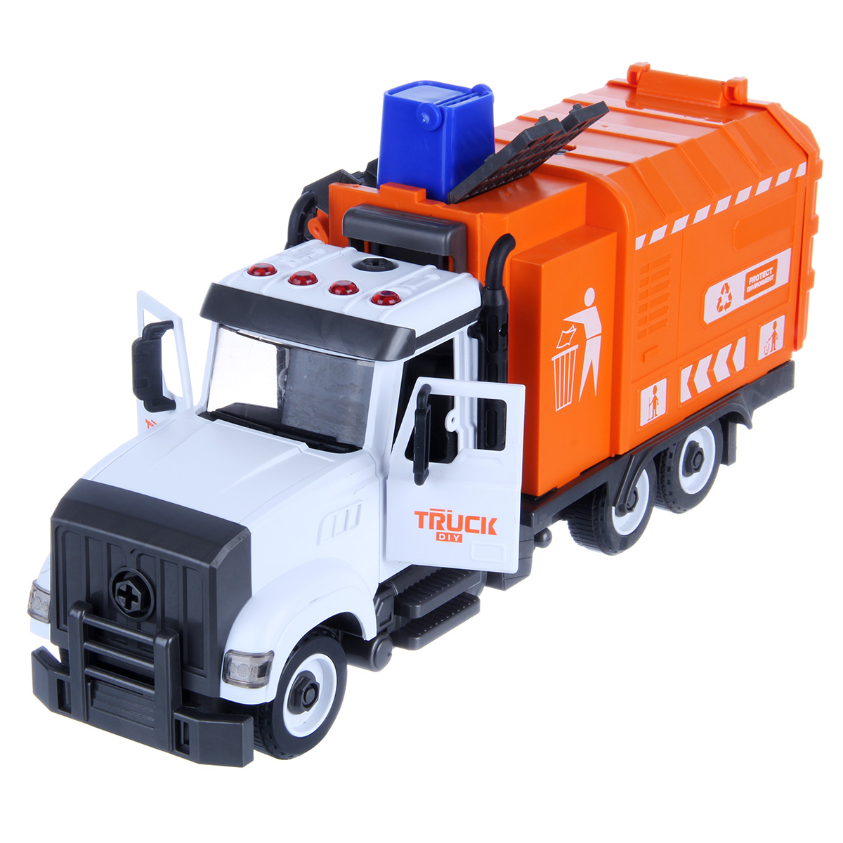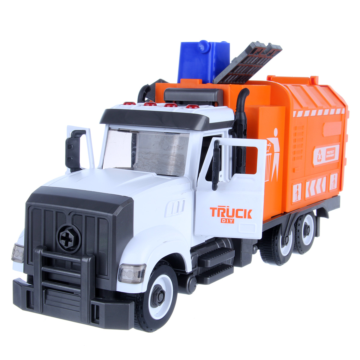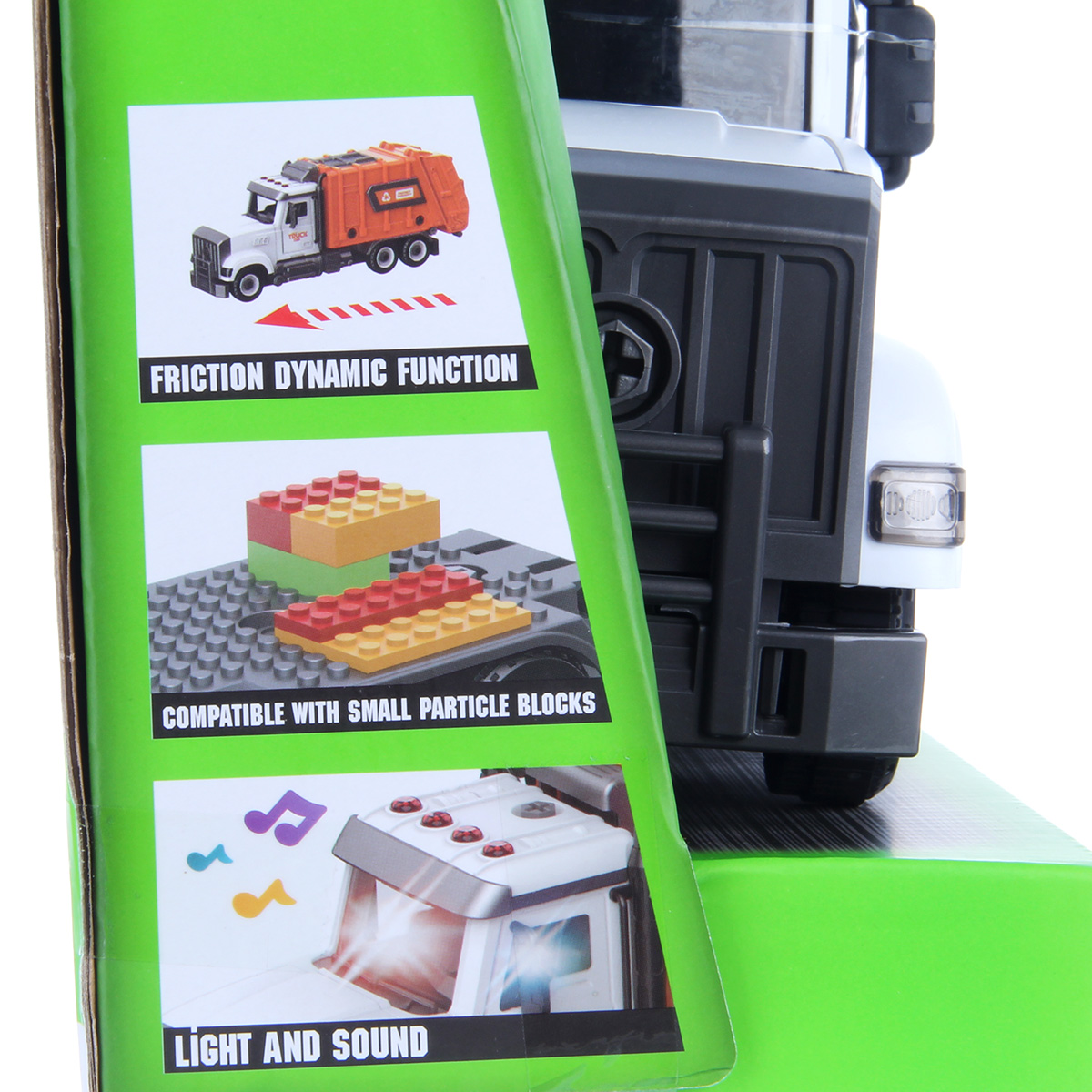 Полностью разборный конструктор скрутка мусоровоз со световыми и звуковыми эффектами. Машина издает звуки заднего хода, гудка, двигателя, проигрывает мелодию, разноцветная подсветка кабины. Движение вперёд и назад, фрикционный механизм, открывающиеся дверцы кабины, задний борт поднимается и опускается, крышка мусоросборника поднимается, площадка машинки подходит для сборки на ней фигурок из классического лего. Есть специальный механизм для перемещения мусорного бака, при вращении рычага стрела механизма поднимается и опускается, можно прикрепить мусорный бак. В наборе отвертка со сменными насадками, можно вкручивать болты, мусорный бак с открывающейся крышкой. Игрушечный мусоровоз изготовлен из прочных и безопасных материалов в качественном исполнении с вниманием к деталям.