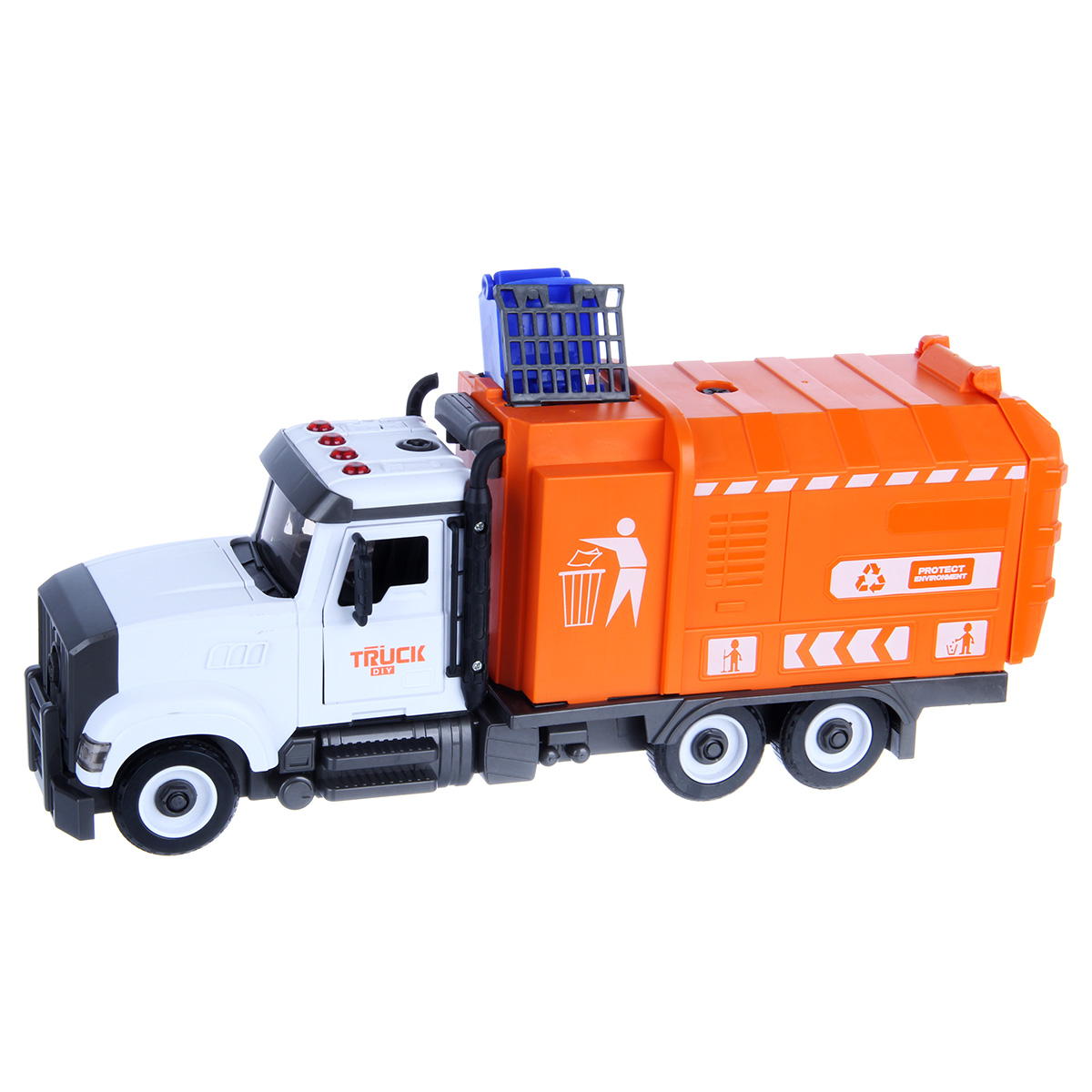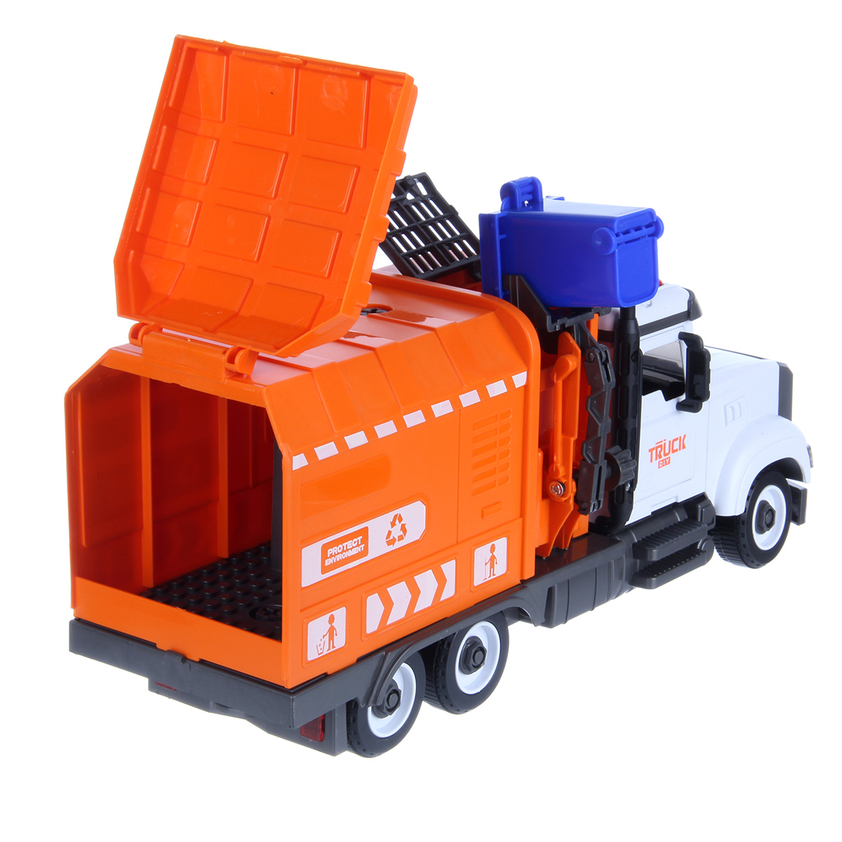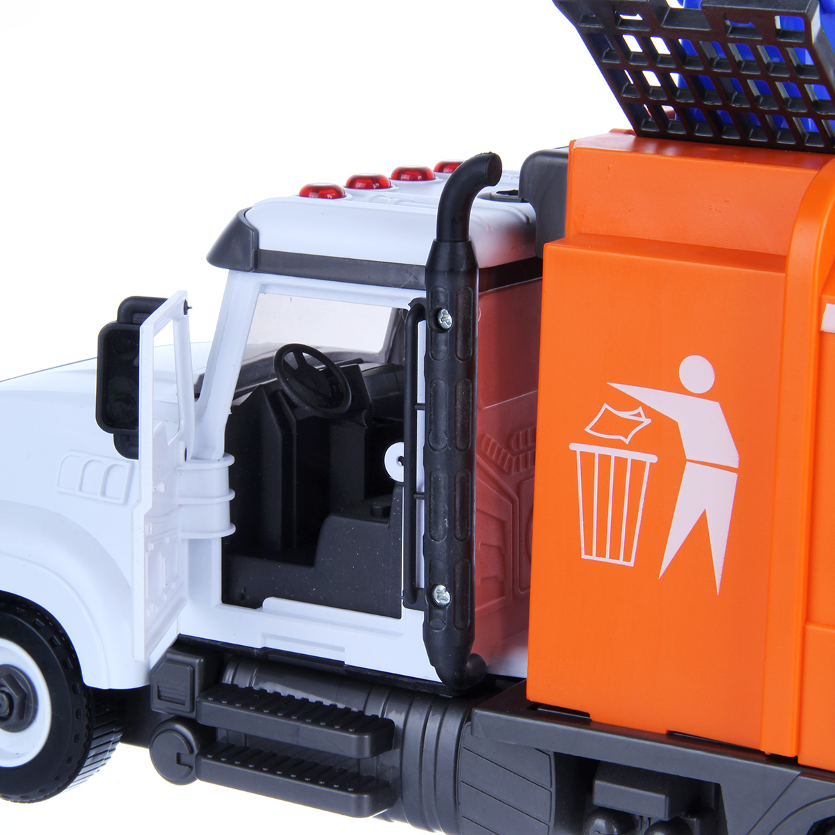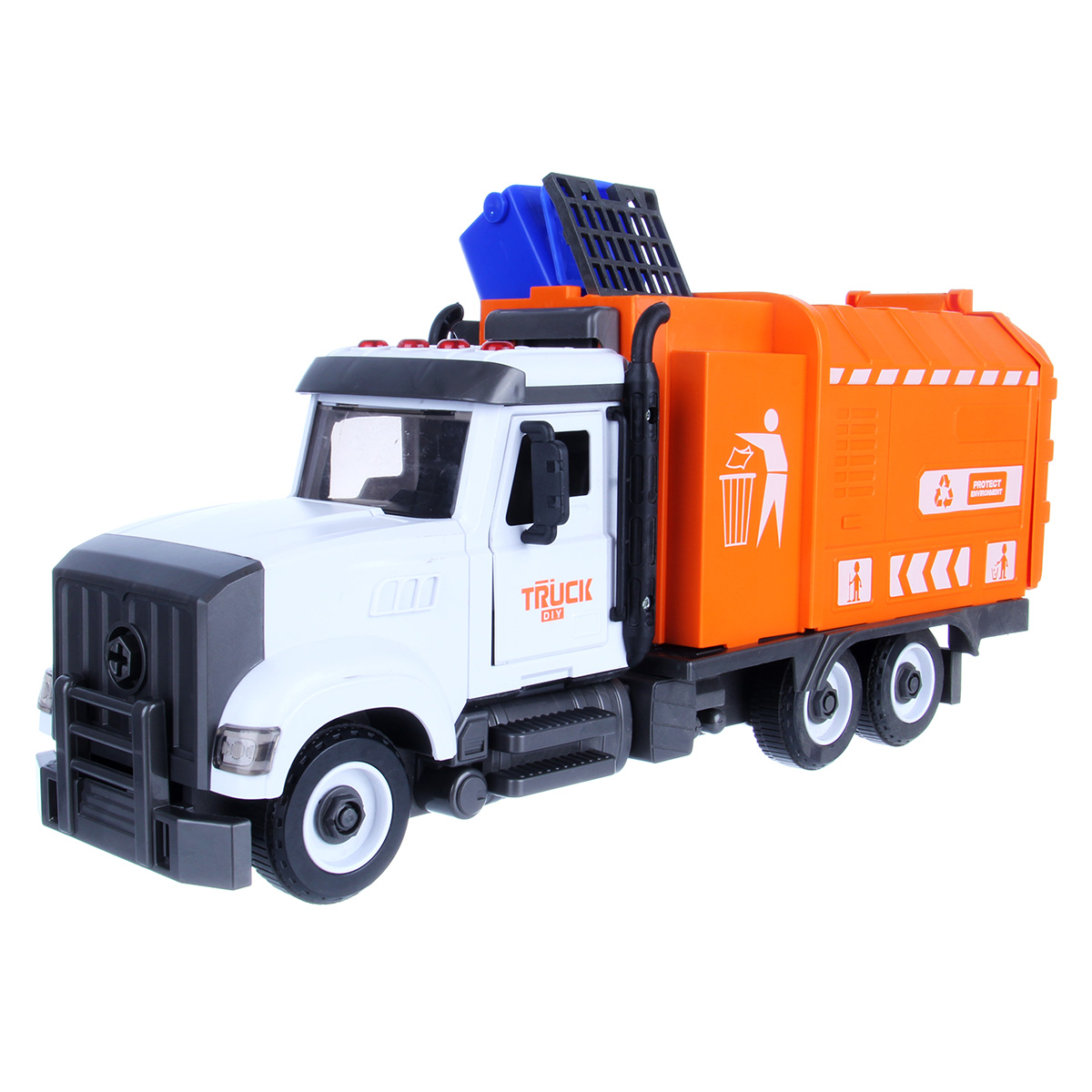 Полностью разборный конструктор скрутка мусоровоз со световыми и звуковыми эффектами. Машина издает звуки заднего хода, гудка, двигателя, проигрывает мелодию, разноцветная подсветка кабины. Движение вперёд и назад, фрикционный механизм, открывающиеся дверцы кабины, задний борт поднимается и опускается, крышка мусоросборника поднимается, площадка машинки подходит для сборки на ней фигурок из классического лего. Есть специальный механизм для перемещения мусорного бака, при вращении рычага стрела механизма поднимается и опускается, можно прикрепить мусорный бак. В наборе отвертка со сменными насадками, можно вкручивать болты, мусорный бак с открывающейся крышкой. Игрушечный мусоровоз изготовлен из прочных и безопасных материалов в качественном исполнении с вниманием к деталям.