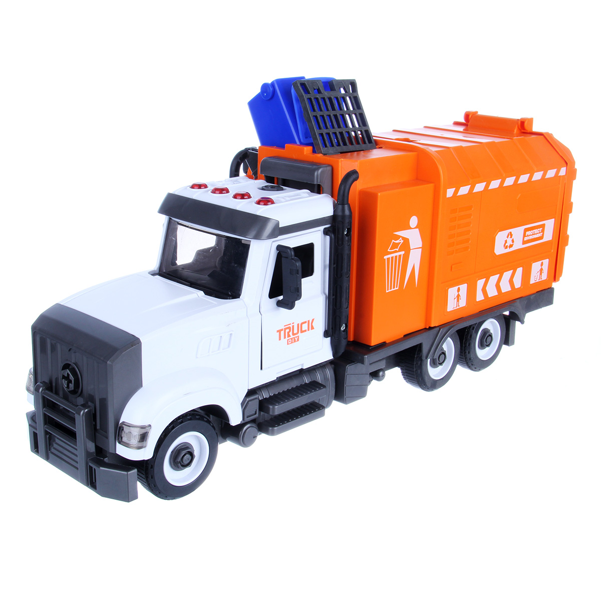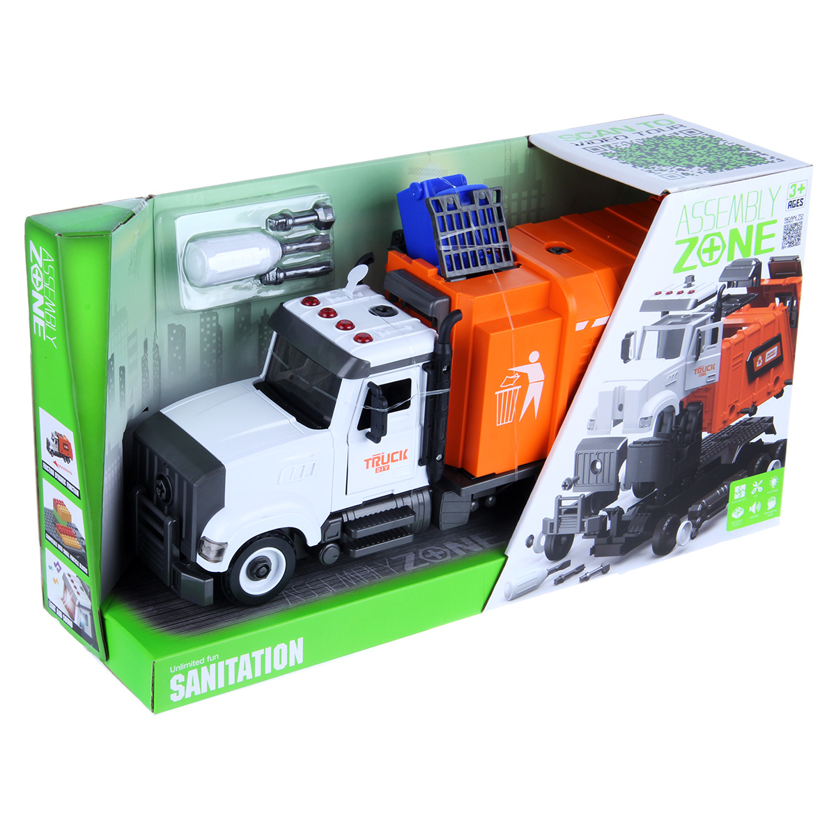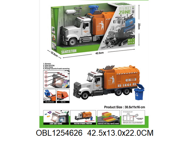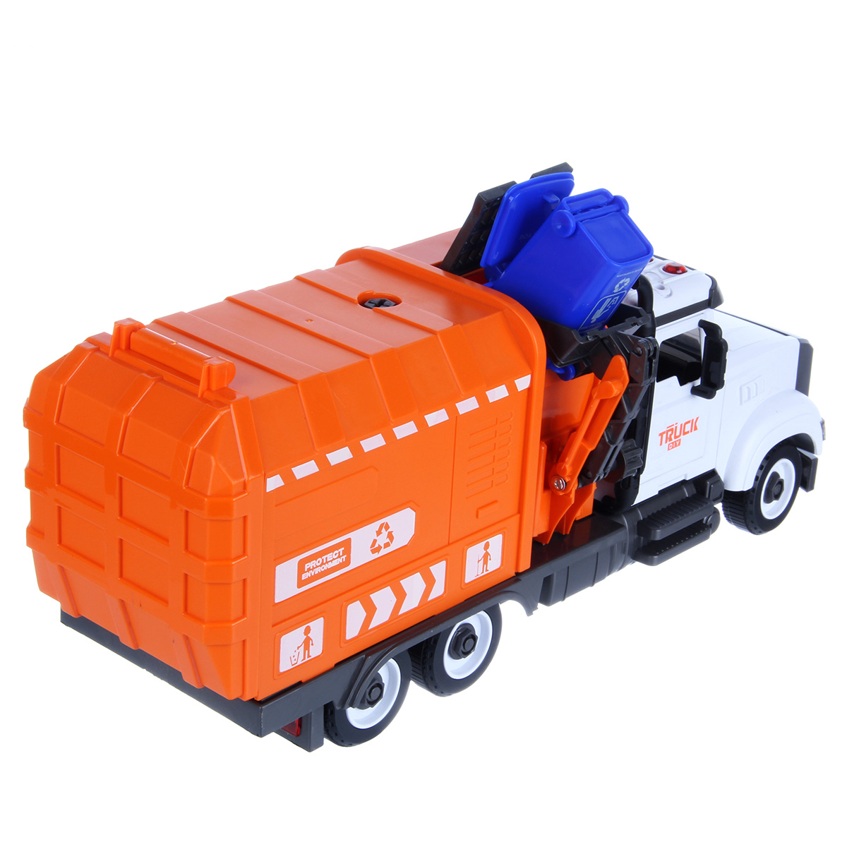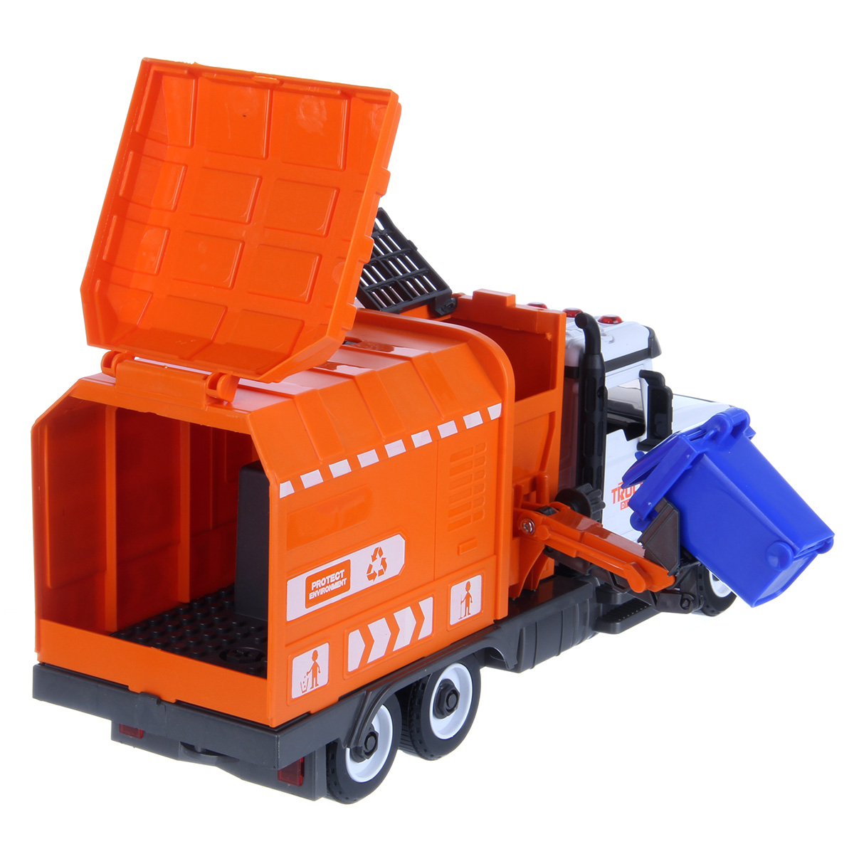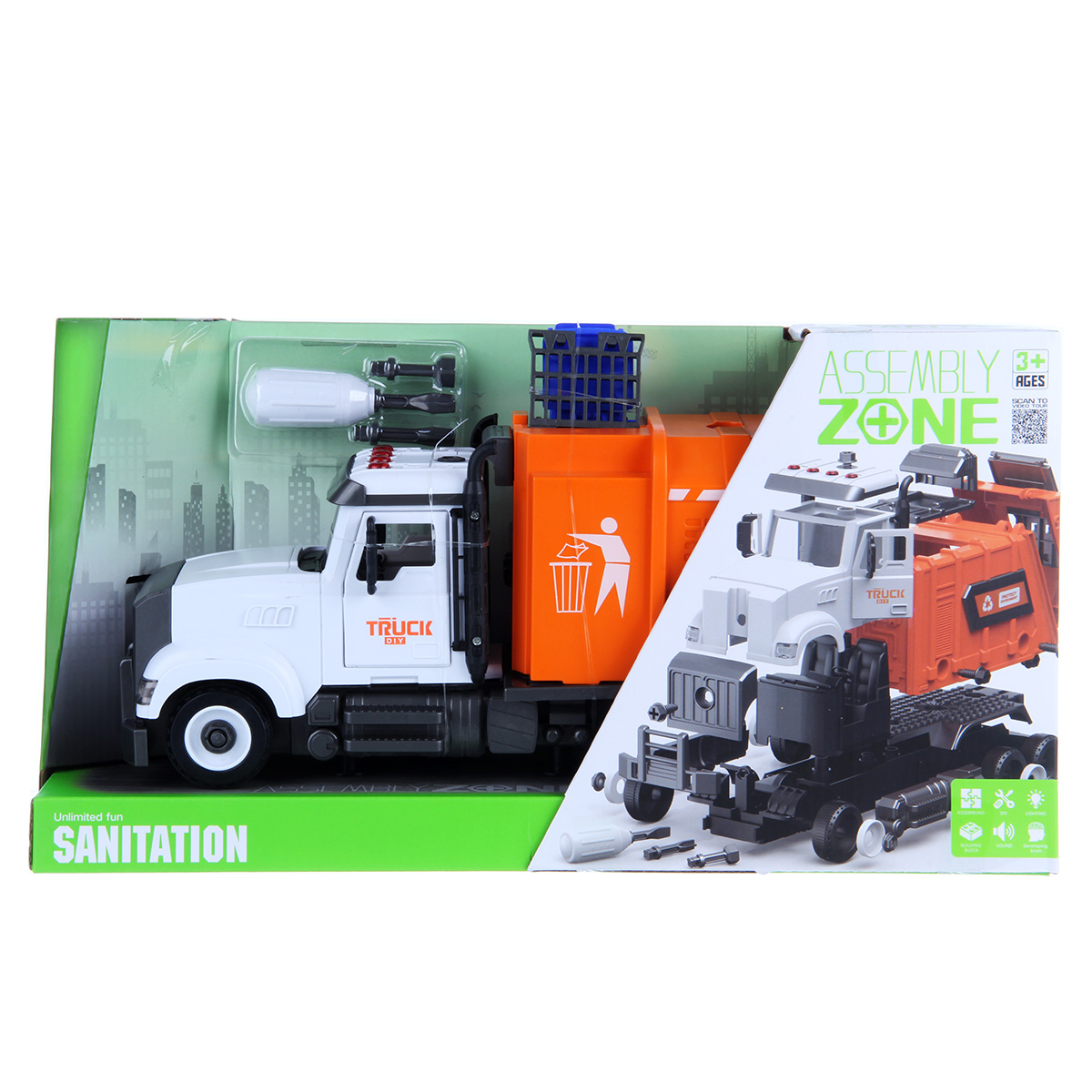 Полностью разборный конструктор скрутка мусоровоз со световыми и звуковыми эффектами. Машина издает звуки заднего хода, гудка, двигателя, проигрывает мелодию, разноцветная подсветка кабины. Движение вперёд и назад, фрикционный механизм, открывающиеся дверцы кабины, задний борт поднимается и опускается, крышка мусоросборника поднимается, площадка машинки подходит для сборки на ней фигурок из классического лего. Есть специальный механизм для перемещения мусорного бака, при вращении рычага стрела механизма поднимается и опускается, можно прикрепить мусорный бак. В наборе отвертка со сменными насадками, можно вкручивать болты, мусорный бак с открывающейся крышкой. Игрушечный мусоровоз изготовлен из прочных и безопасных материалов в качественном исполнении с вниманием к деталям.
