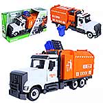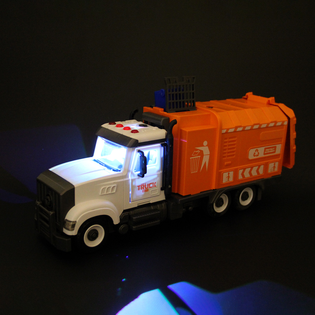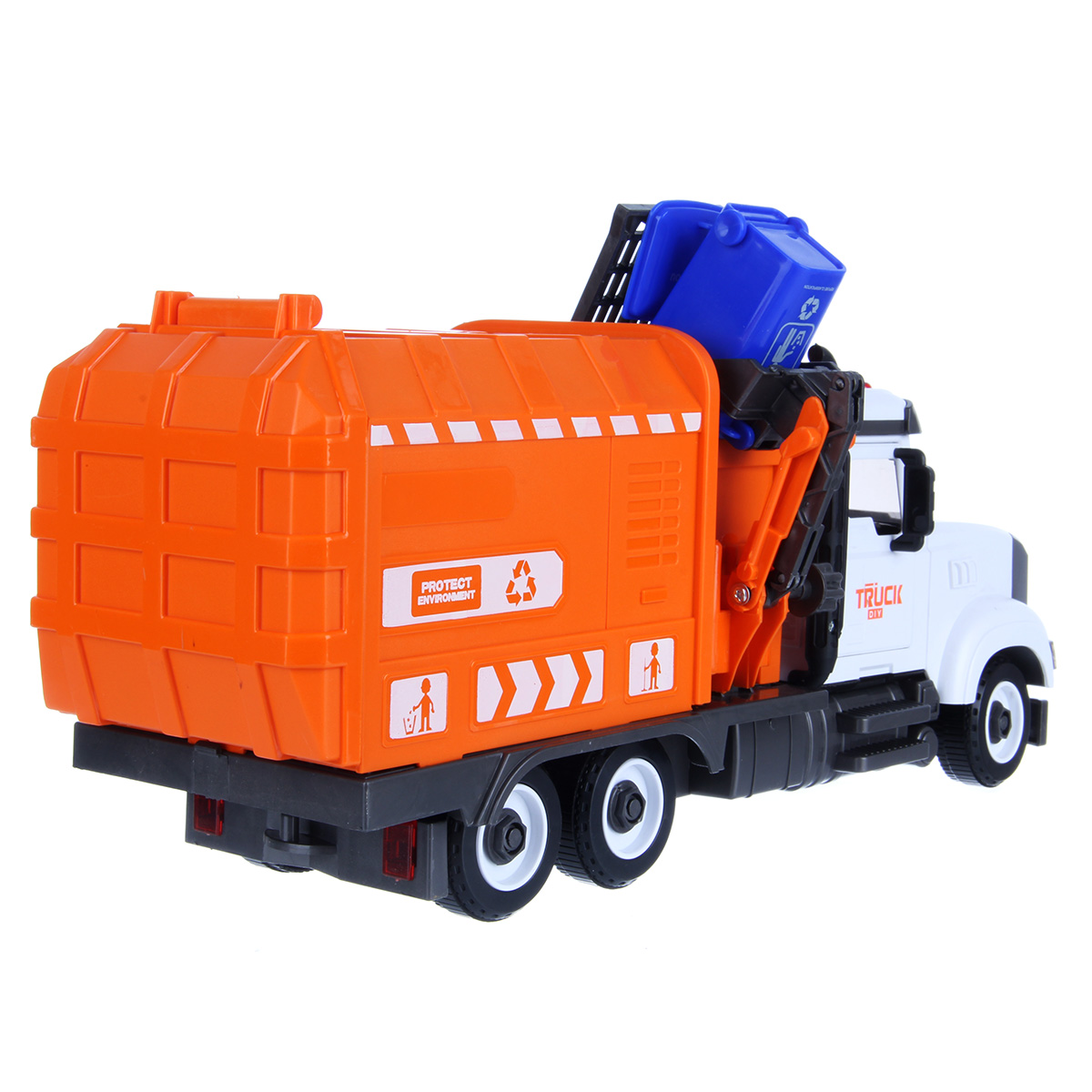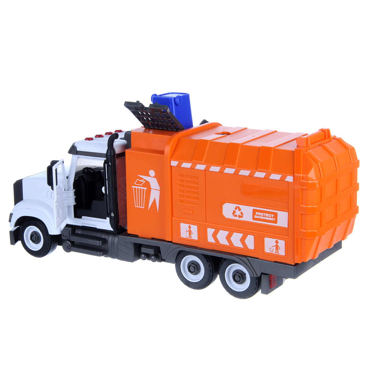 1. Катается вперёд и назад, фрикционный механизм, дверцы кабины открываются. При нажатии на кнопки на крыше кабины издает звуки заднего хода, гудка, двигателя, проигрывает мелодию, разноцветная подсветка кабины. Площадка машинки подходит для сборки на ней фигурок из классического лего. Задний борт поднимается и опускается. На крыше мусоровоза открывается крышка мусоросборника, туда можно поместить мусорный бак.