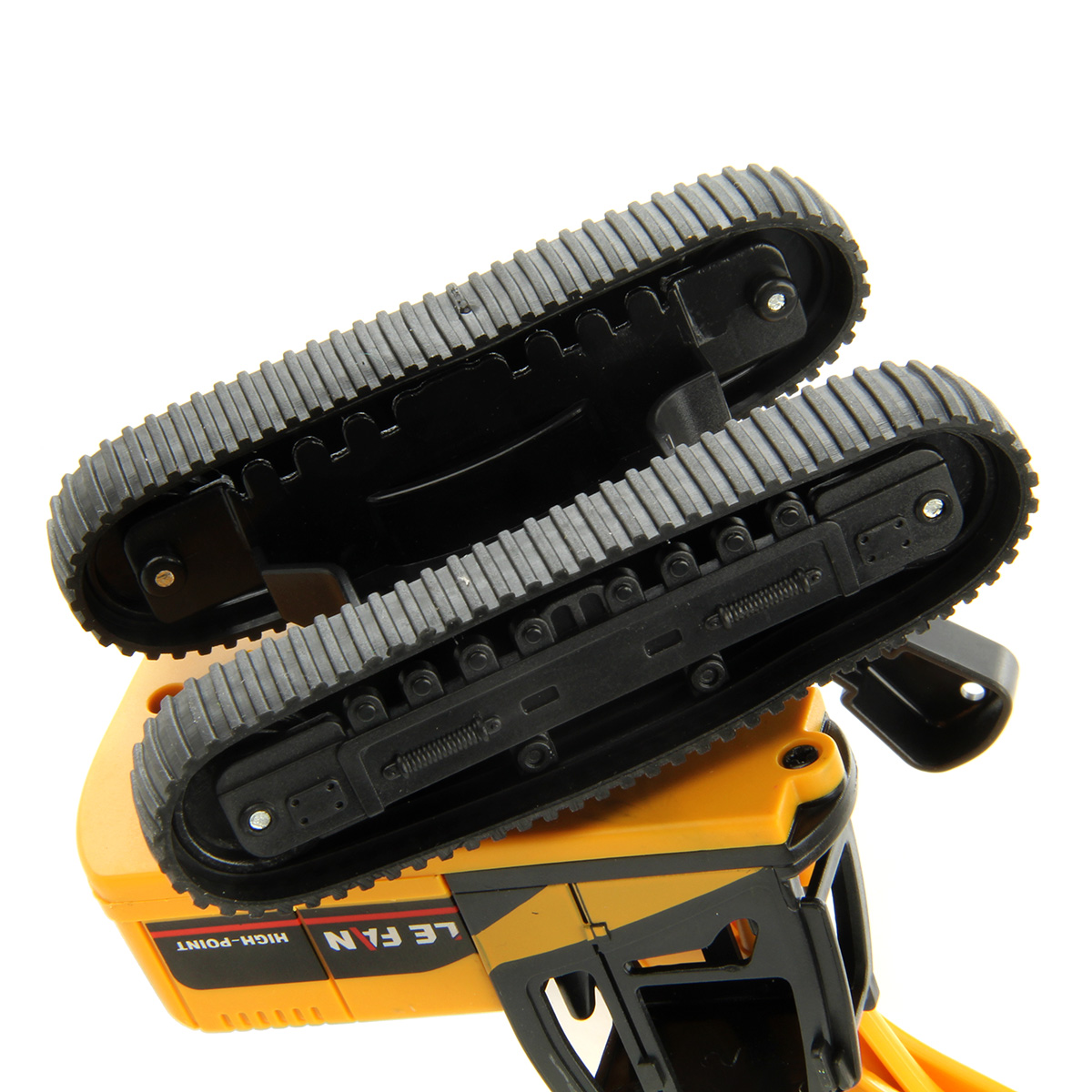 Гусеничный экскаватор катается вперед и назад, гусеницы прорезинены, снимаются. Кабина крутится в обе стороны на 360 градусов с потрескивающим звуком. Стрела поднимается, опускается и складывается вручную и с помощью рычага.