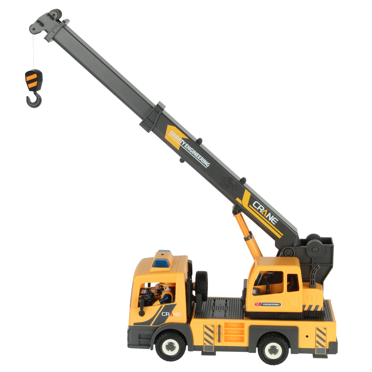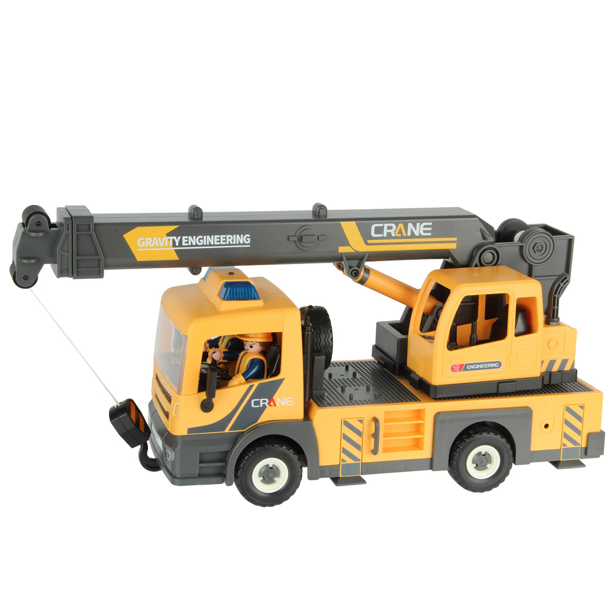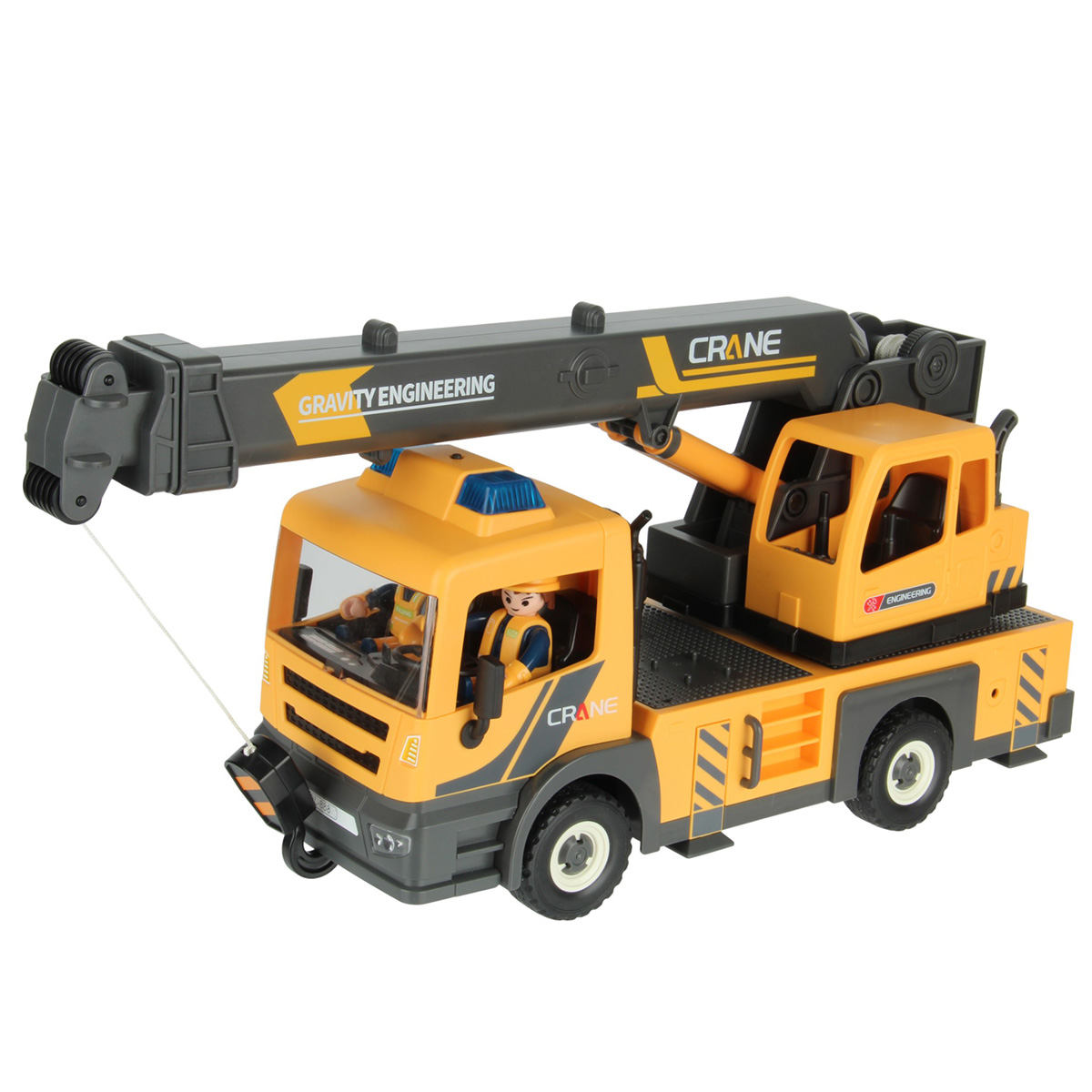 3. Кабина крановщика со стрелой и катушкой вращается на 360 градусов вручную. Стрела с крюком выдвигается, вращение рычага на катушке опускает и поднимает веревку с крюком.