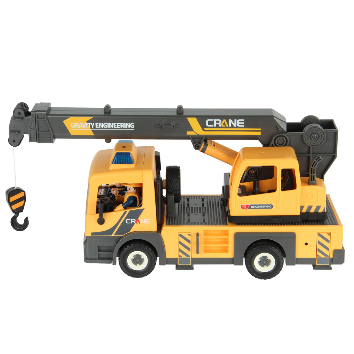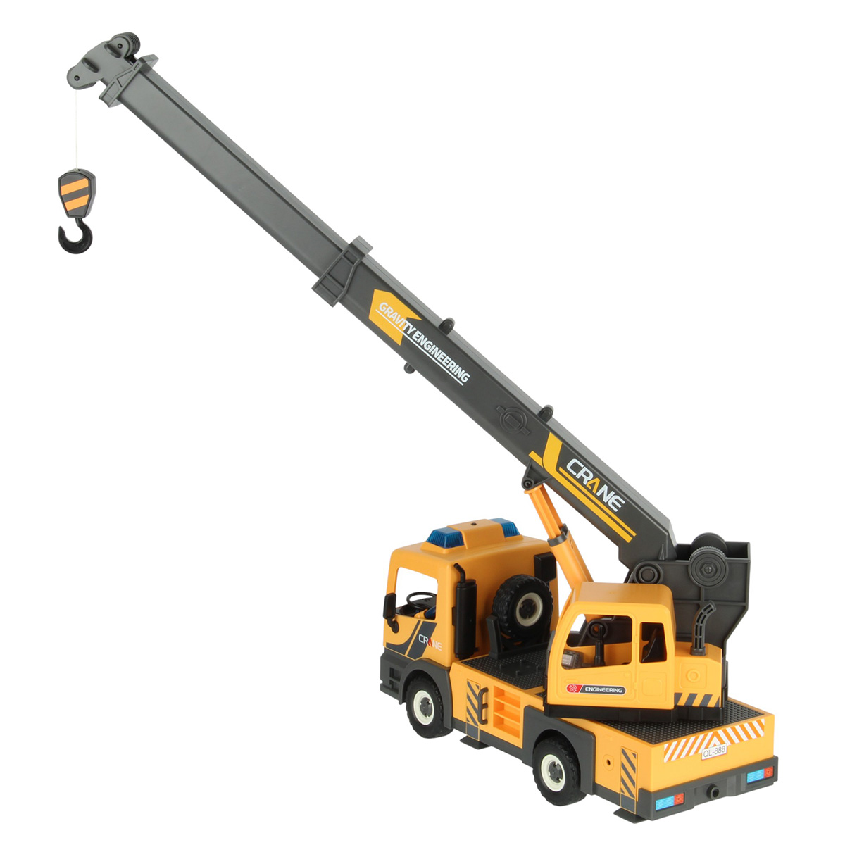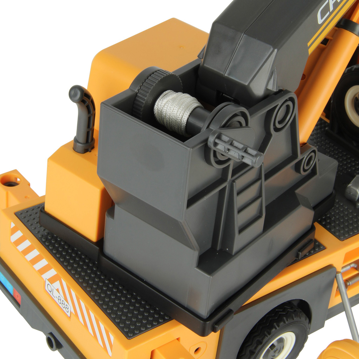 3. Кабина крановщика со стрелой и катушкой вращается на 360 градусов вручную. Стрела с крюком выдвигается, вращение рычага на катушке опускает и поднимает веревку с крюком.