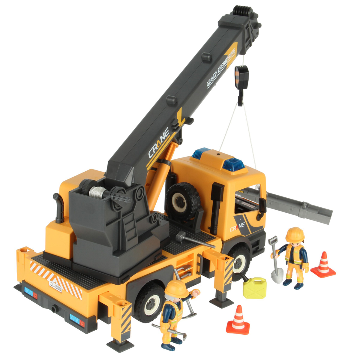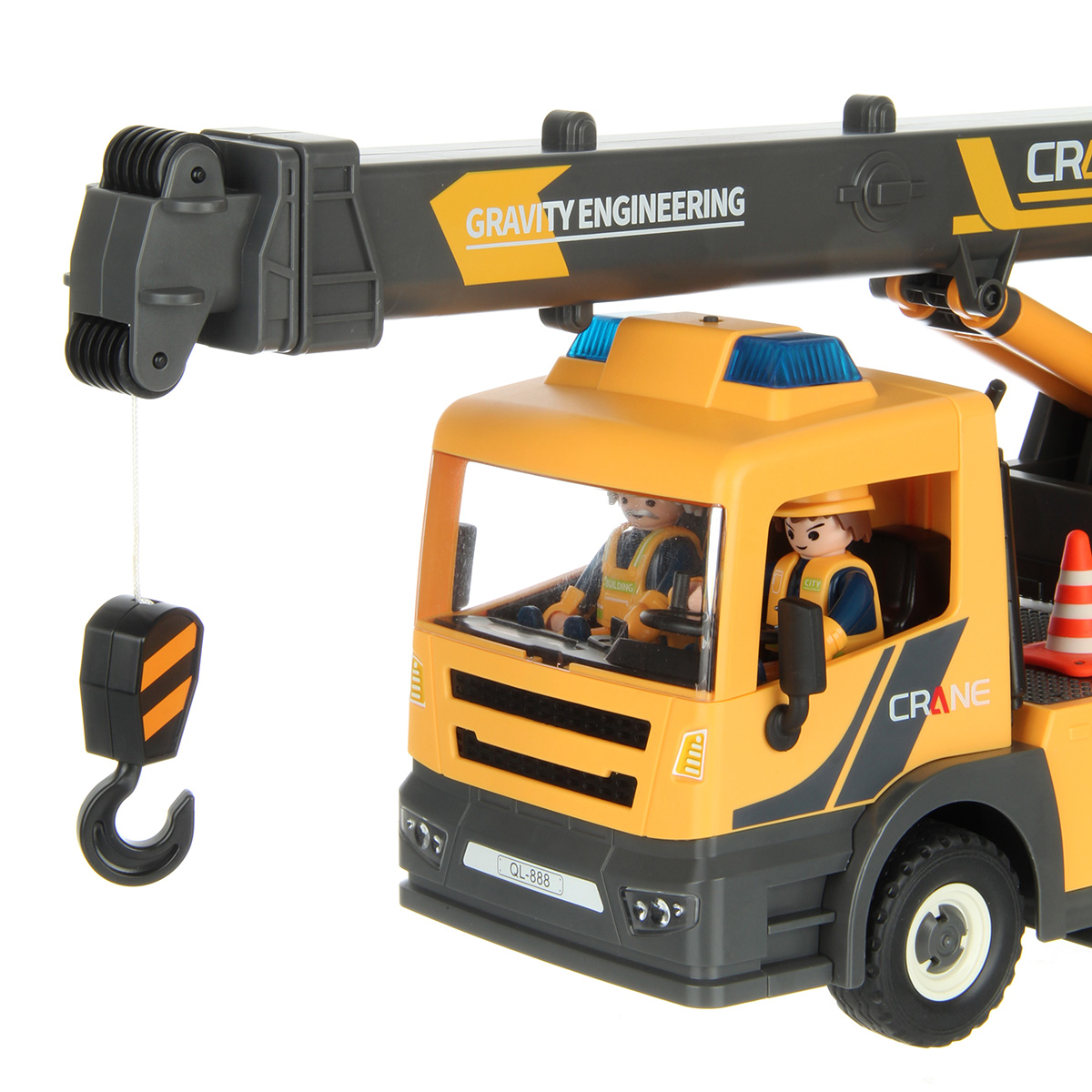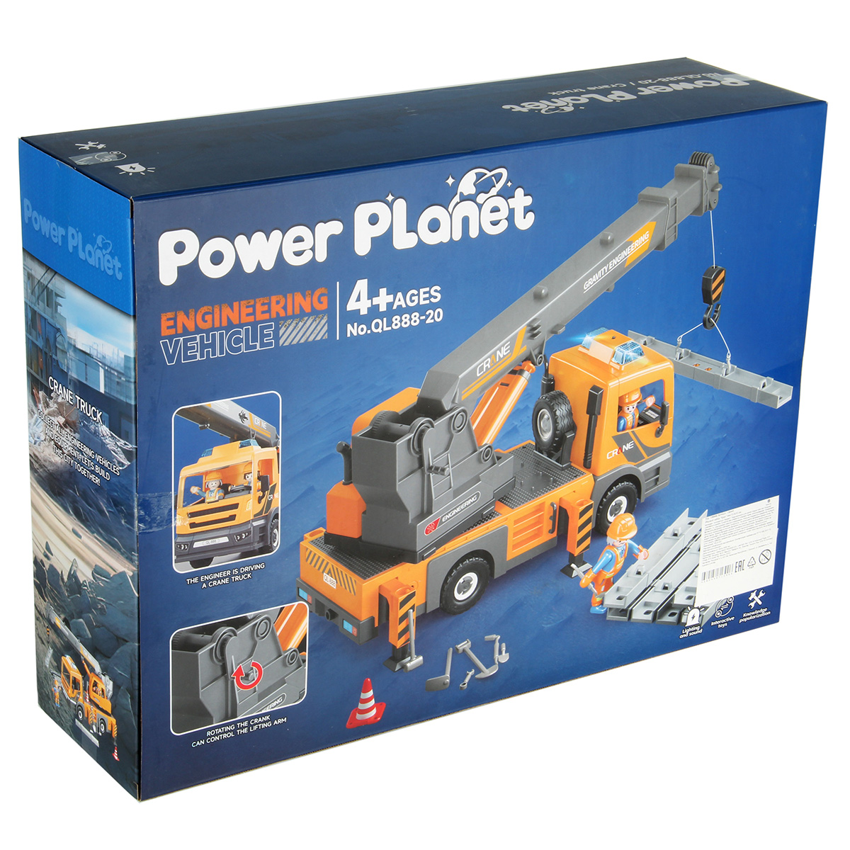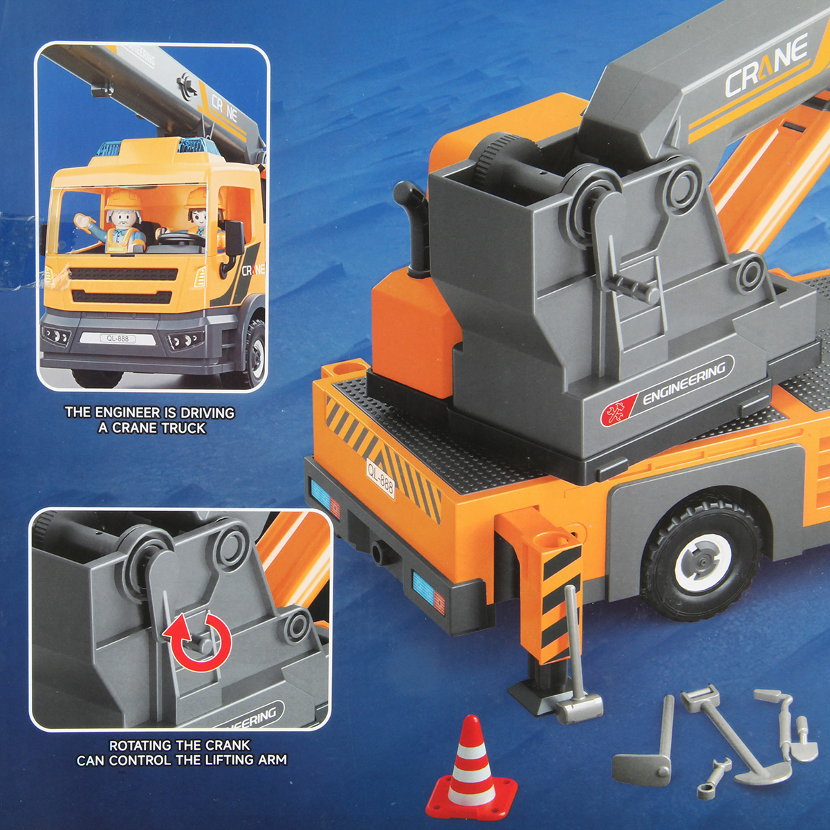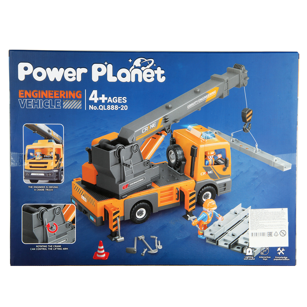 Конструктор строительная машинка кран с подсветкой, звуковыми эффектами, выдвижной стрелой, веревкой с крюком и множеством аксессуаров. Машина катается вперёд и назад, прорезиненные колёса и боковые зеркала, мигающая подсветка проблесковых маячков на крыше, звук заводящегося мотора, кабина крановщика вращается на 360 градусов вручную, выдвижные аутригеры. Веревку для крепления можно закрепить на специальных крепежах на строительных балках, веревку закрепить на крюке строительного крана и перемещать строительные балки. У фигурок строителей двигаются руки и ноги, головы крутятся. В руки строителей можно вложить строительные инструменты. Игровой набор изготовлен из прочных и безопасных материалов в качественном исполнении с вниманием к деталям.
