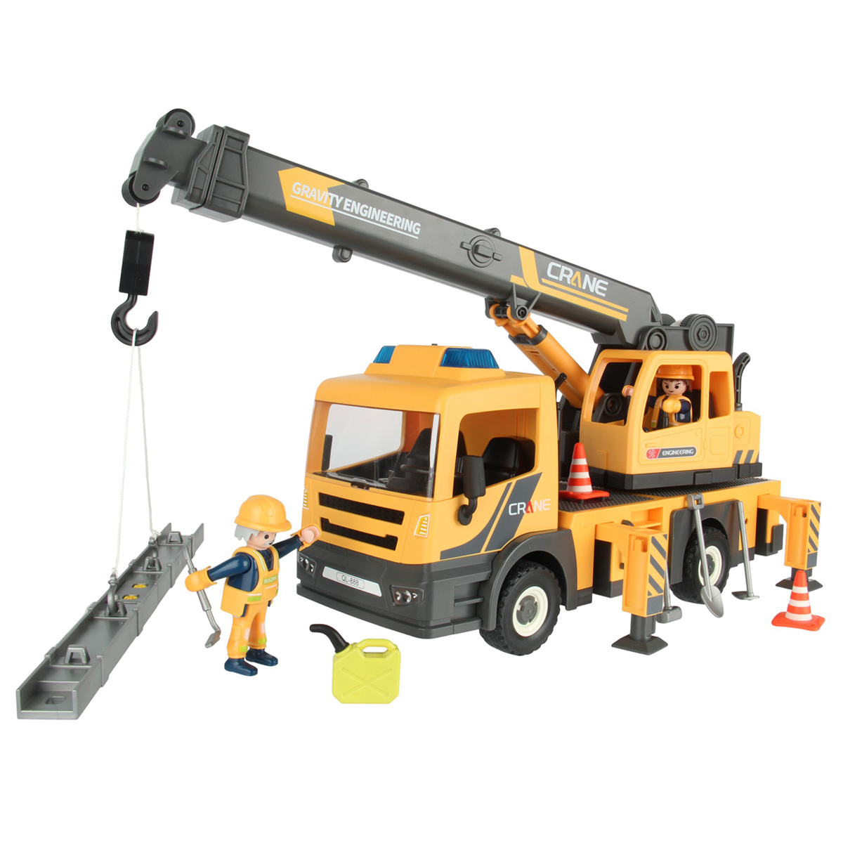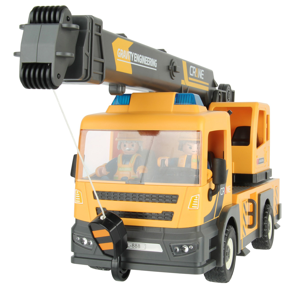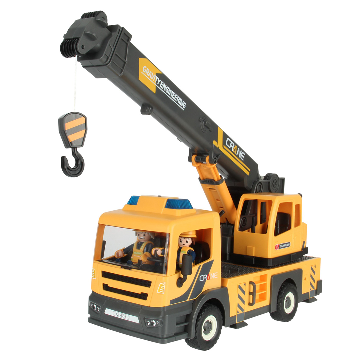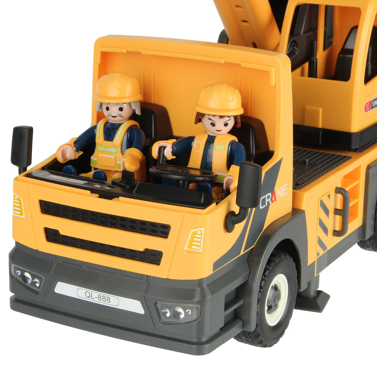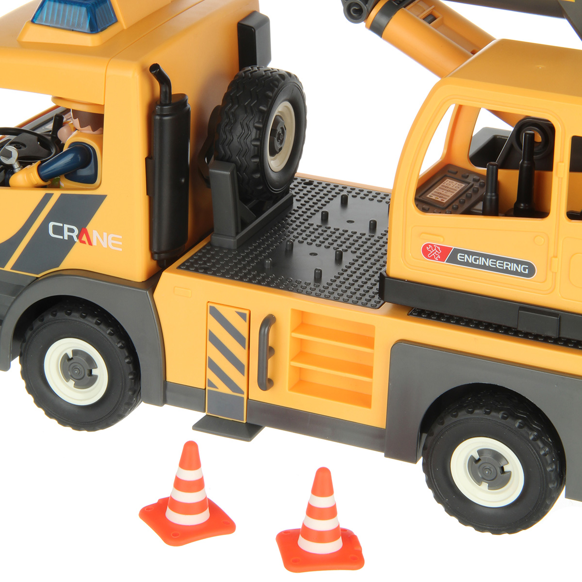 Конструктор строительная машинка кран с подсветкой, звуковыми эффектами, выдвижной стрелой, веревкой с крюком и множеством аксессуаров. Машина катается вперёд и назад, прорезиненные колёса и боковые зеркала, мигающая подсветка проблесковых маячков на крыше, звук заводящегося мотора, кабина крановщика вращается на 360 градусов вручную, выдвижные аутригеры. Веревку для крепления можно закрепить на специальных крепежах на строительных балках, веревку закрепить на крюке строительного крана и перемещать строительные балки. У фигурок строителей двигаются руки и ноги, головы крутятся. В руки строителей можно вложить строительные инструменты. Игровой набор изготовлен из прочных и безопасных материалов в качественном исполнении с вниманием к деталям.