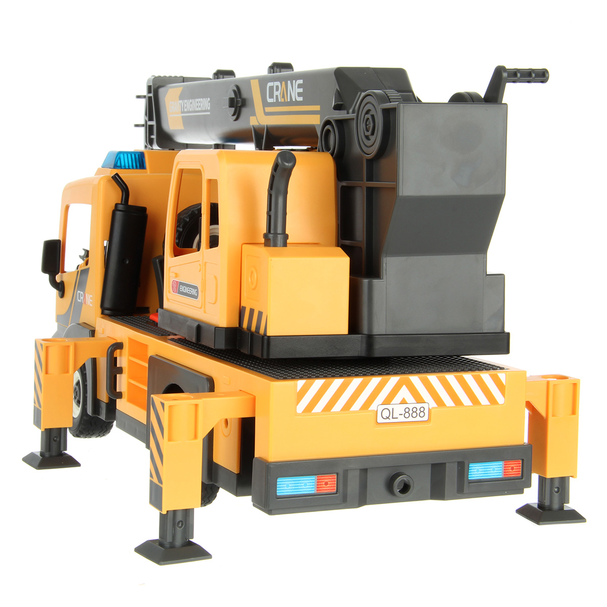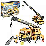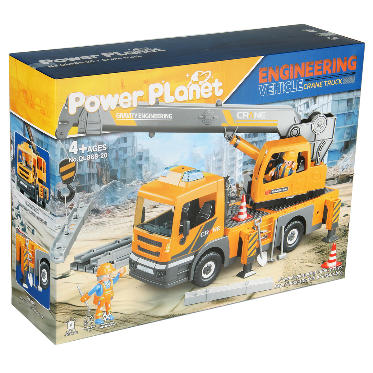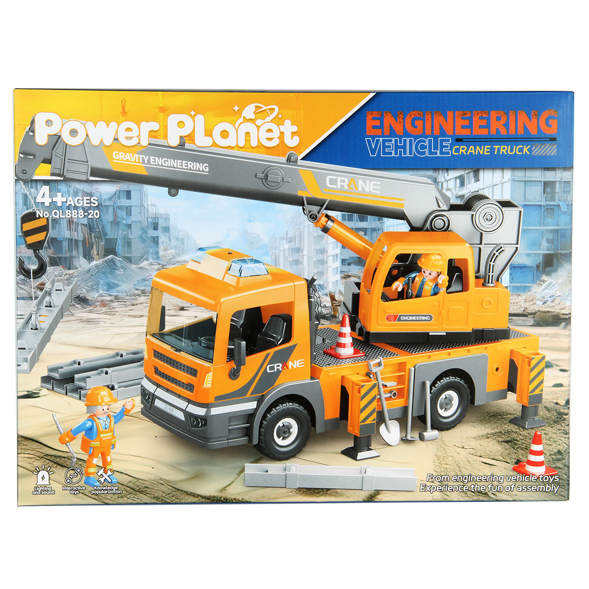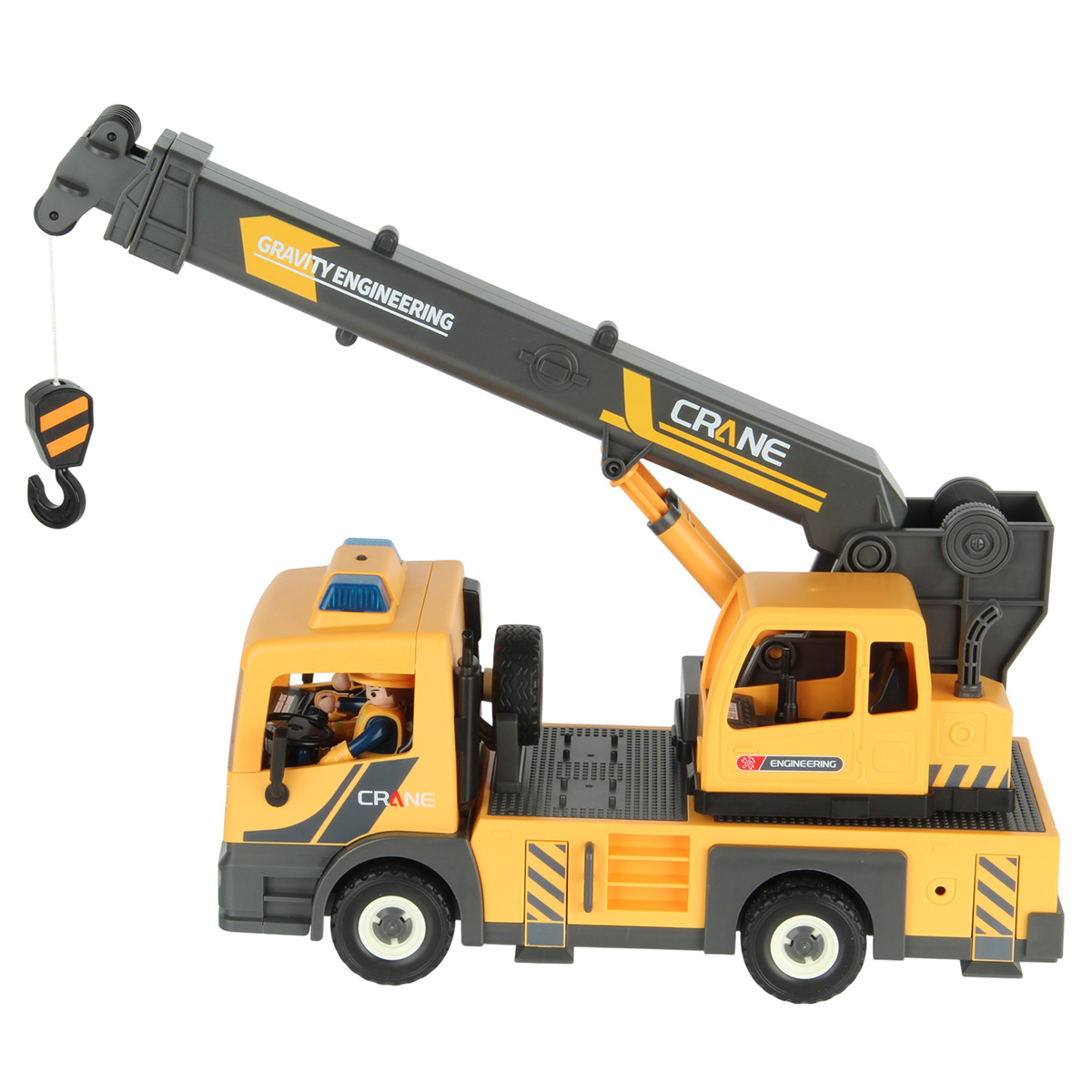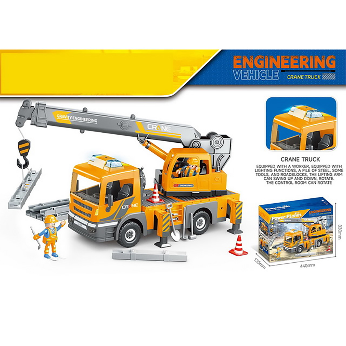 Конструктор строительная машинка кран с подсветкой, звуковыми эффектами, выдвижной стрелой, веревкой с крюком и множеством аксессуаров. Машина катается вперёд и назад, прорезиненные колёса и боковые зеркала, мигающая подсветка проблесковых маячков на крыше, звук заводящегося мотора, кабина крановщика вращается на 360 градусов вручную, выдвижные аутригеры. Веревку для крепления можно закрепить на специальных крепежах на строительных балках, веревку закрепить на крюке строительного крана и перемещать строительные балки. У фигурок строителей двигаются руки и ноги, головы крутятся. В руки строителей можно вложить строительные инструменты. Игровой набор изготовлен из прочных и безопасных материалов в качественном исполнении с вниманием к деталям.