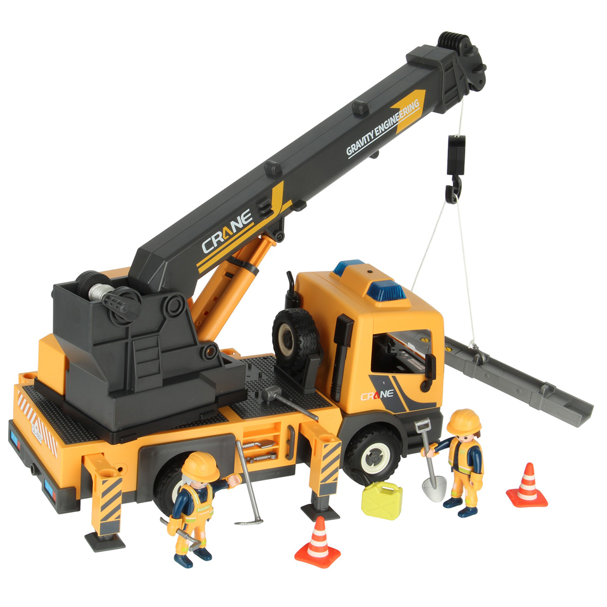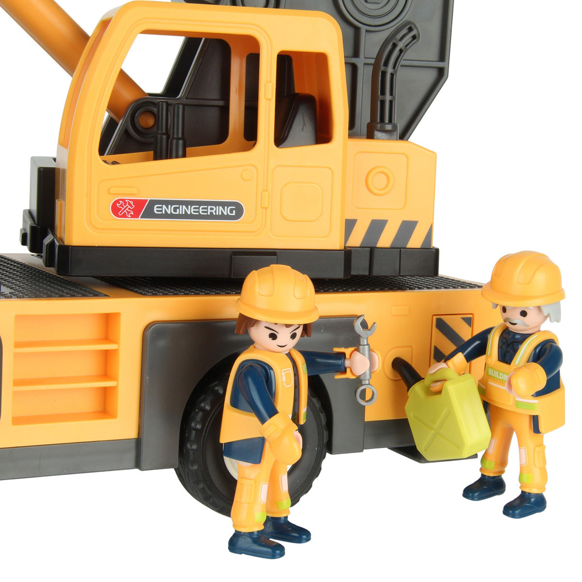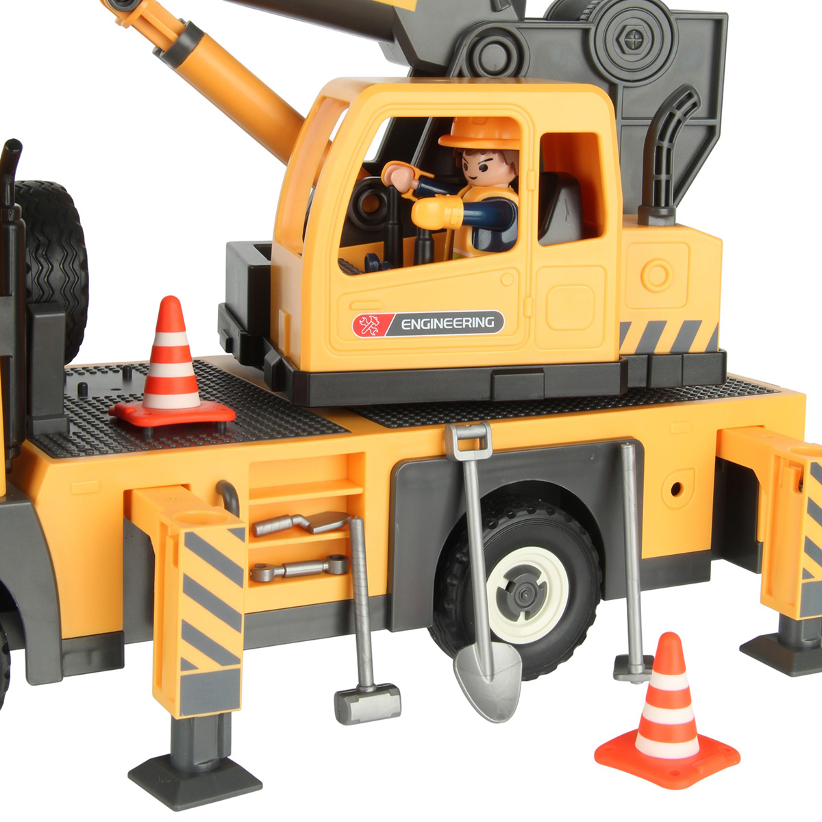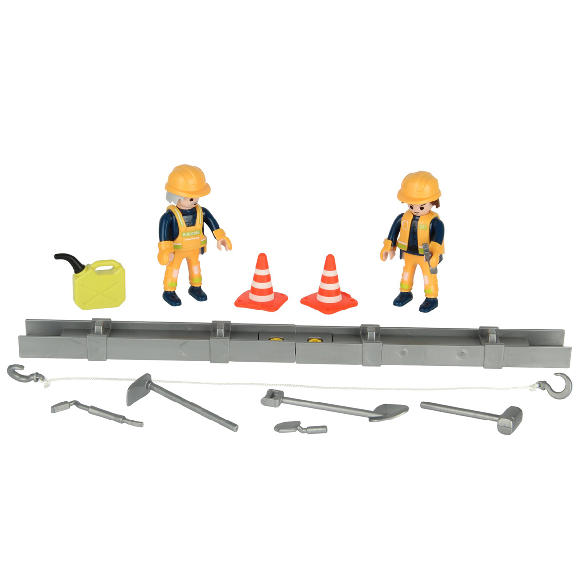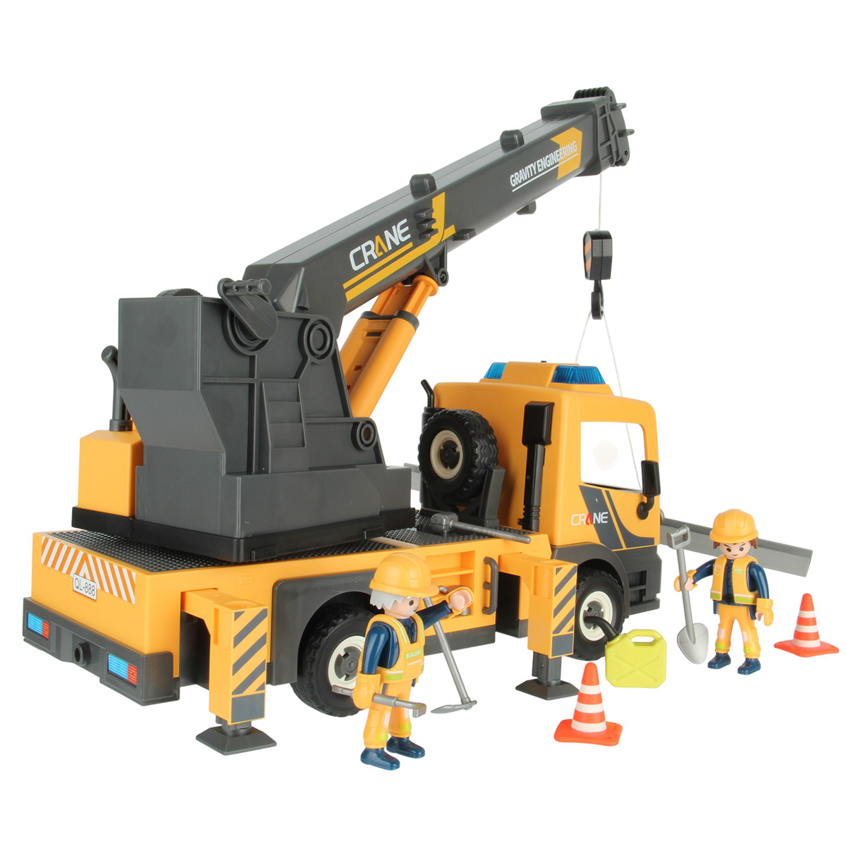 Детали для сборки строительной машинки крана, детали для сборки 2 фигурок строителей, детали для сборки веревки для крепления грузов с 2 крючками, 2 строительные балки, 2 конуса, молоток, 3 лопаты, строительный лом из 2 частей, гаечный ключ, канистра для топлива, набор наклеек, инструкция на английском языке.